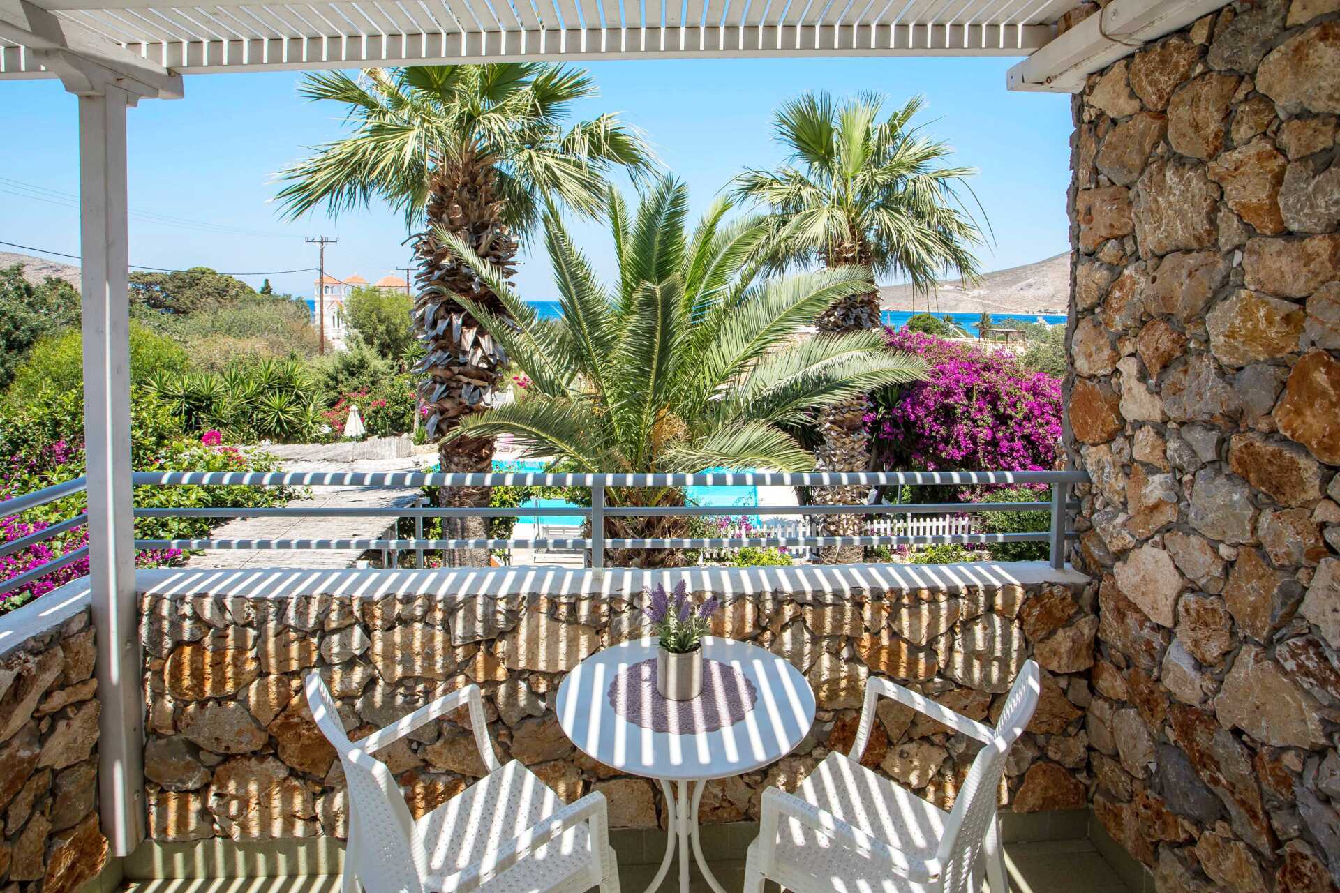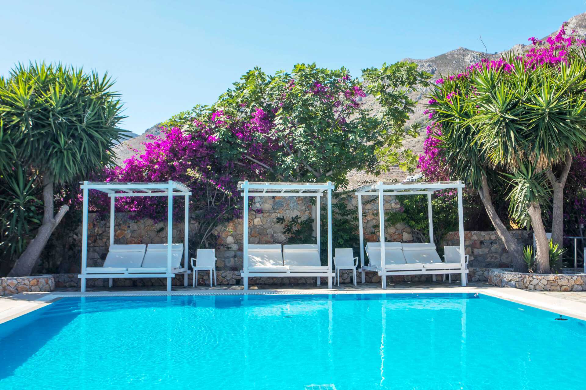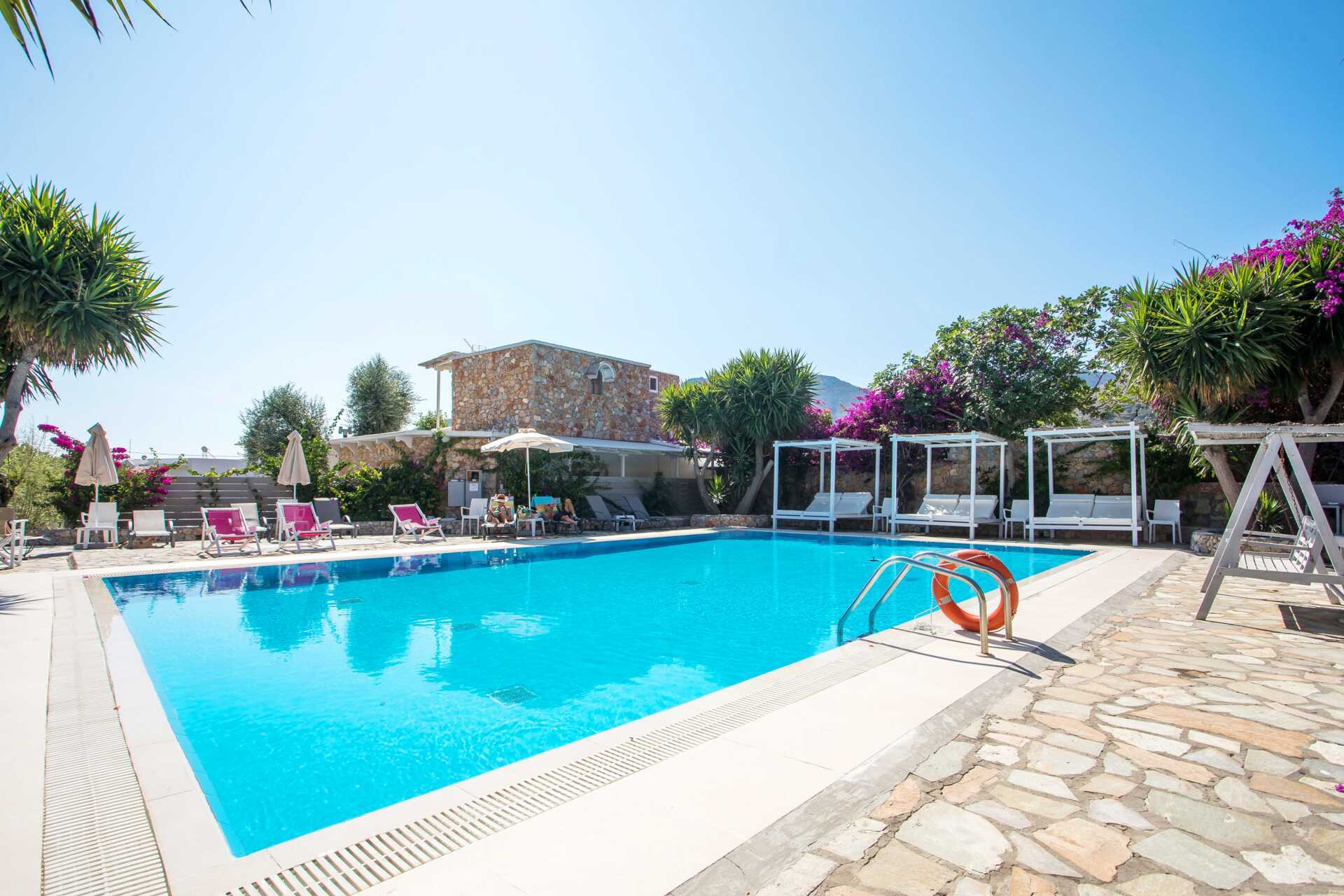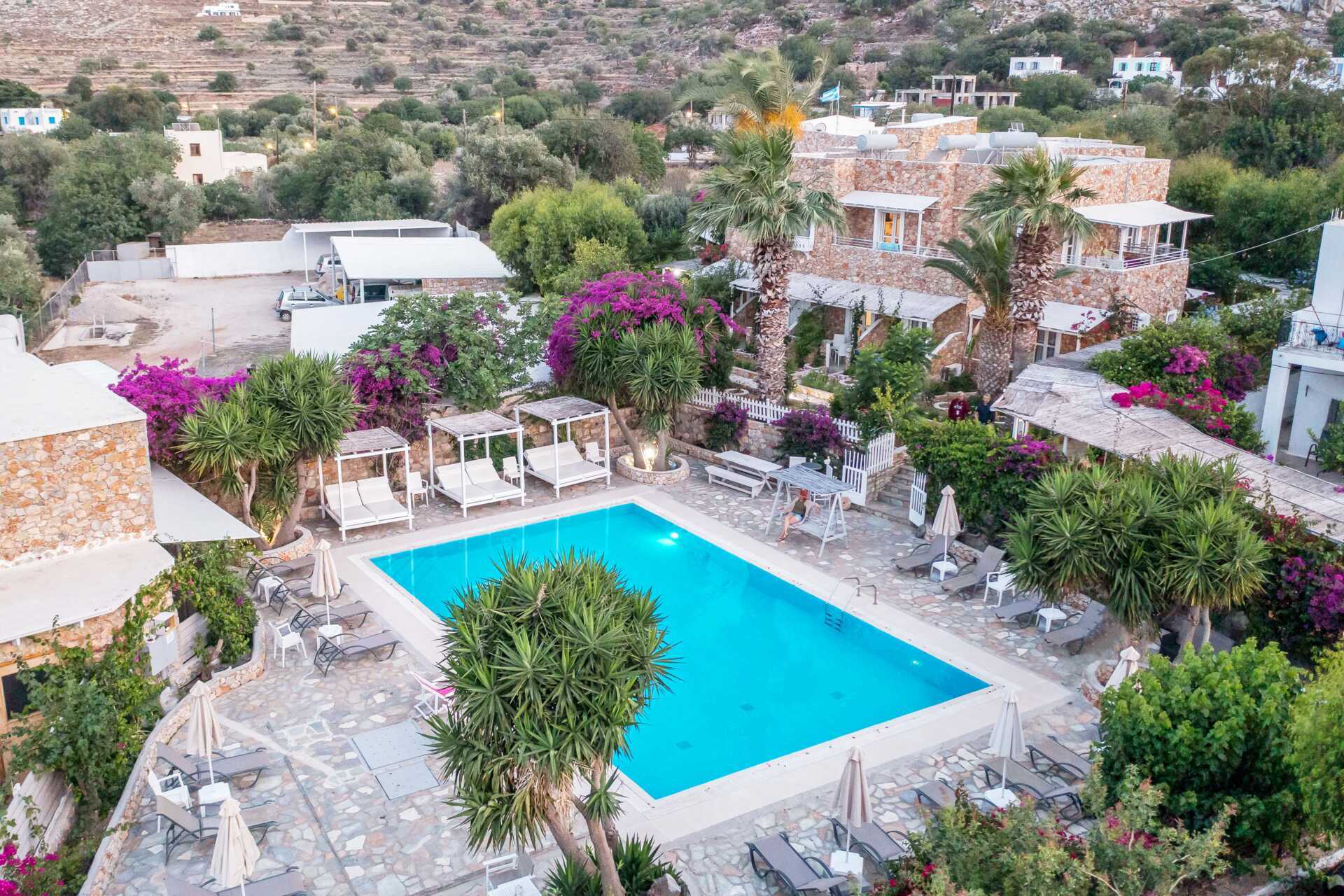 Charmant hotel Irini heeft een klein zwembad in de tuin met ligbedden en parasols om te lenen. Het is een korte wandeling naar het strand. De stranden op Tilos zijn grind- of steenstranden en het water is helder en fijn.