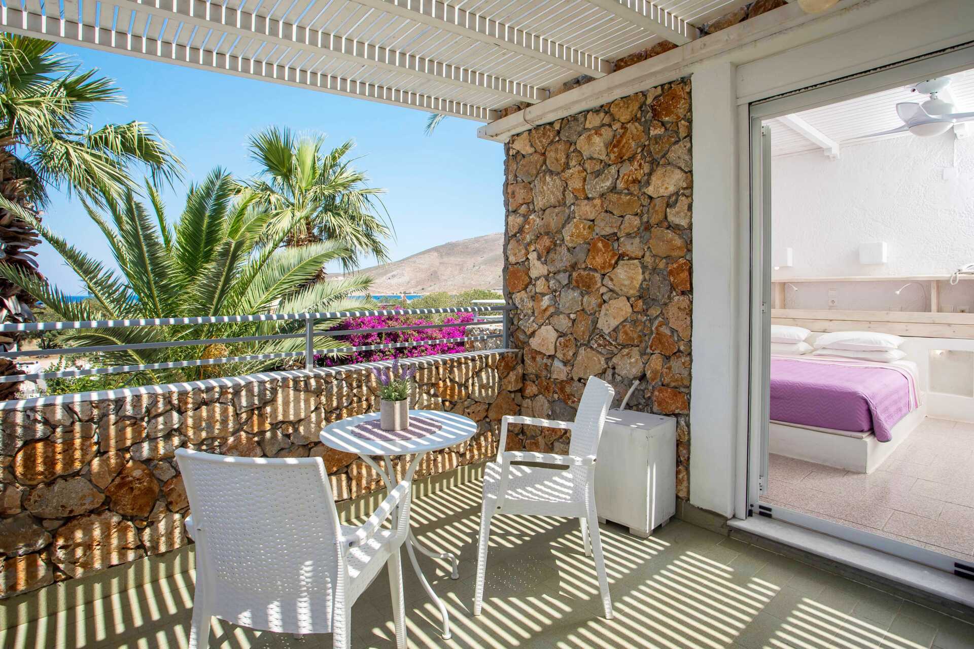 Het hotel ligt aan de rand van ev Livadia, in een natuurgebied met bestemmingsverkeer. Trappen en niveauverschillen zowel binnen het hotelgebied als in de omgeving. Van de haven naar het hotel is het ongeveer 350 meter, de bagage wordt vervoerd.