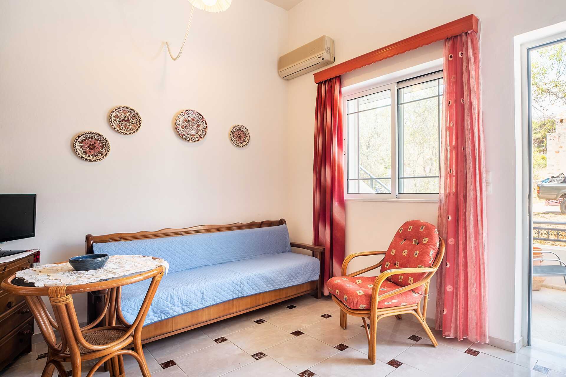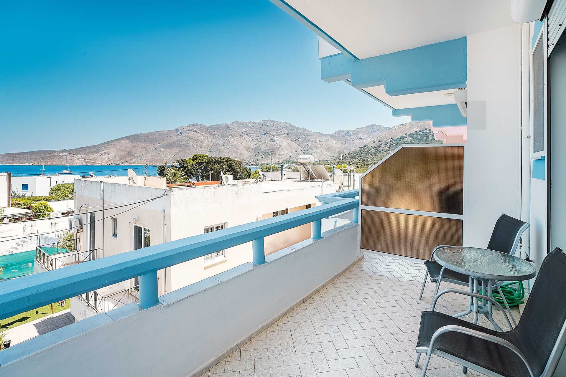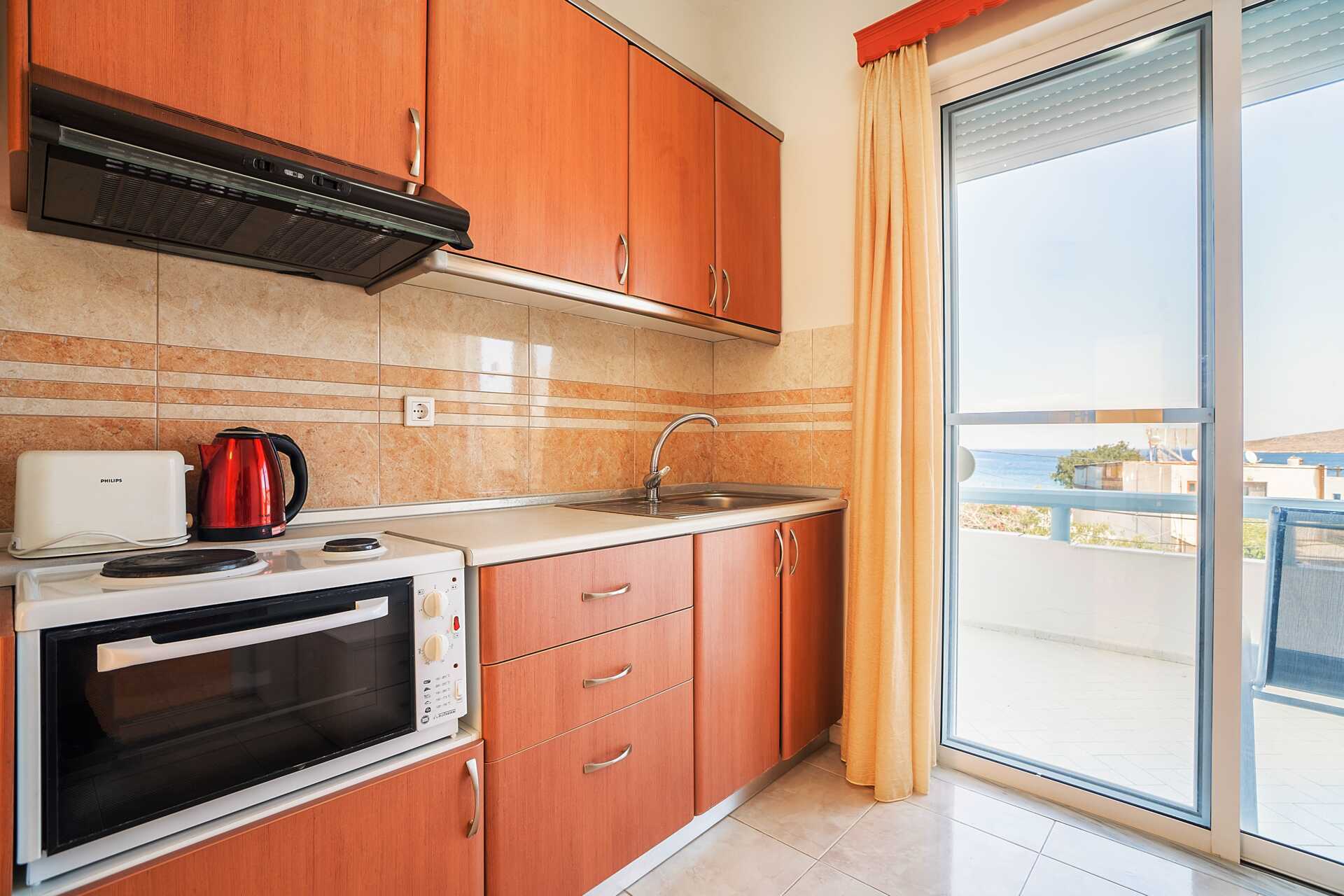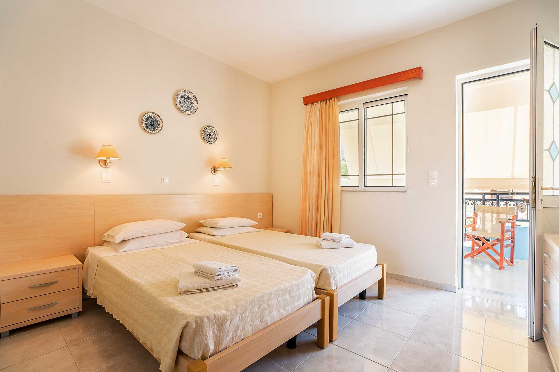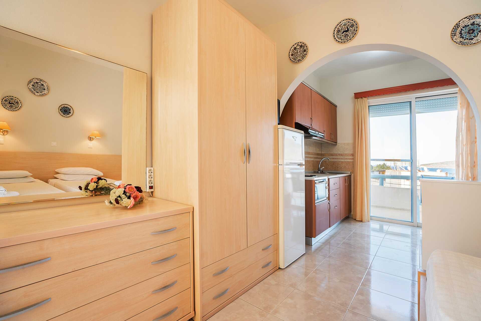 Studio met balkon of grondbalkon. Slaapkamer gecombineerd met kitchenette. Er zijn enkele appartementen met een slaapzolder. Twee eenpersoonsbedden. Mogelijkheid voor een extra bed op de slaapbank. Minikeuken met kookplaten, koelkast, broodrooster, waterkoker en basiskeukengerei. Koffiemachines kunnen op aanvraag worden geleend. Wifi, airconditioning en kluisje inbegrepen. Tv met lokale zenders. Strijkijzer en strijkplank. Föhn. Badkamer met douche en toilet. Schoonmaak 6 keer/week.