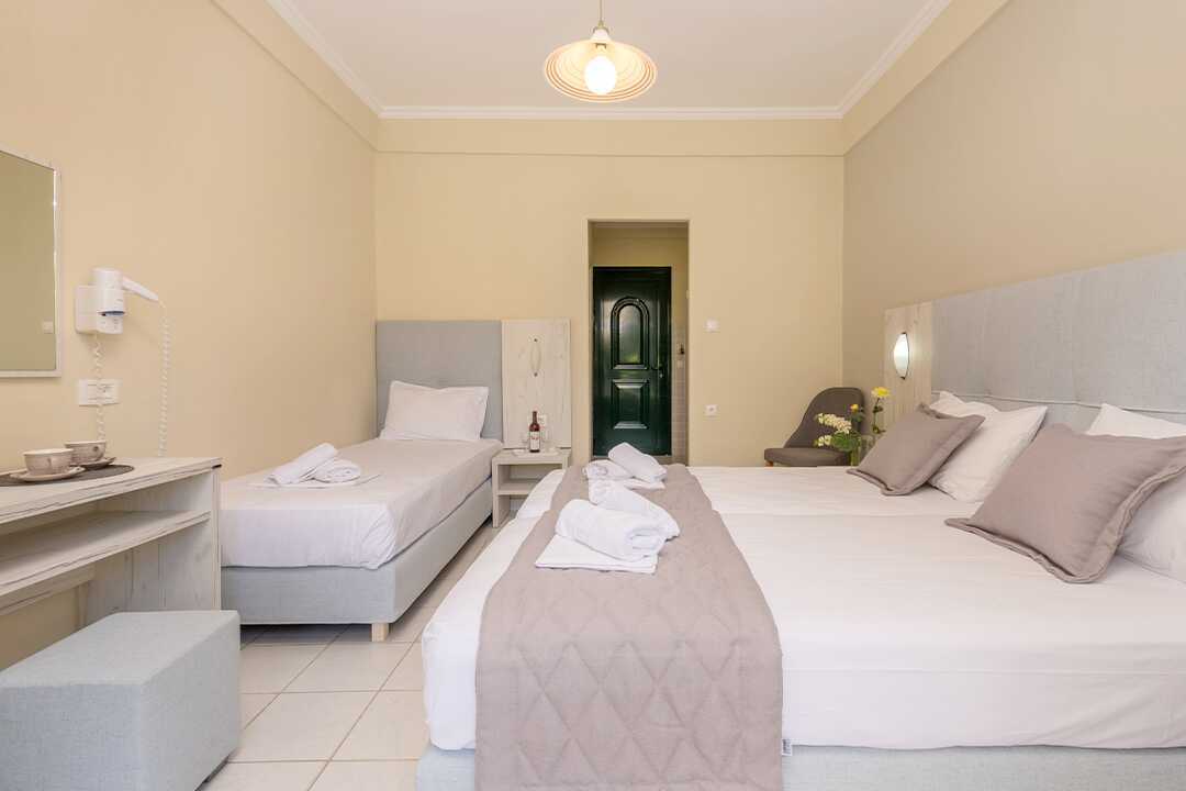 Studio met balkon of verhoogd terras. Slaapkamer gecombineerd met kitchenette. Een tweepersoonsbed of twee eenpersoonsbedden. Mogelijkheid tot een extra bed in de vorm van een opklapbed of een eenpersoonsbed. Wifi inbegrepen. Airconditioning en kluisje tegen betaling. Kitchenette met koelkast, vriezer, kookplaat, waterkoker, tosti-ijzer en basiskeukengerei. Tv met lokale zenders. Föhn. Badkamer met douche en toilet. Schoonmaak 7 keer/week.