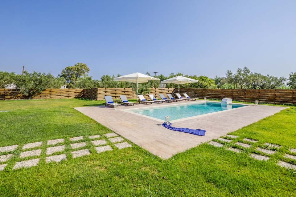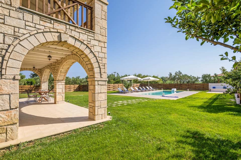 Een schitterende villa met twee verdiepingen, gebouwd van prachtig lokaal natuursteen, op korte loopafstand van het zandstrand en restaurants. Deze villa is een absolute parel, verscholen in een grote tuin met uitzicht op de bergen, maar toch vlakbij het resort Alykes dat alle voorzieningen biedt voor een fantastische vakantie.