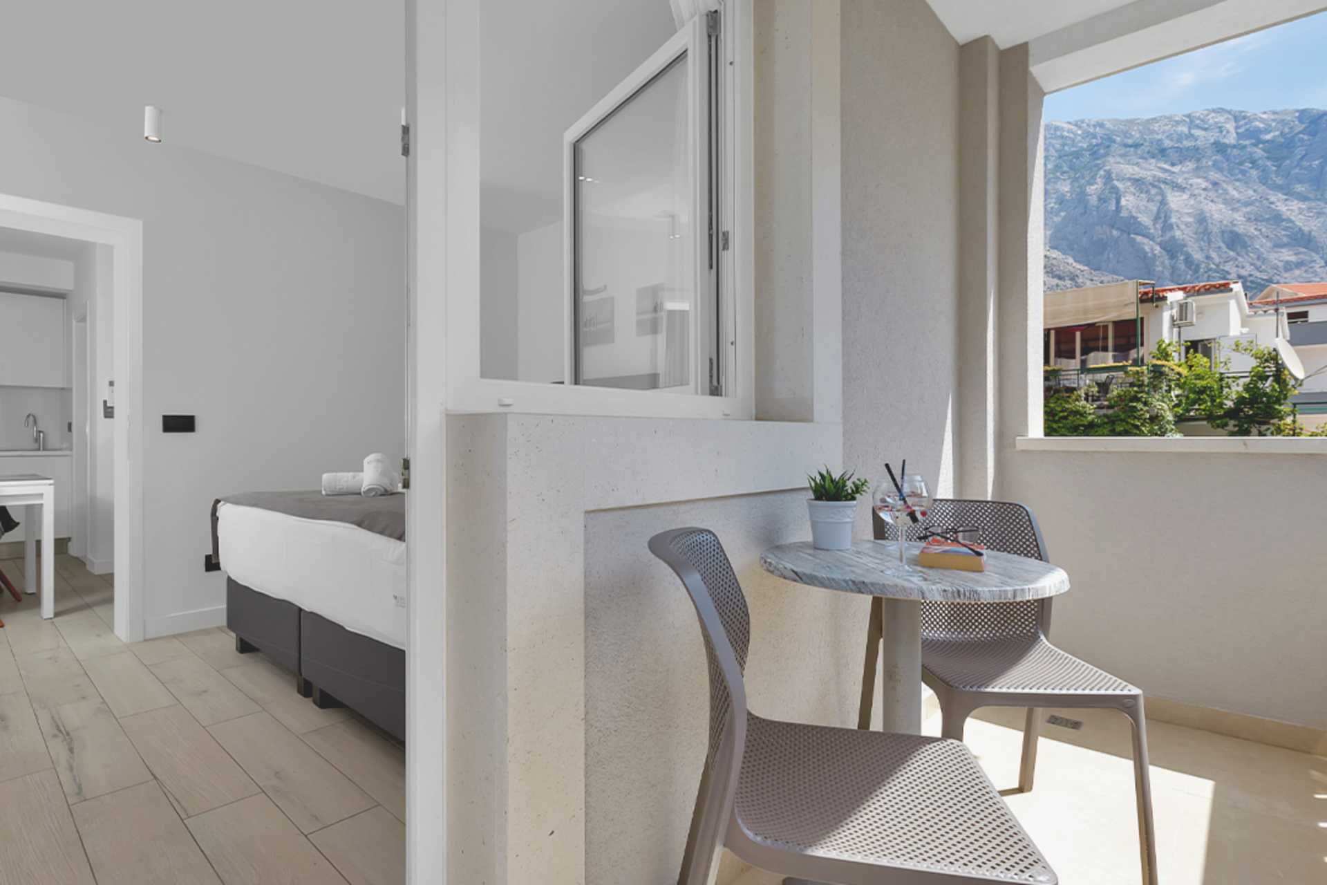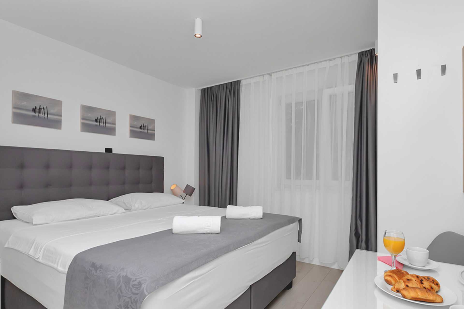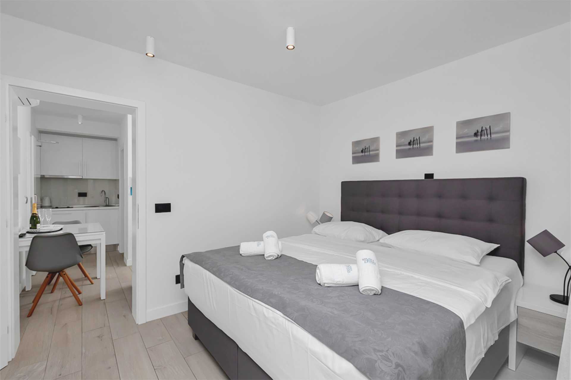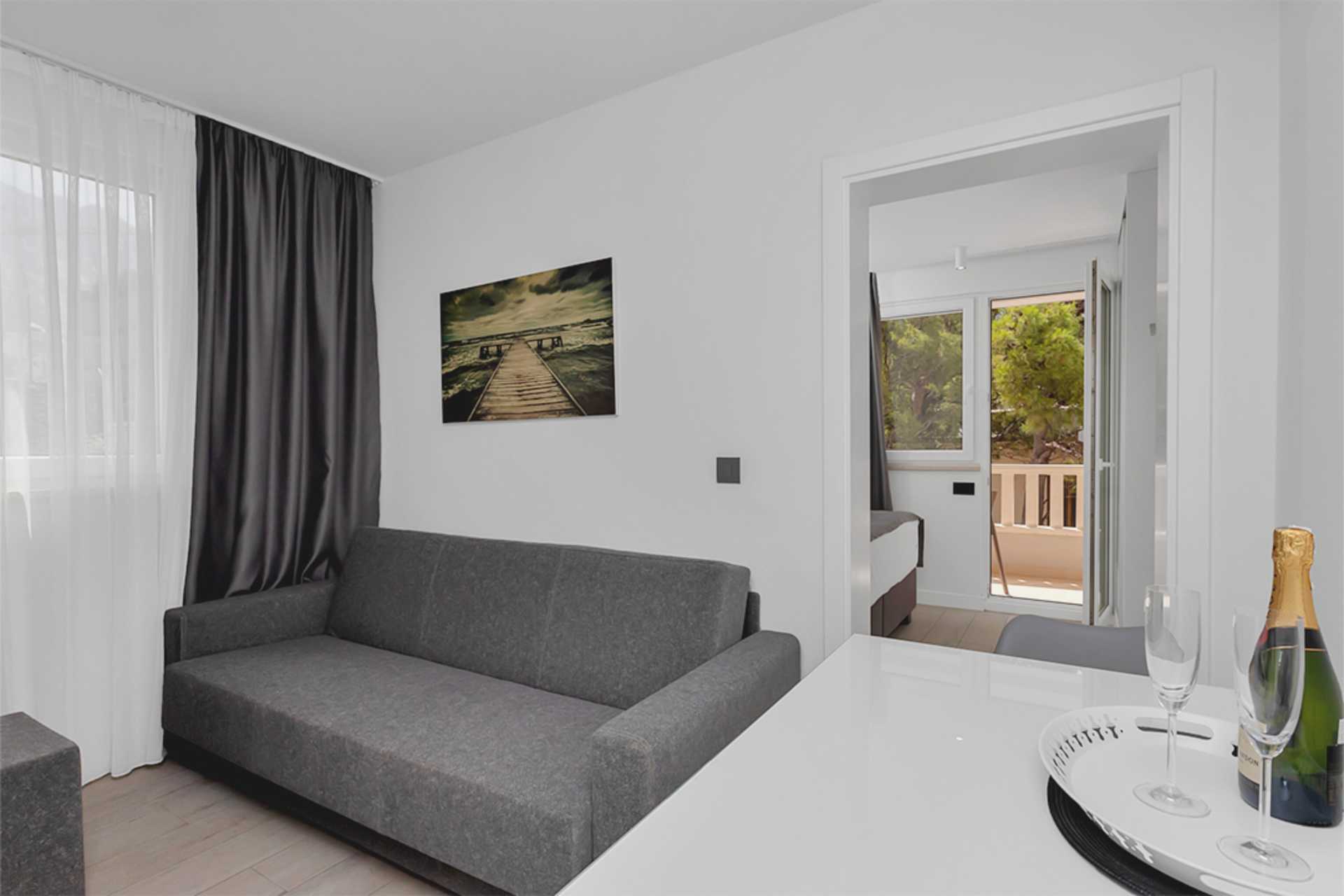 Kleinere tweekamerappartementen met balkon. De bovengelegen appartementen met balkon in het gebouw hebben een iets lagere plafondhoogte. Een slaapkamer en een gecombineerde woonkamer met kitchenette. Een tweepersoonsbed of twee eenpersoonsbedden. Mogelijkheid voor een extra bed op de slaapbank. Minikeuken met kookplaten, koelkast, magnetron en eenvoudige keukenapparatuur. Koffiezetapparaat, inclusief vier capsules. Wifi, airconditioning en kluisje inbegrepen. Tv met internationale zenders. Föhn. Badkamer met douche en toilet. Schoonmaak 7 keer/week.