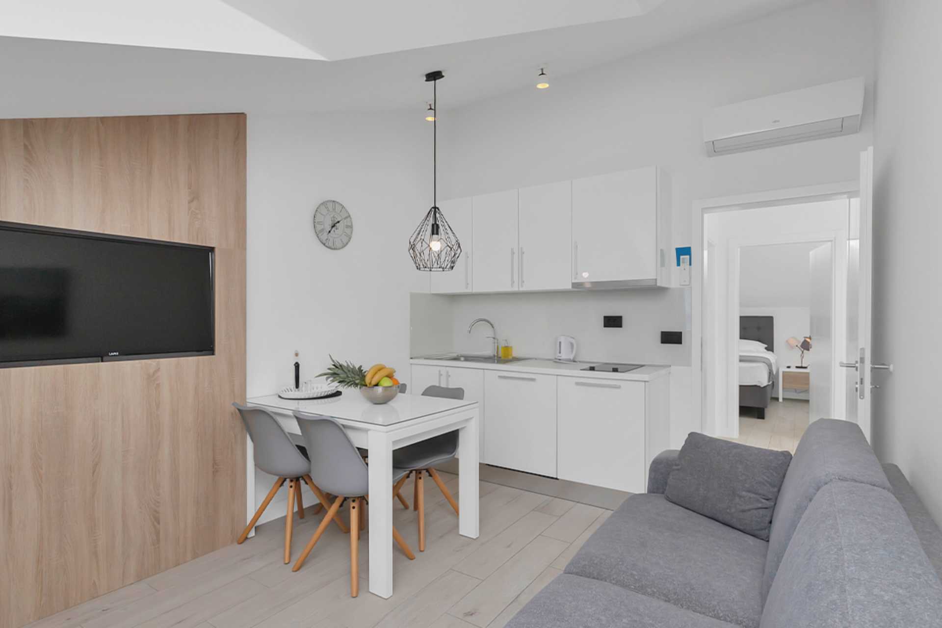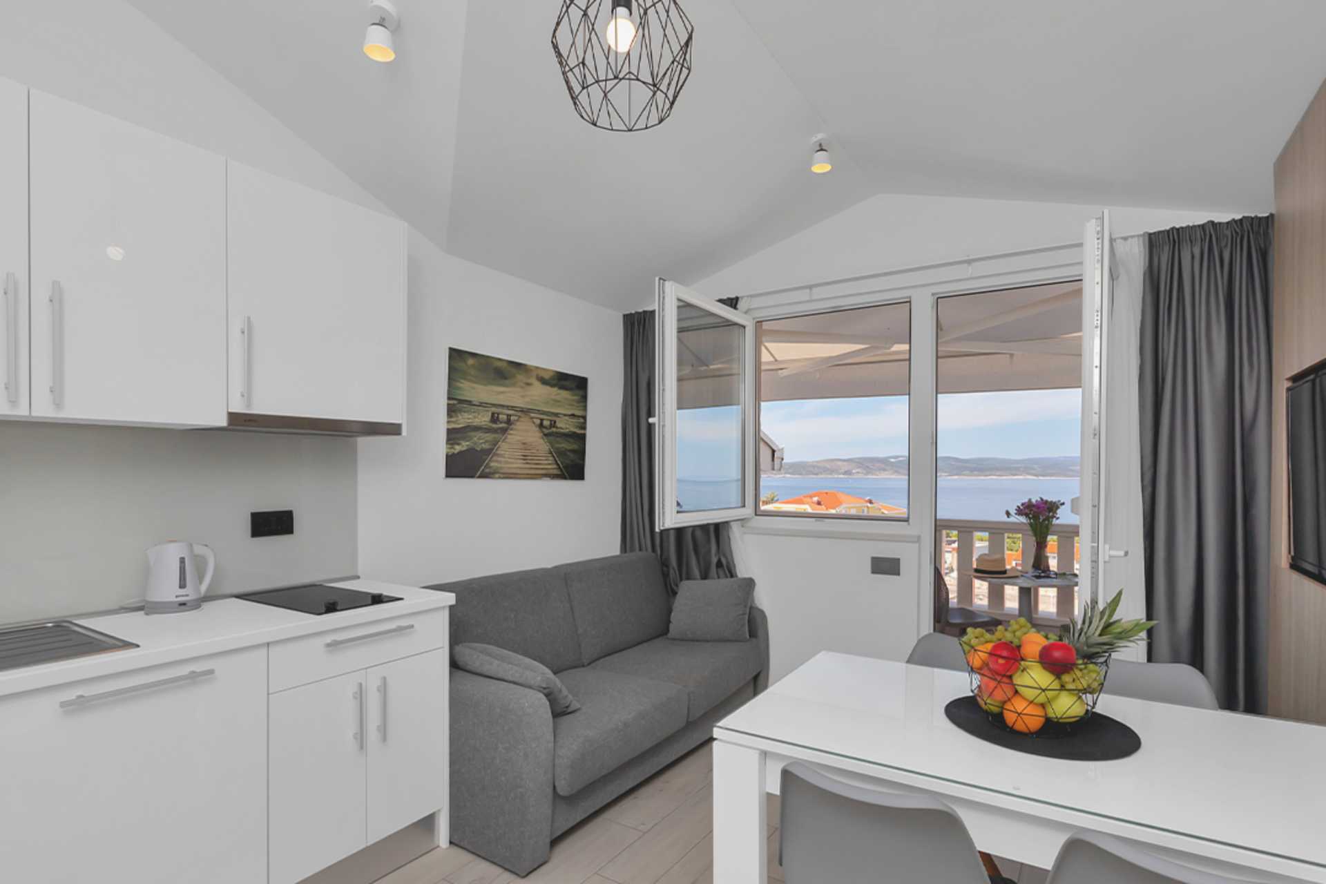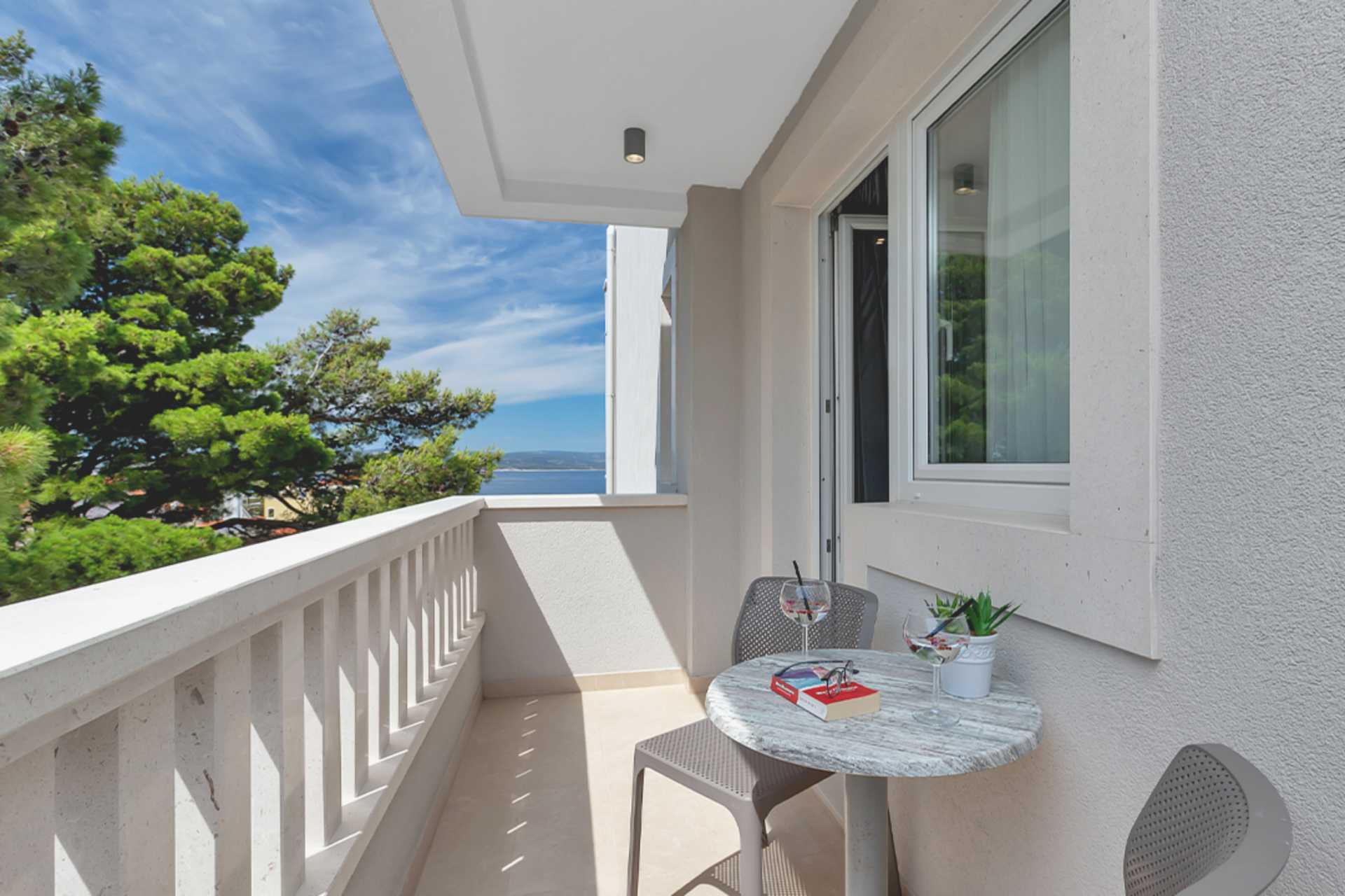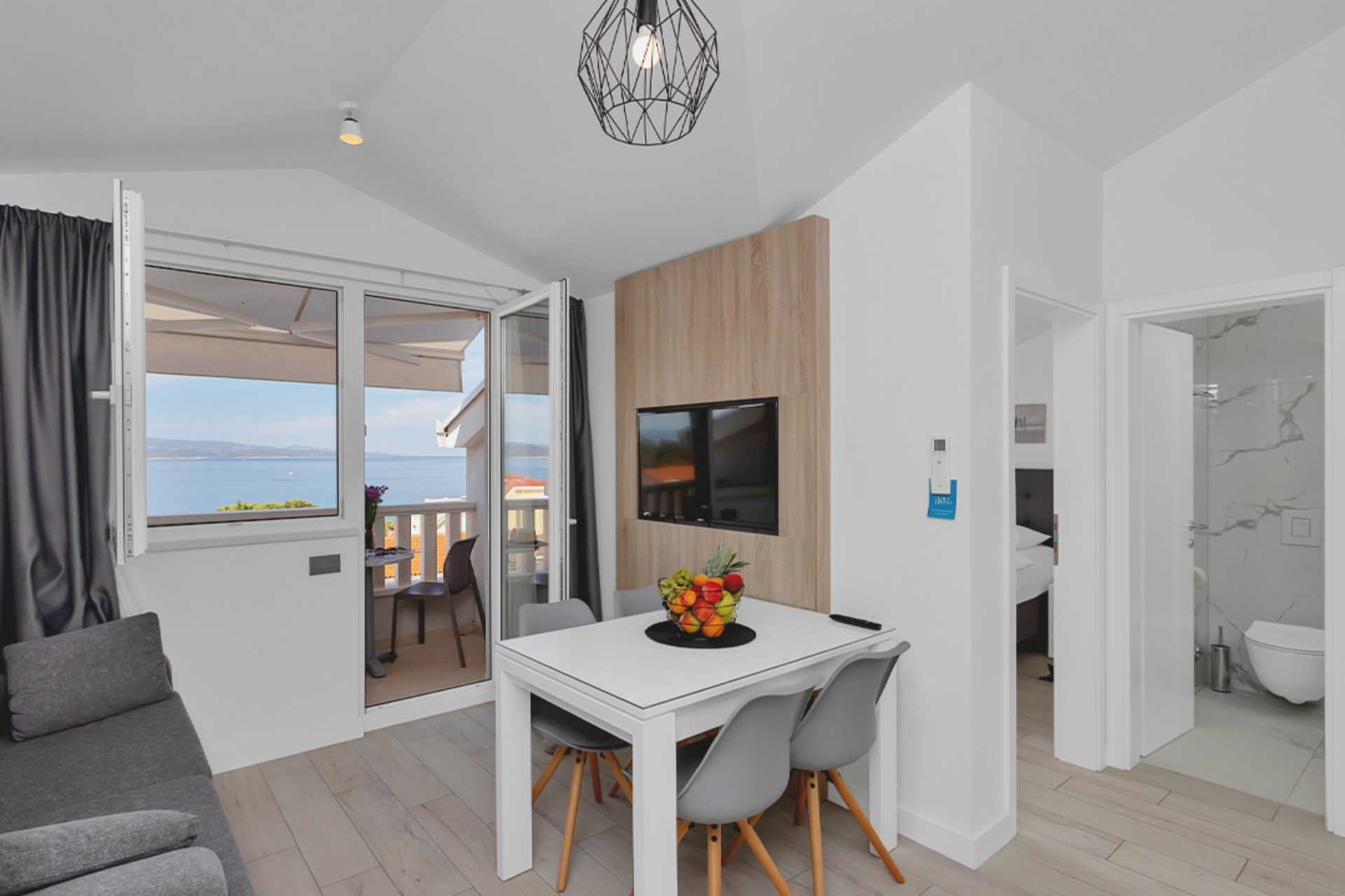 Kleinere tweekamerappartementen met balkon. De bovengelegen appartementen met balkon in het gebouw hebben een iets lagere plafondhoogte. Een slaapkamer en een gecombineerde woonkamer met kitchenette. Een tweepersoonsbed of twee eenpersoonsbedden. Mogelijkheid voor een extra bed op de slaapbank. Minikeuken met kookplaten, koelkast, magnetron en eenvoudige keukenapparatuur. Koffiezetapparaat, inclusief vier capsules. Wifi, airconditioning en kluisje inbegrepen. Tv met internationale zenders. Föhn. Badkamer met douche en toilet. Schoonmaak 7 keer/week.