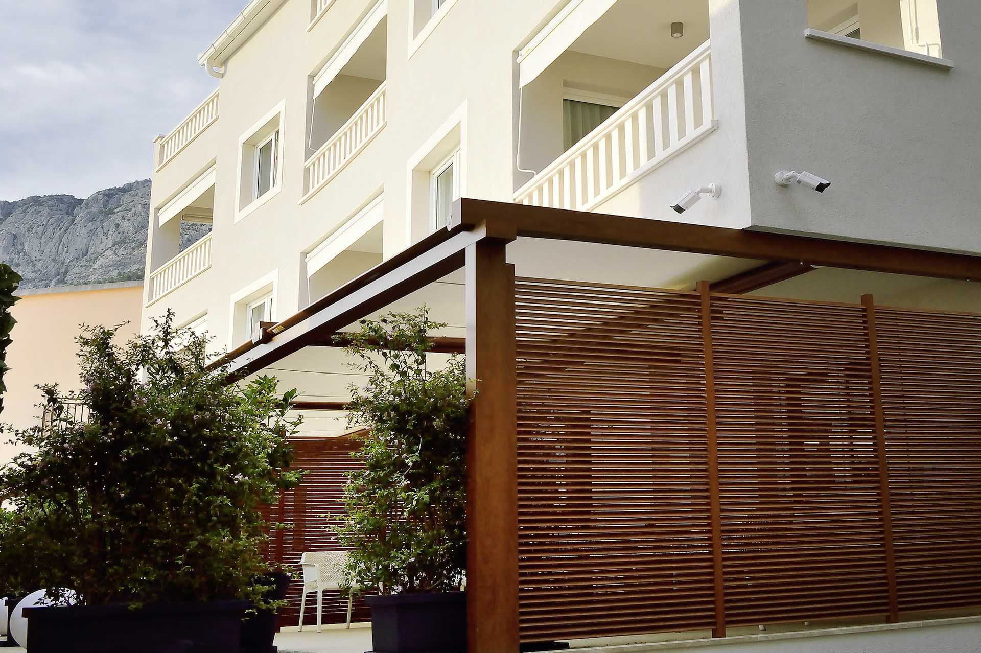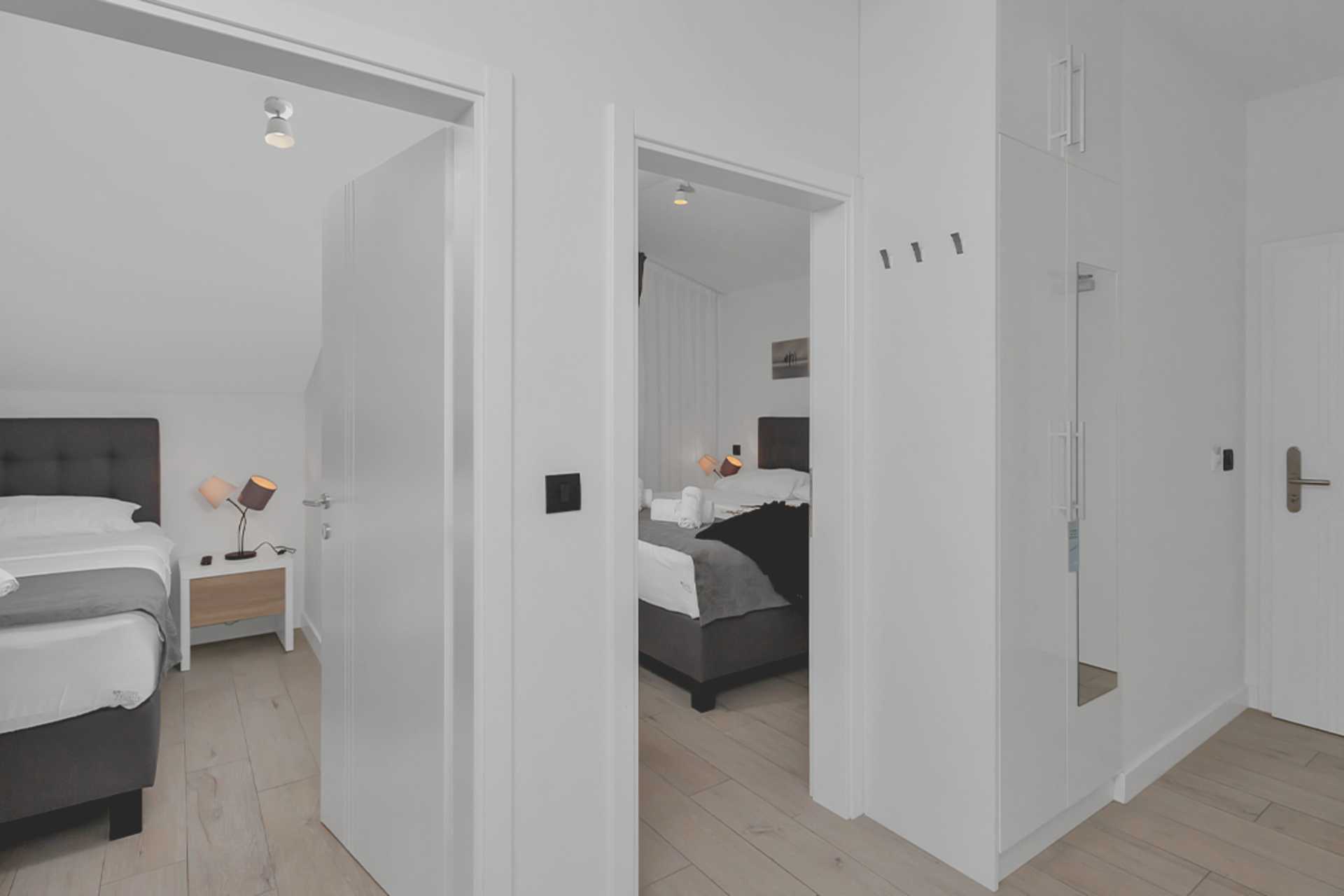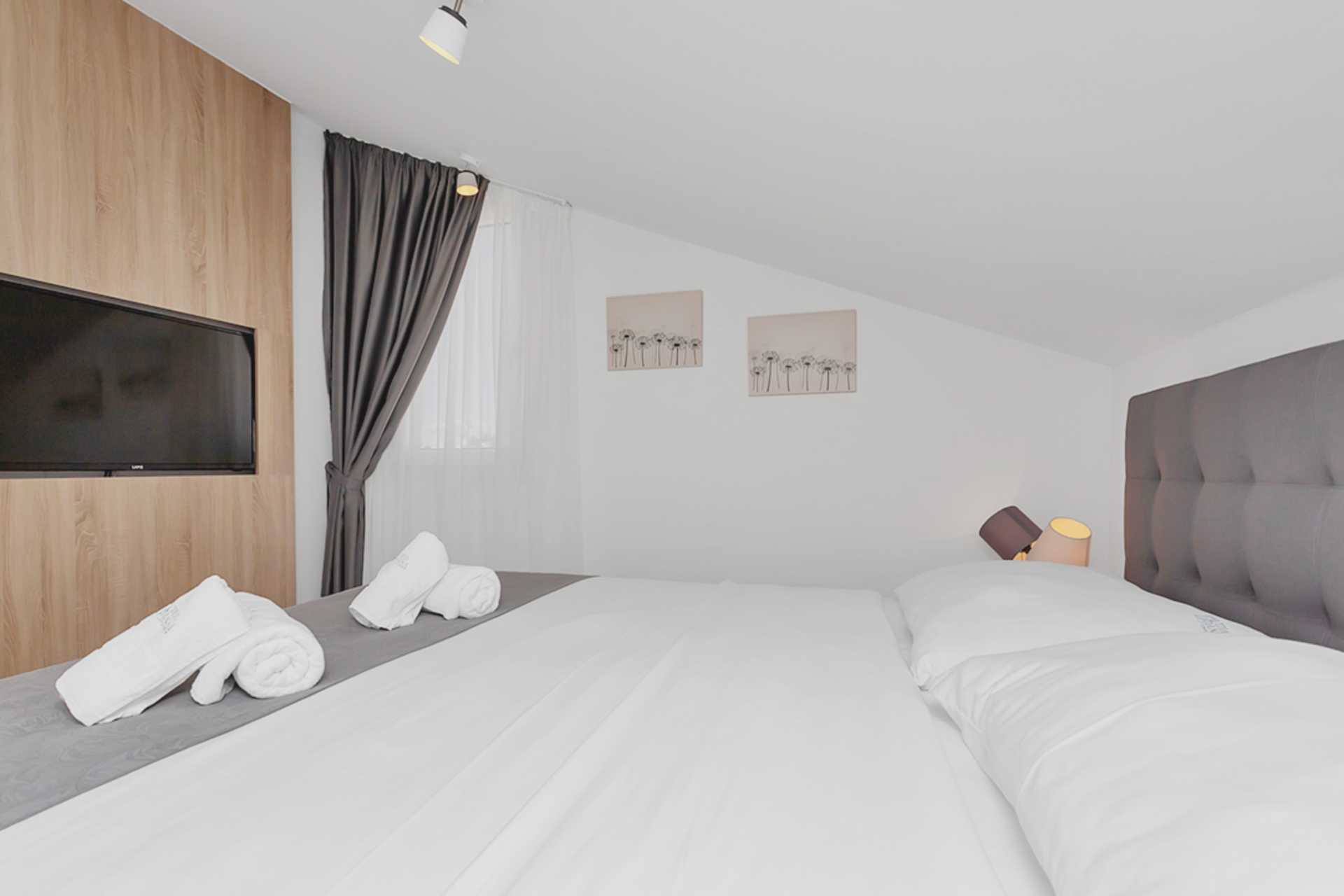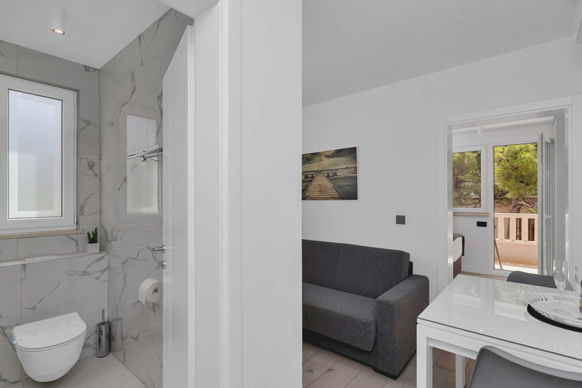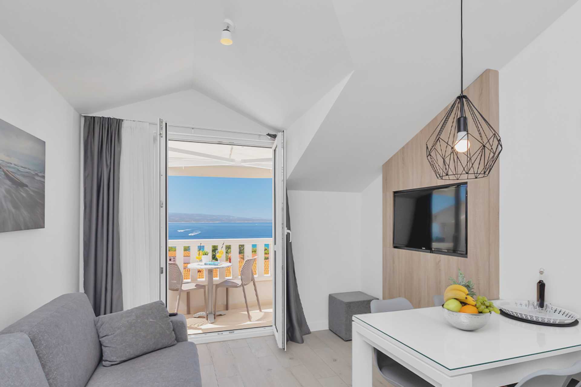 Kleinere tweekamerappartementen met balkon. De bovengelegen appartementen met balkon in het gebouw hebben een iets lagere plafondhoogte. Een slaapkamer en een gecombineerde woonkamer met kitchenette. Een tweepersoonsbed of twee eenpersoonsbedden. Mogelijkheid voor een extra bed op de slaapbank. Minikeuken met kookplaten, koelkast, magnetron en eenvoudige keukenapparatuur. Koffiezetapparaat, inclusief vier capsules. Wifi, airconditioning en kluisje inbegrepen. Tv met internationale zenders. Föhn. Badkamer met douche en toilet. Schoonmaak 7 keer/week.