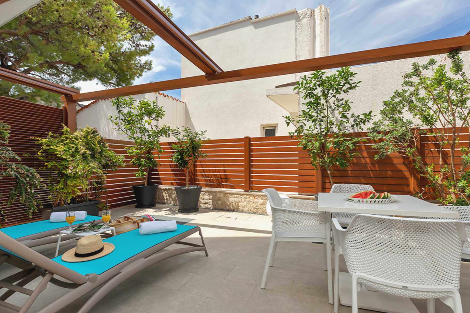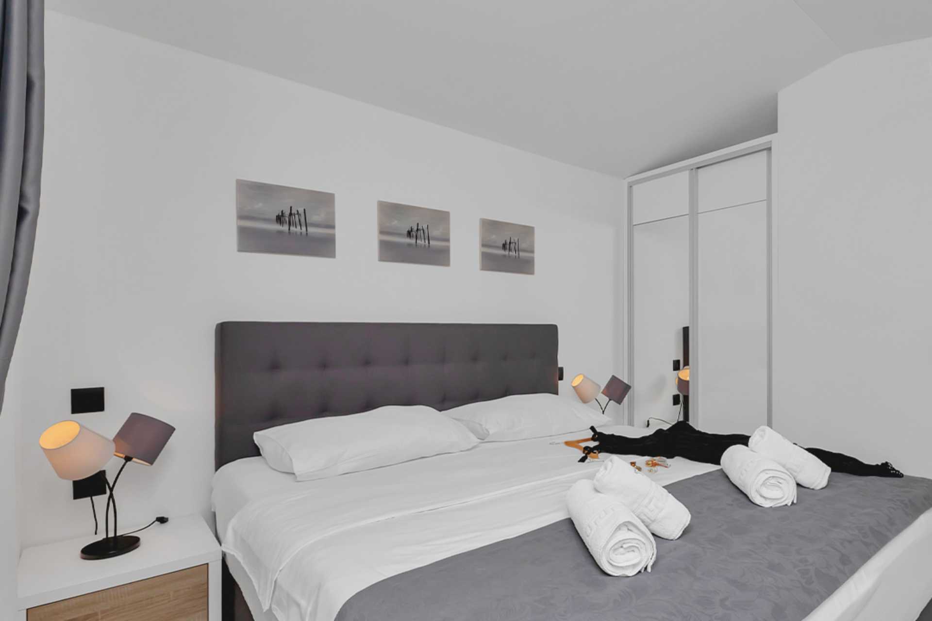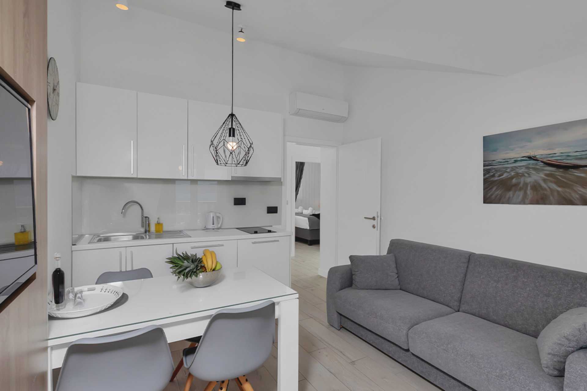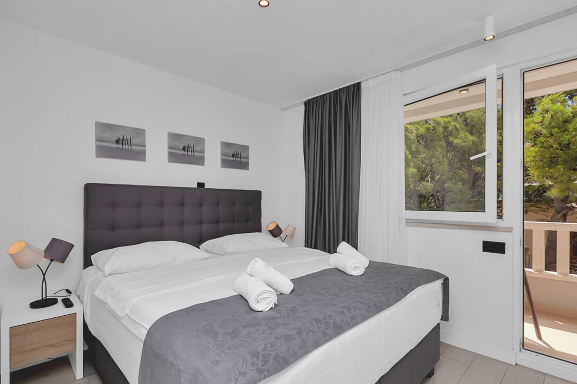 Driekamerappartement met balkon of balkon op de begane grond, sommige balkons hebben zeezicht of beperkt zeezicht. Appartementen op de bovenste verdieping hebben iets lagere plafonds. Twee slaapkamers en een gecombineerde woonkamer/keuken. Een tweepersoonsbed of twee eenpersoonsbedden. Mogelijkheid voor extra bedden in slaapbank. Minikeuken met kookplaten, koelkast, vaatwasser, magnetron en basiskeukengerei. Inclusief koffiezetapparaat, vier capsules. Wifi, airconditioning en kluisje inbegrepen. Televisie met internationale zenders. Föhn. Badkamer met douche en toilet. Schoonmaak 7 keer/week.