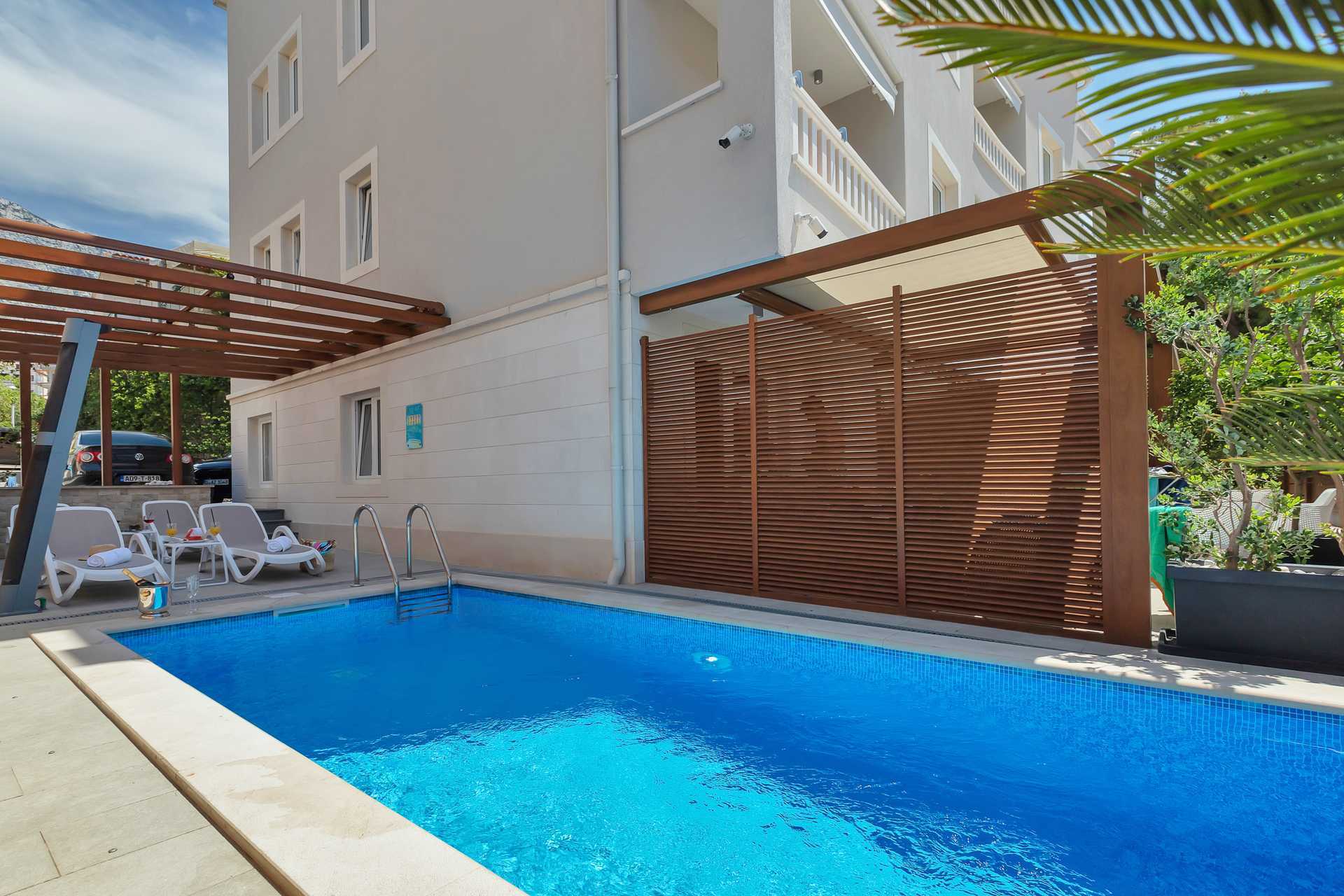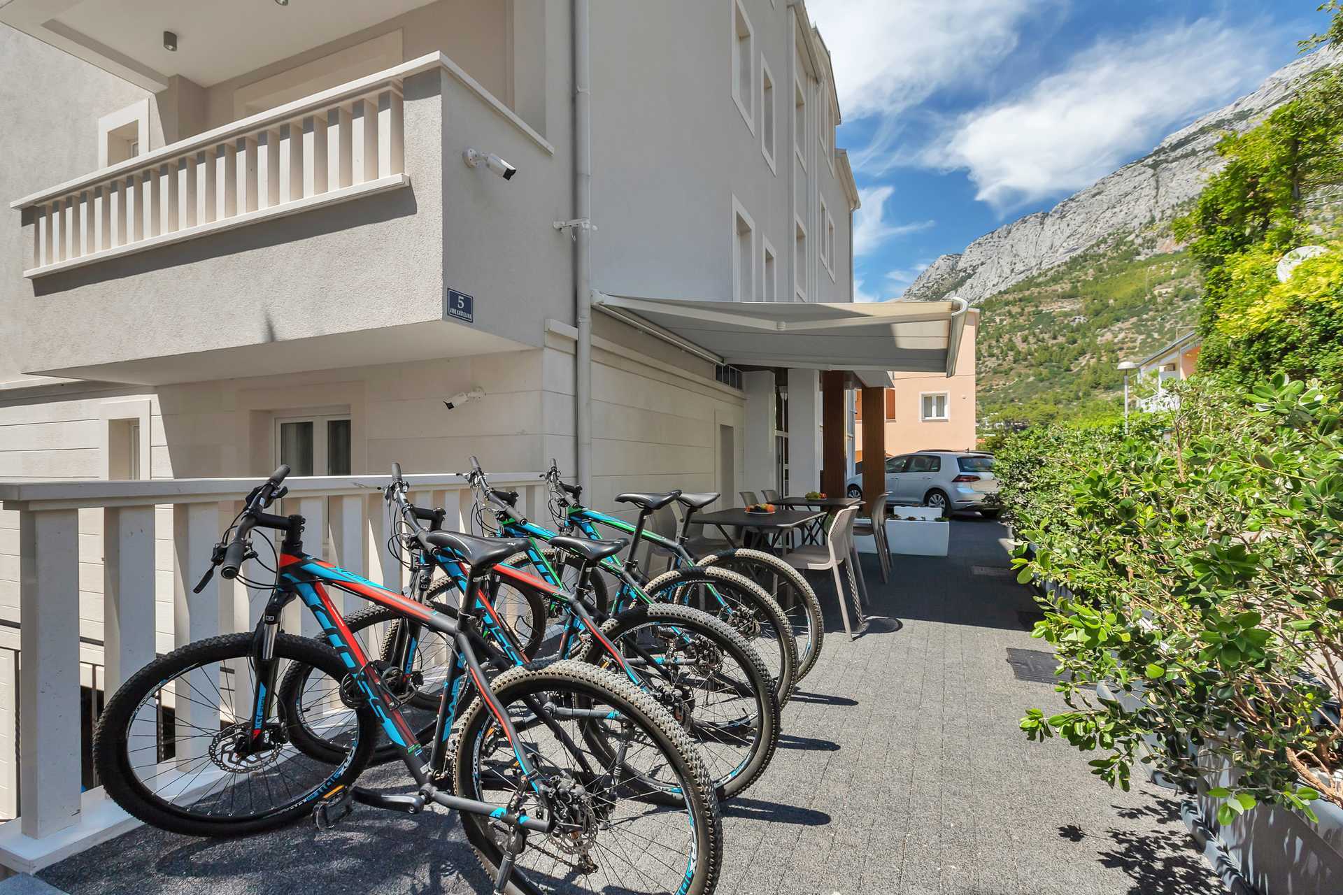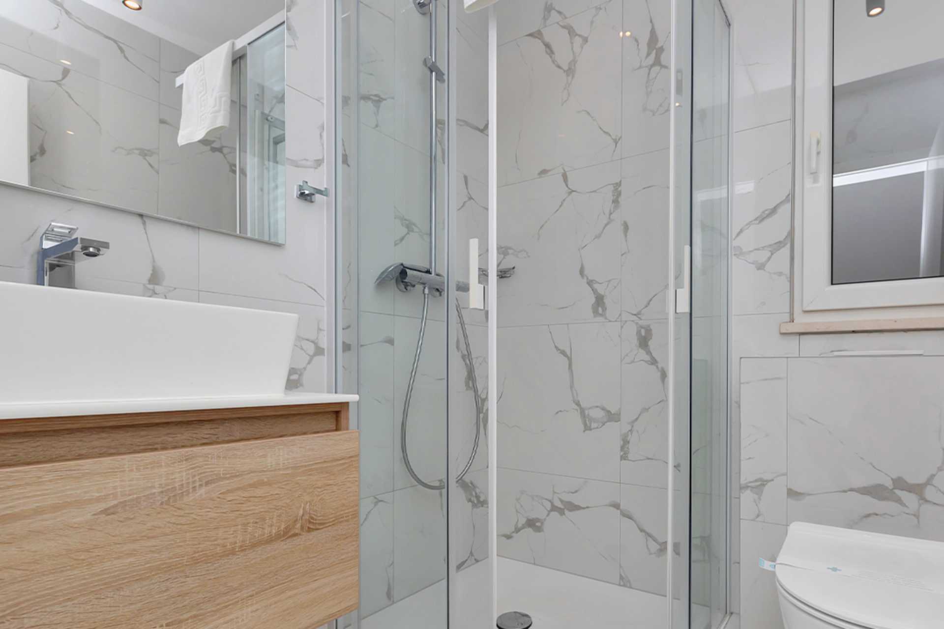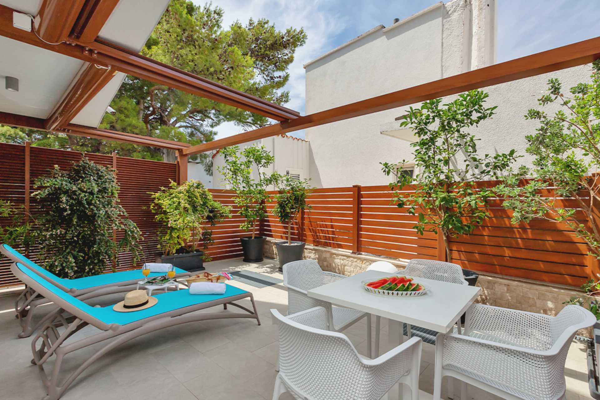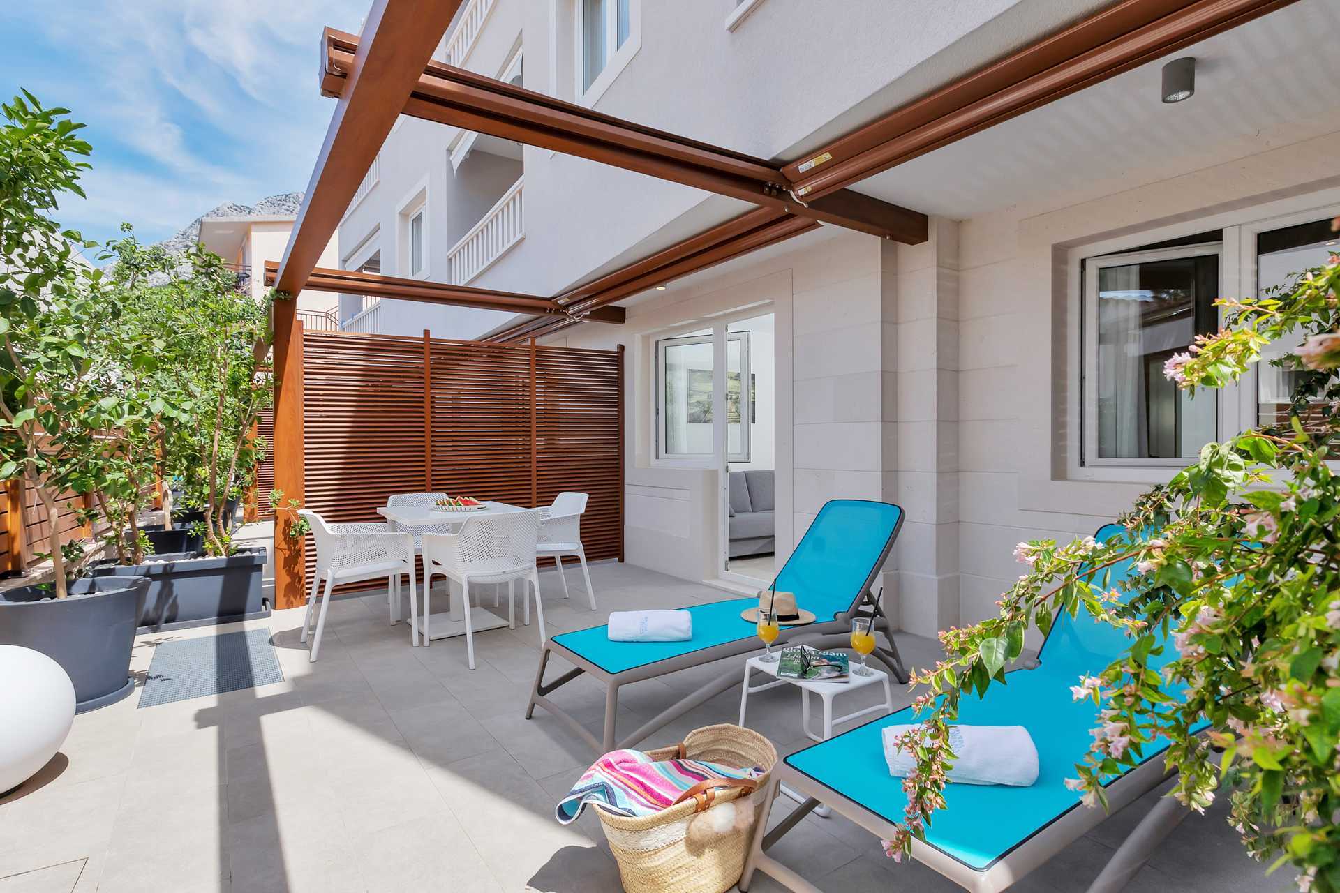 Driekamerappartement met balkon of balkon op de begane grond, sommige balkons hebben zeezicht of beperkt zeezicht. Appartementen op de bovenste verdieping hebben iets lagere plafonds. Twee slaapkamers en een gecombineerde woonkamer/keuken. Een tweepersoonsbed of twee eenpersoonsbedden. Mogelijkheid voor extra bedden in slaapbank. Minikeuken met kookplaten, koelkast, vaatwasser, magnetron en basiskeukengerei. Inclusief koffiezetapparaat, vier capsules. Wifi, airconditioning en kluisje inbegrepen. Televisie met internationale zenders. Föhn. Badkamer met douche en toilet. Schoonmaak 7 keer/week.