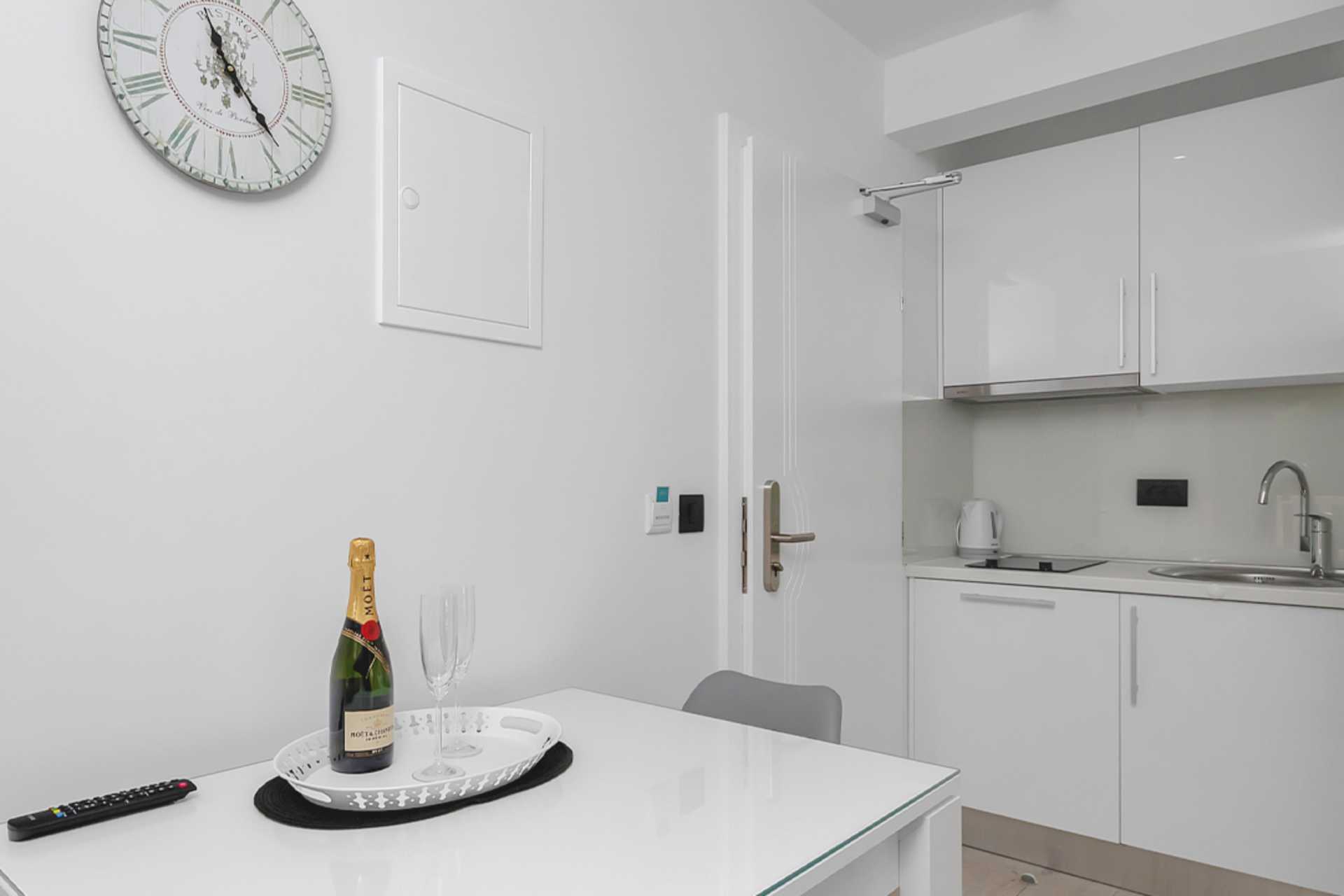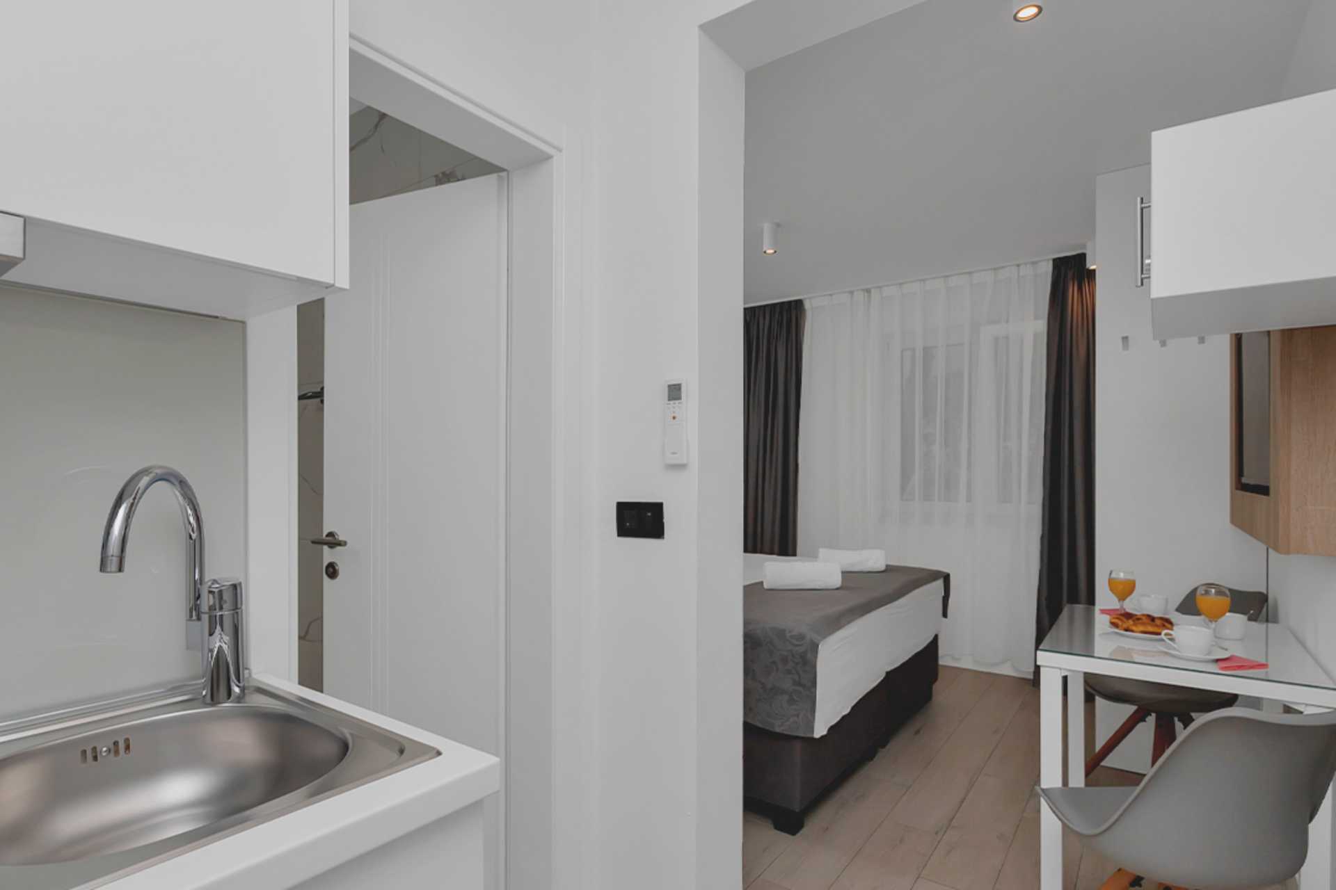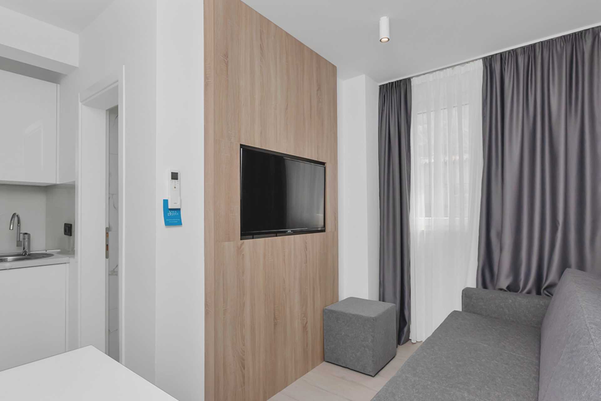 Studio zonder terras. Gecombineerde slaapkamer met kitchenette. Een tweepersoonsbed of twee eenpersoonsbedden. Minikeuken met kookplaten, koelkast, magnetron en eenvoudige keukenapparatuur. Koffiezetapparaat - inclusief vier capsules. Wifi, airconditioning en kluisje inbegrepen. Tv met internationale zenders. Föhn. Badkamer met douche en toilet. Schoonmaak 7 keer/week.