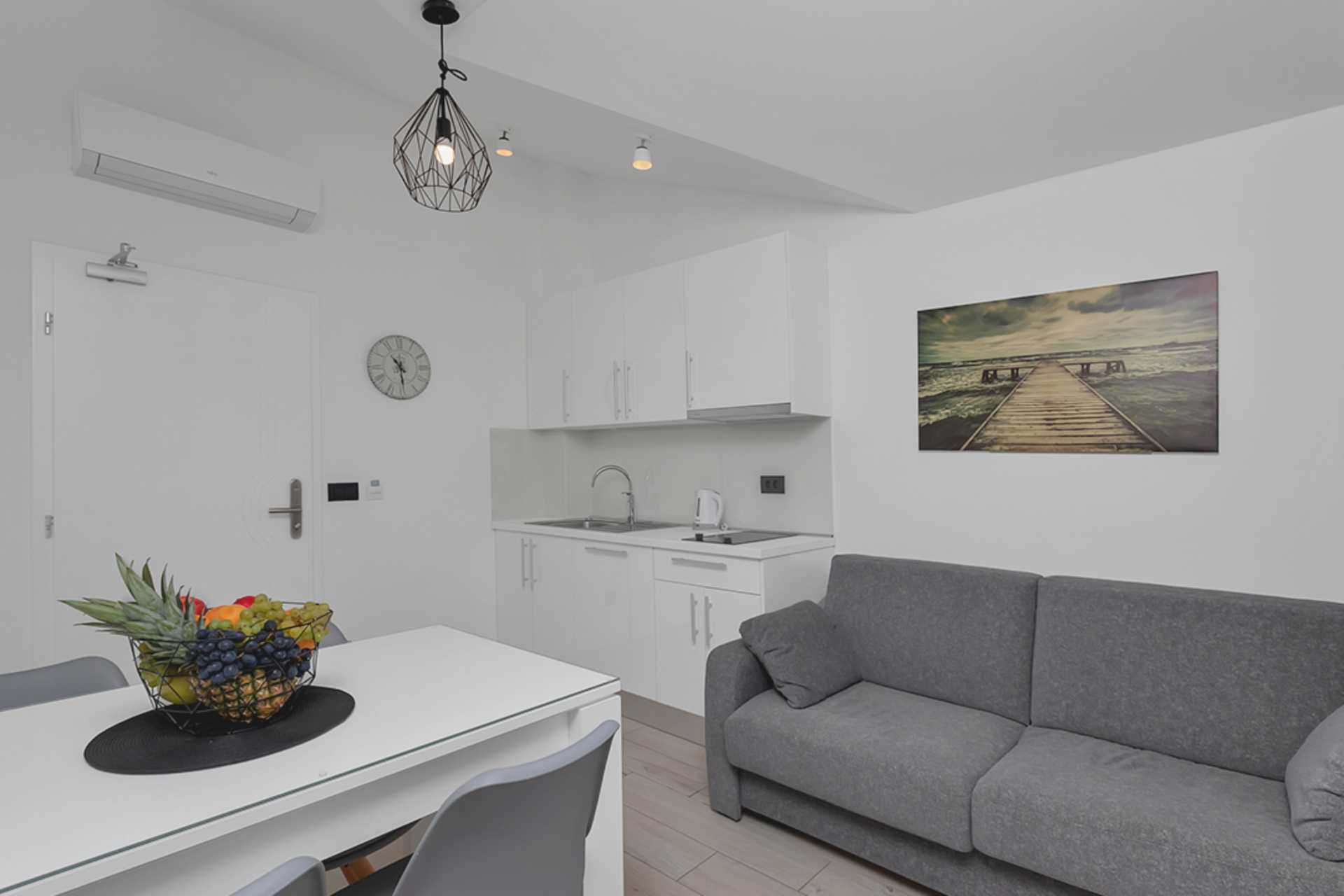 Tweekamerappartement met balkon of balkon op de begane grond. Sommige balkons hebben uitzicht op zee of een beperkt uitzicht op zee. De appartementen gelegen in de top van het gebouw met balkon hebben een iets lagere plafondhoogte. Een slaapkamer en een gecombineerde woonkamer met kitchenette. Een tweepersoonsbed of twee eenpersoonsbedden. Mogelijkheid voor extra bedden in slaapbank. Minikeuken met kookplaten, koelkast, magnetron en eenvoudige keukenapparatuur. Koffiezetapparaat, inclusief vier capsules. Wifi, airconditioning en kluisje inbegrepen. Tv met internationale zenders. Föhn. Badkamer met douche en toilet. Schoonmaak 7 keer/week.
