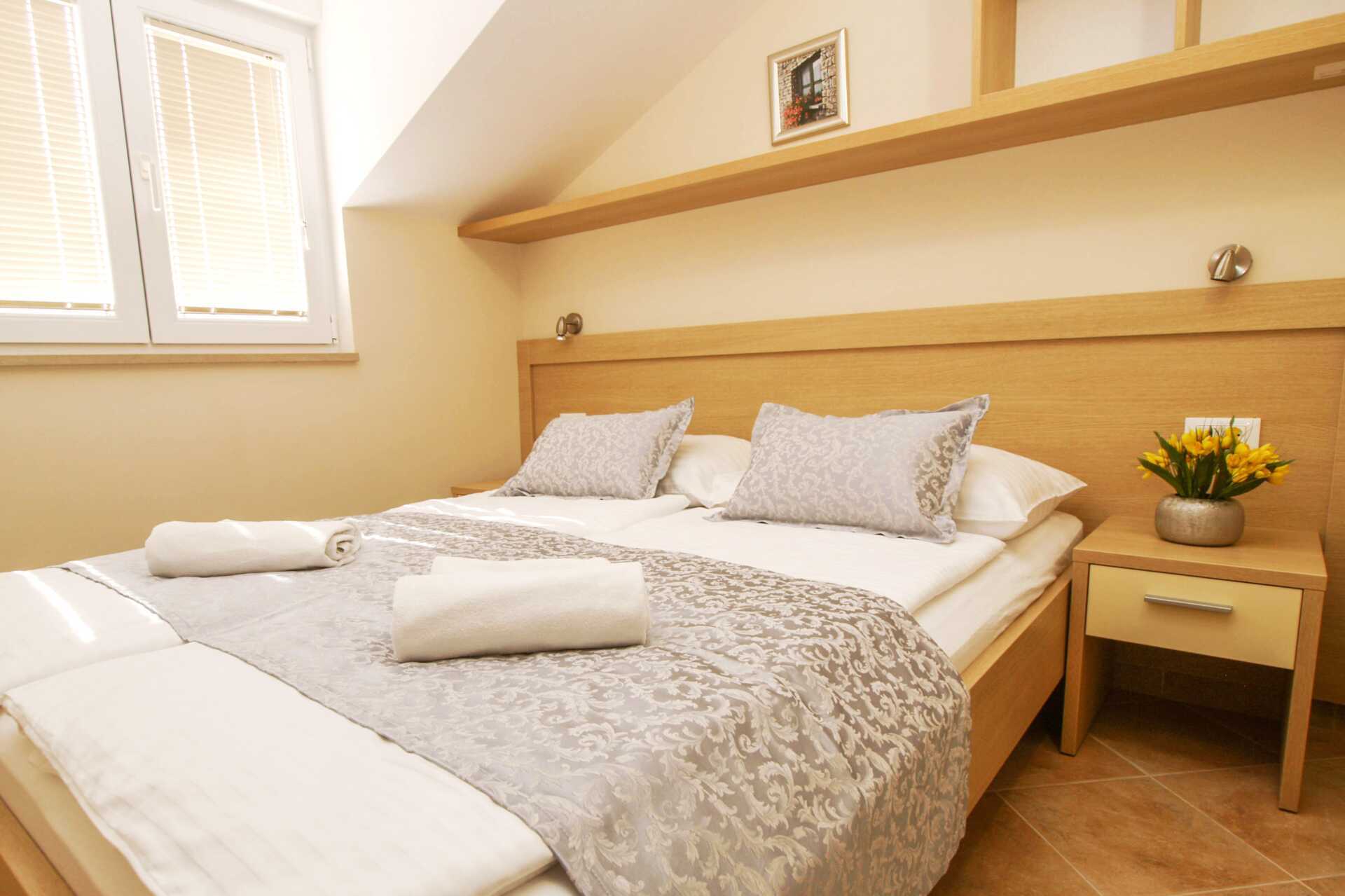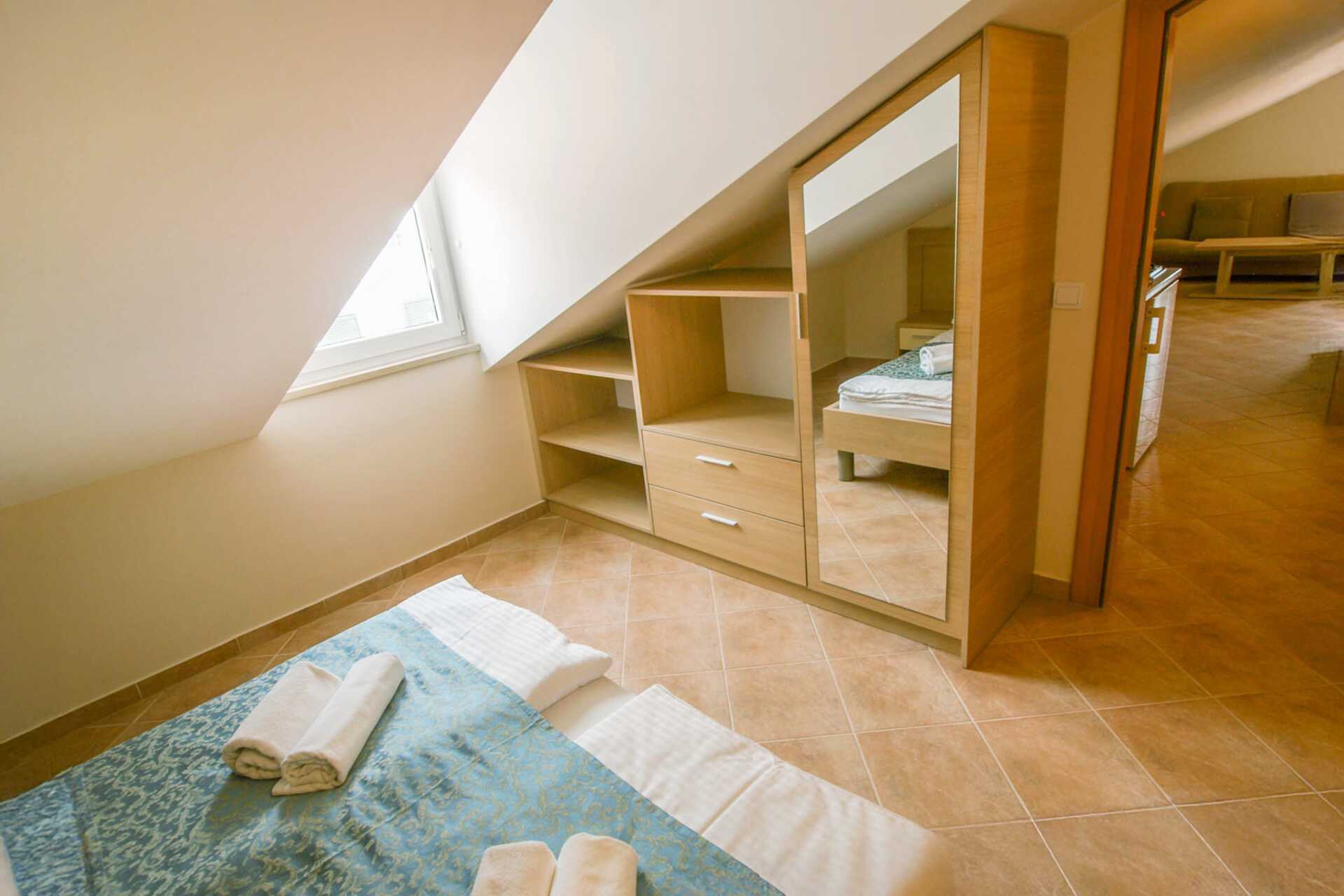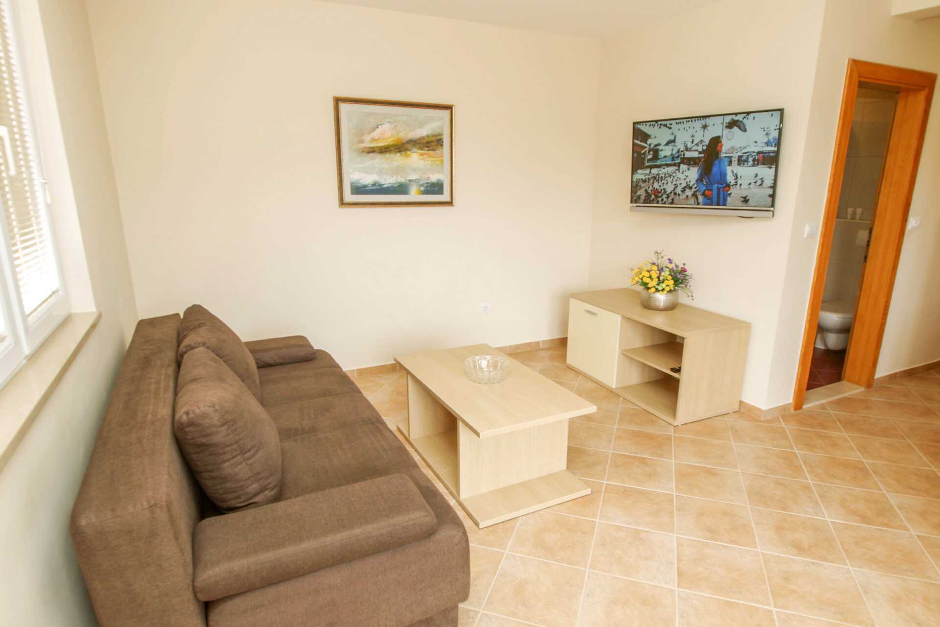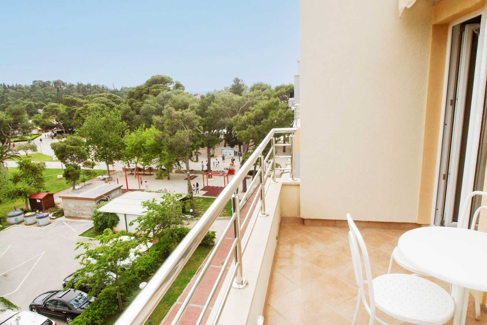 Studio met balkon, sommige met beperkt uitzicht op zee. Slaapkamer en woonkamer gecombineerd met kitchenette. Sommige appartementen op de bovenste verdieping hebben schuine plafonds. Een tweepersoonsbed of twee eenpersoonsbedden. Mogelijkheid voor extra bedden in slaapbank. Minikeuken met kookplaten, koelkast, waterkoker, koffiezetapparaat en eenvoudige keukenapparatuur. Wifi, airconditioning en kluisje inbegrepen. Tv met internationale zenders. Föhn. Badkamer met douche en toilet. Schoonmaak 6 keer/week.