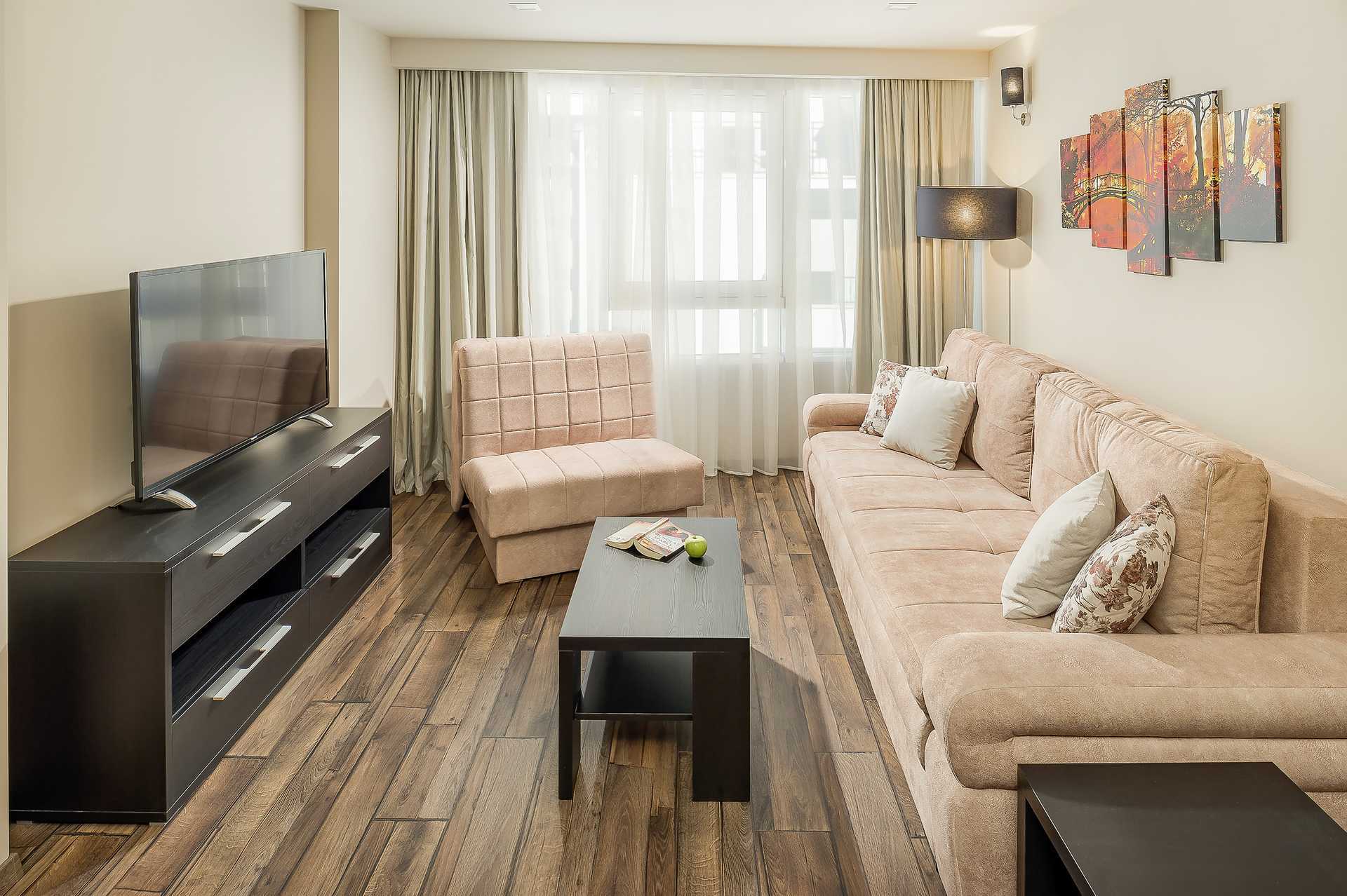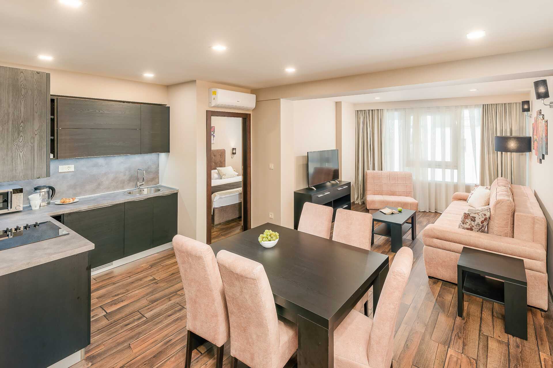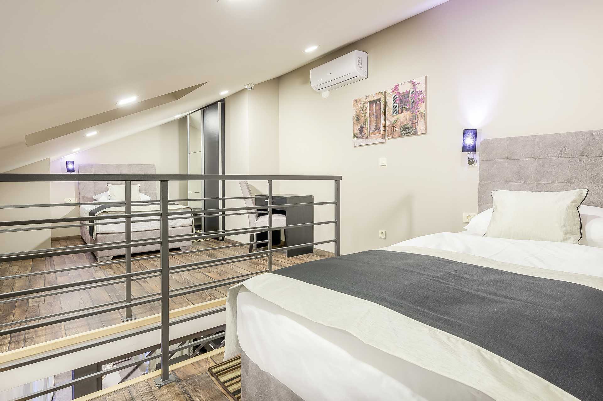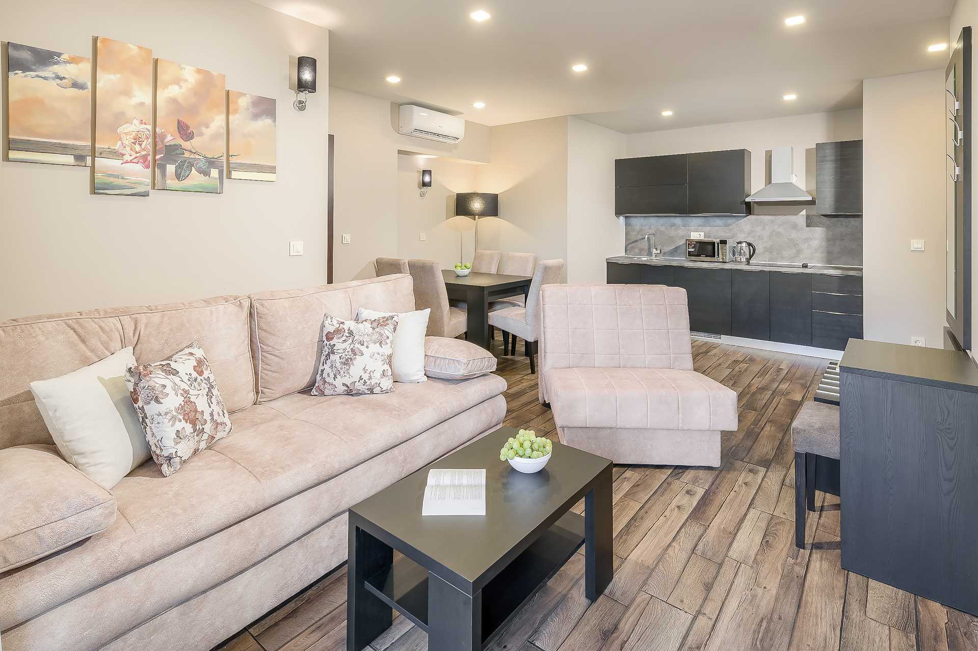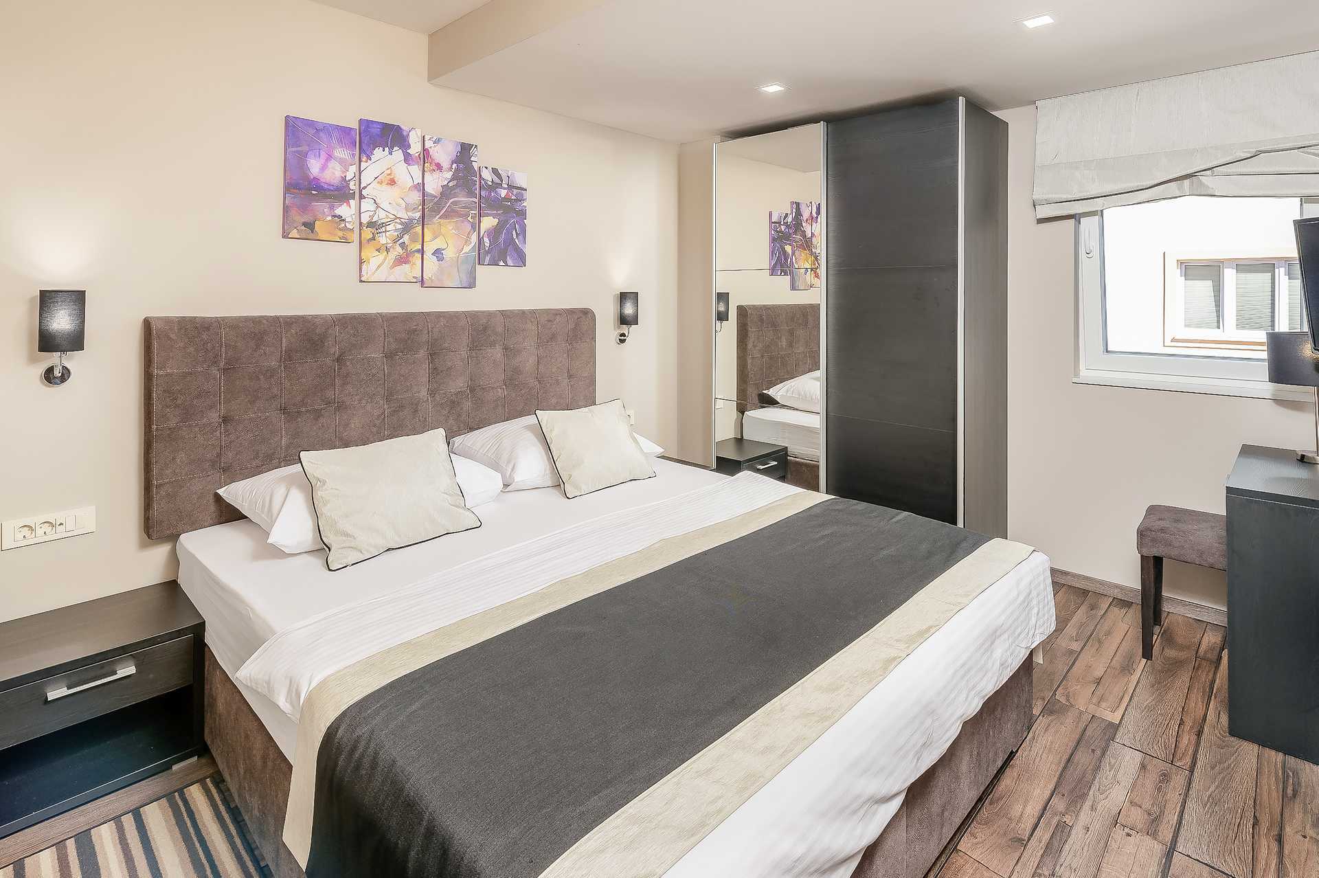 Tweekamerappartementen met balkon, enkele balkons met uitzicht op zee of tweekamerappartementen zonder terras. Slaapkamer en gecombineerde woonkamer met kitchenette. De appartementen op de bovenste verdieping hebben schuine plafonds. Een tweepersoonsbed. Mogelijkheid tot extra bedden in de vorm van een slaapbank en een slaapbank. Minikeuken met koelkast, magnetron, kookplaten en basis keukenuitrusting. Wifi, airconditioning en kluisje inbegrepen. Tv met satellietzenders. Föhn. Badkamer met douche en toilet. Schoonmaak 7 keer/week.