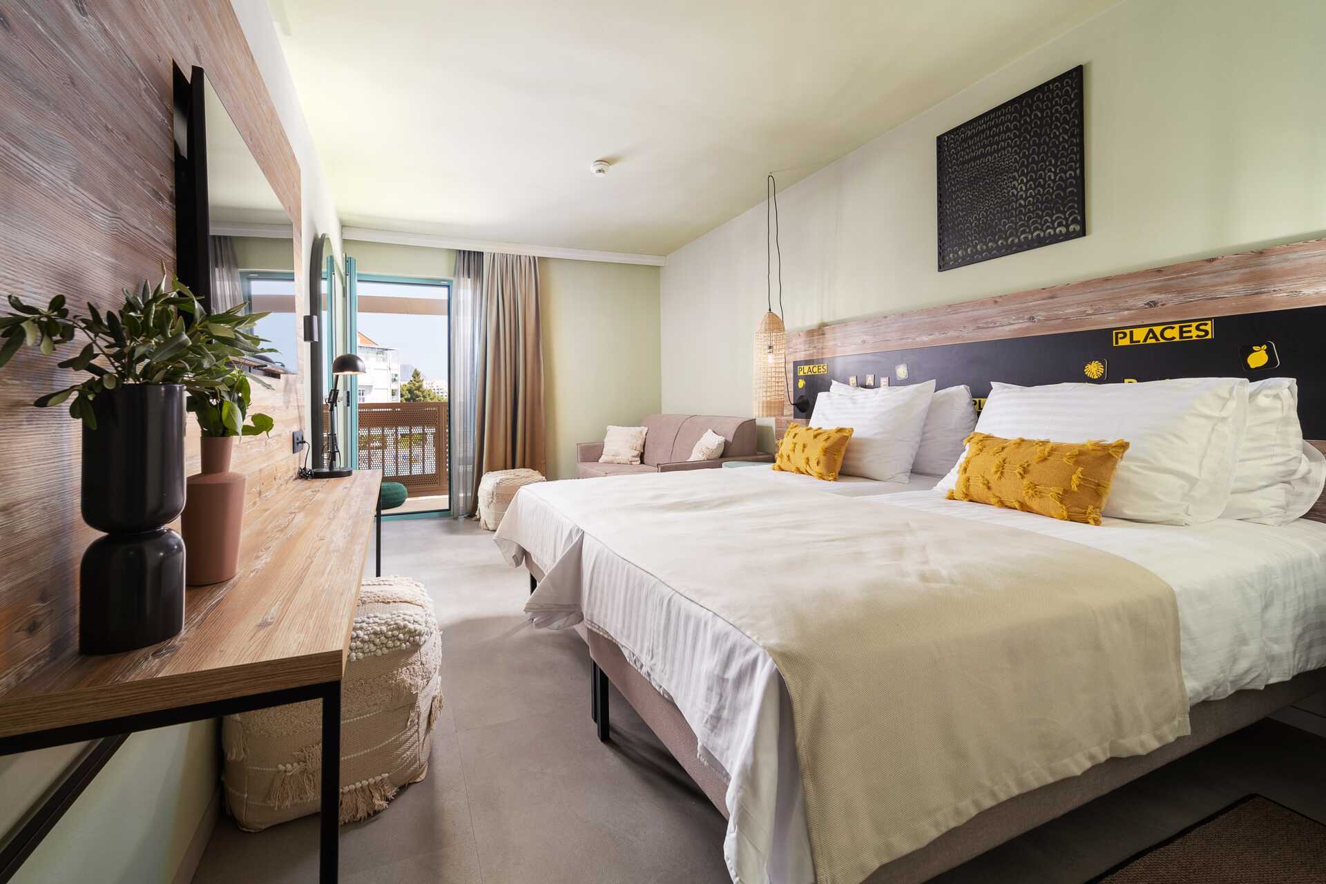 Grotere tweepersoonskamer met balkon en beperkt zeezicht. Een tweepersoonsbed of twee eenpersoonsbedden. Mogelijkheid voor een extra bed in een eenpersoonsbed of slaapbank. Wifi, airconditioning en kluisje inbegrepen. Tv met internationale zenders. Koelkast. Föhn. Badkamer met douche en toilet. Schoonmaak 7 keer/week.