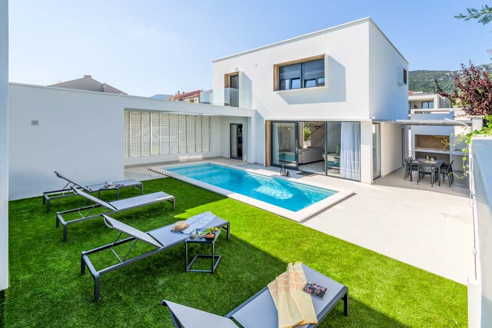 Buiten vindt u een uitnodigend privézwembad, perfect om te genieten van de zon en af te koelen. Deze idyllische plek, ver weg van de drukte van de stad, beschikt over een schaduwrijk terras, perfect om buiten te dineren, comfortabele ligstoelen om van de Kroatische zon te genieten en een barbecue waar u heerlijk in de zon gebruik van kunt maken.