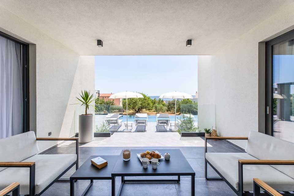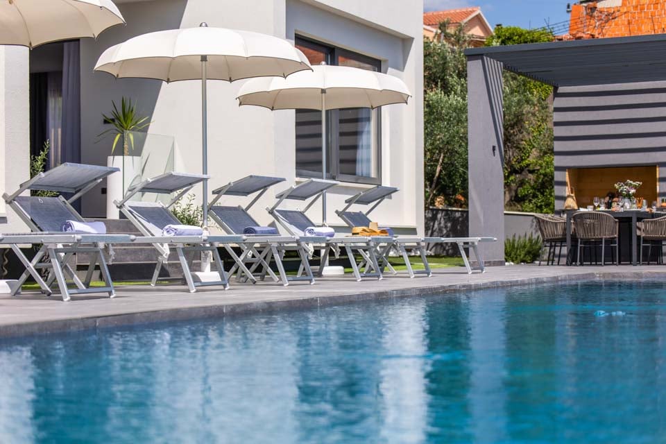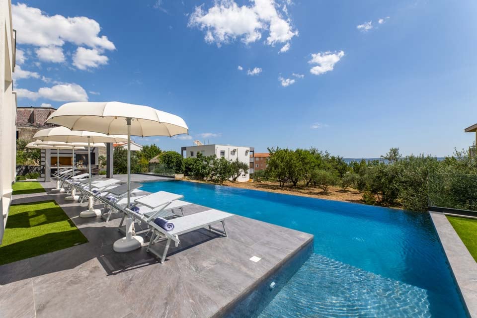 Elk van de vijf ruime slaapkamers is een privétoevluchtsoord, voorzien van luxe meubels, een eigentijdse inrichting en een eigen badkamer voor optimaal comfort. Grote ramen en balkons laten het gouden Kroatische zonlicht binnen en bieden een adembenemend uitzicht op de Adriatische Zee en de weelderige omgeving.