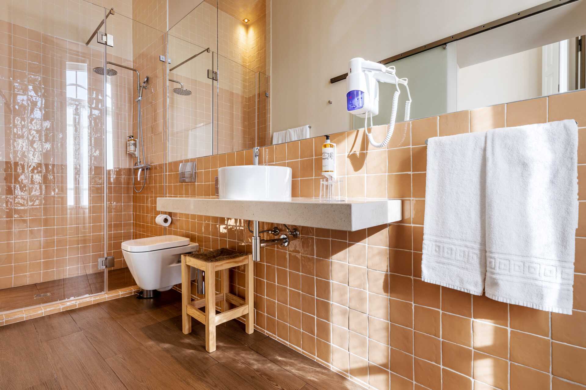 Tweepersoonskamer, zonder patio. Eén tweepersoonsbed of twee éénpersoonsbedden. Vloerbedekking in sommige kamers. Wifi, airconditioning en kluisje inbegrepen. Minibar. TV met internationale zenders. Föhn. Badkamer met douche en toilet. Schoonmaak 7 keer per week.