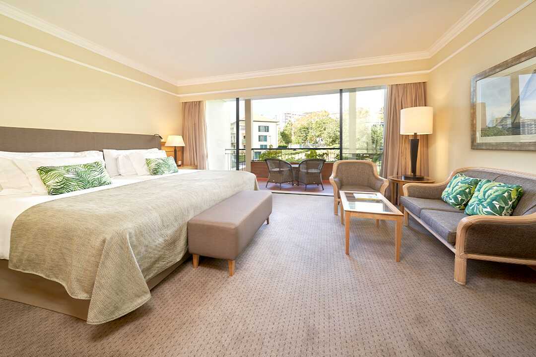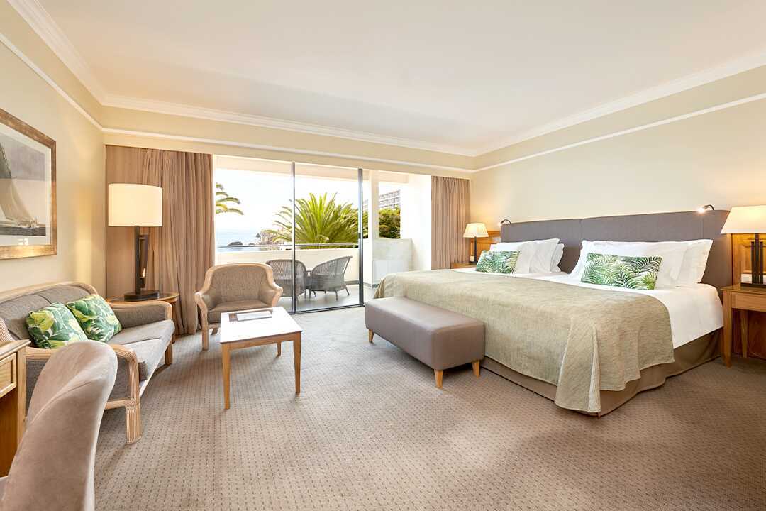 Deluxe kamer met balkon en uitzicht op zee. De deluxe kamers bevinden zich op de verdiepingen 1 tot en met 5 en bieden uitzicht op de stad Funchal, de haven en de zee. Twee brede eenpersoonsbedden of een tweepersoonsbed. Mogelijkheid voor een extra bed in bestaande bedden of in een eenpersoonsbed. Wifi, airconditioning en kluisje inbegrepen. Vloerbedekking. Minibar. Waterkoker en koffie en thee. Tv met internationale zenders. Badjassen en hotelslippers. Föhn. Badkamer met bad of douche en toilet. Schoonmaak 7 keer/week. Kinderen jonger dan twee jaar zijn inbegrepen in het maximale aantal personen in de kamer.