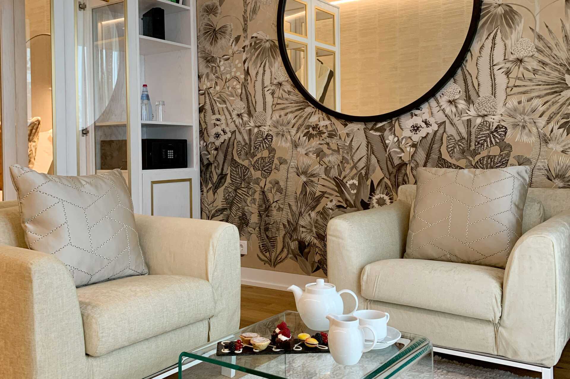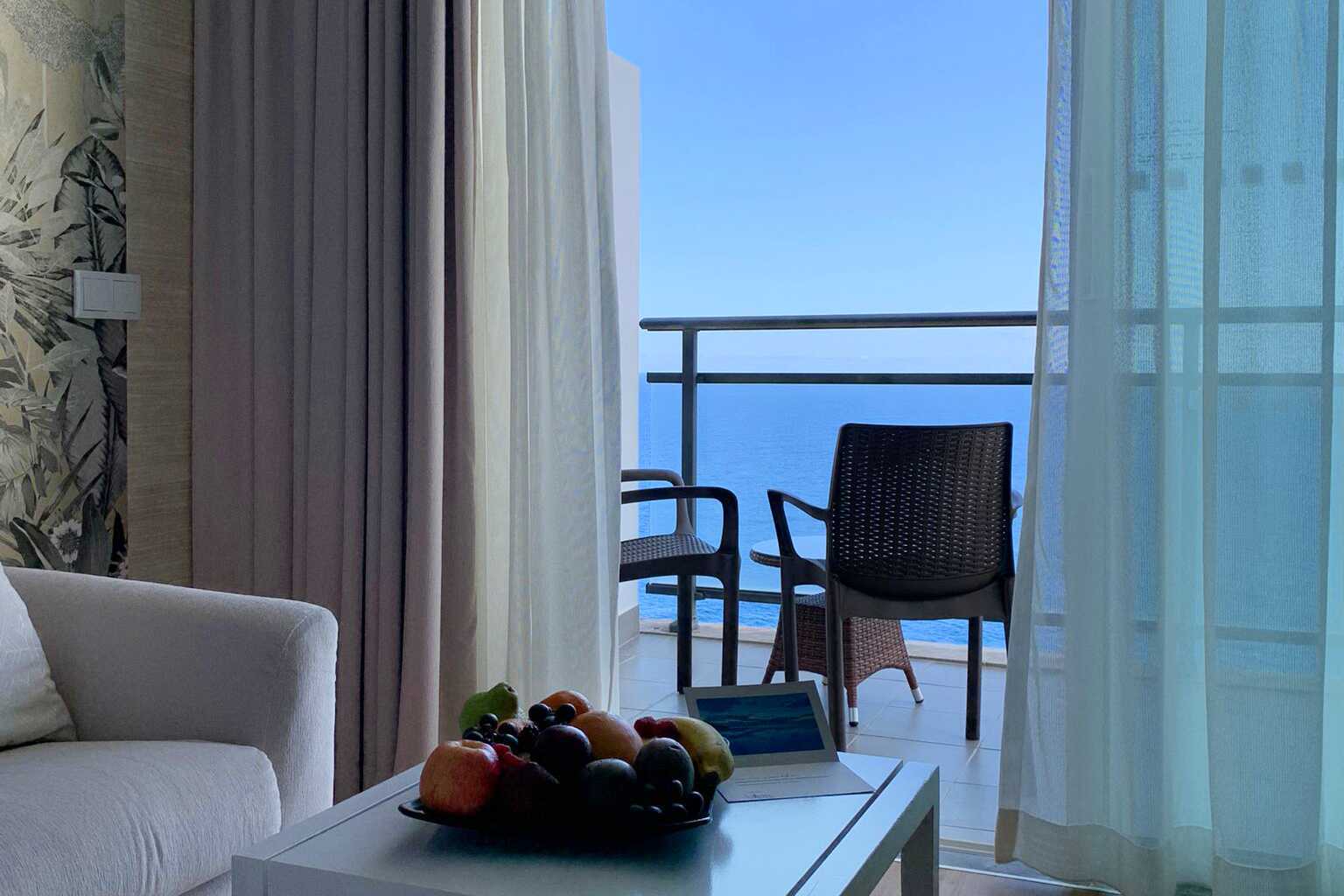 Suite met balkon en uitzicht op zee. De suite bestaat uit een slaapkamer met een tweepersoonsbed en een woonkamer met een zithoek. Suites bevinden zich op de 9e of 10e verdieping. Wifi (verbinding varieert afhankelijk van de locatie van de suite binnen het hotel), airconditioning en kluisje inbegrepen. Koelkast. Elektrische waterkoker en koffie en thee. Tv met internationale zenders. Badjassen en hotelslippers. Föhn. Badkamer met bad en toilet. Schoonmaak 7 keer/week. Kinderen jonger dan twee jaar zijn inbegrepen bij het maximum aantal personen in de suite. Roken op het balkon is niet toegestaan.