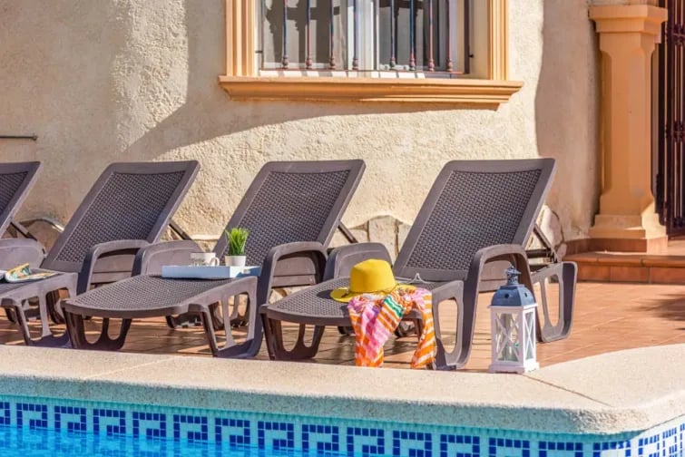 Buiten vindt u een privézwembad van 8 x 4 meter, met ligstoelen waar u heerlijk kunt zonnen. Een geweldige extra van deze villa is het overdekte terras waar alle gasten kunnen zitten. Hier vindt u ook een barbecue en een buitenkoelkast om belangrijke drankjes lekker koel te houden. Direct naast het zwembad ligt een extra gedeelte van de tuin waar u heerlijk kunt eten of ontspannen.
