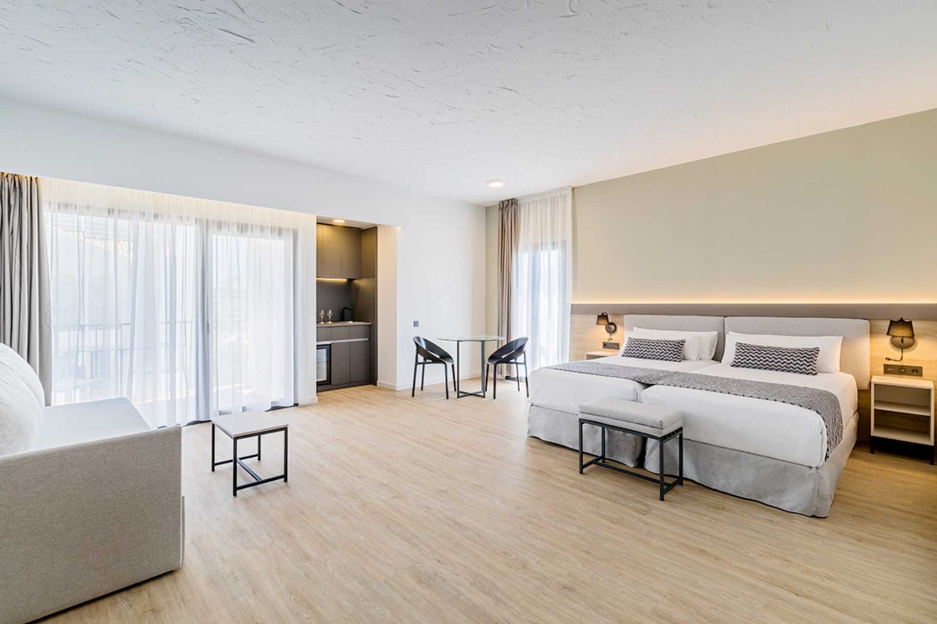 Superior kamer met balkon. Slaapkamer gecombineerd met kitchenette. Eén tweepersoonsbed of twee éénpersoonsbedden. Gratis wifi en airconditioning. Kluisje tegen betaling. Kitchenette met koelkast, kookplaten, waterkoker en eenvoudig keukengerei. TV met satellietkanalen. Föhn. Badkamer met douche en toilet. Schoonmaak 7 keer/week.
