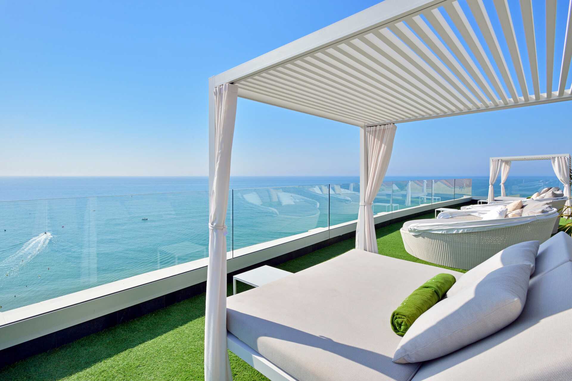 Deluxe kamer met balkon en uitzicht op zee. De kamers bevinden zich op de verdiepingen 4 t/m 9. Een tweepersoonsbed of twee eenpersoonsbedden. Mogelijkheid voor een extra bed in een eenpersoonsbed. Wifi, airconditioning en kluis inbegrepen. Minibar. Waterkoker en koffie en thee. TV met internationale zenders. Föhn. Badkamer met douche en wc. Schoonmaak 7 keer/week. Kinderen jonger dan twee jaar zijn inbegrepen in het maximale aantal personen in de kamer.