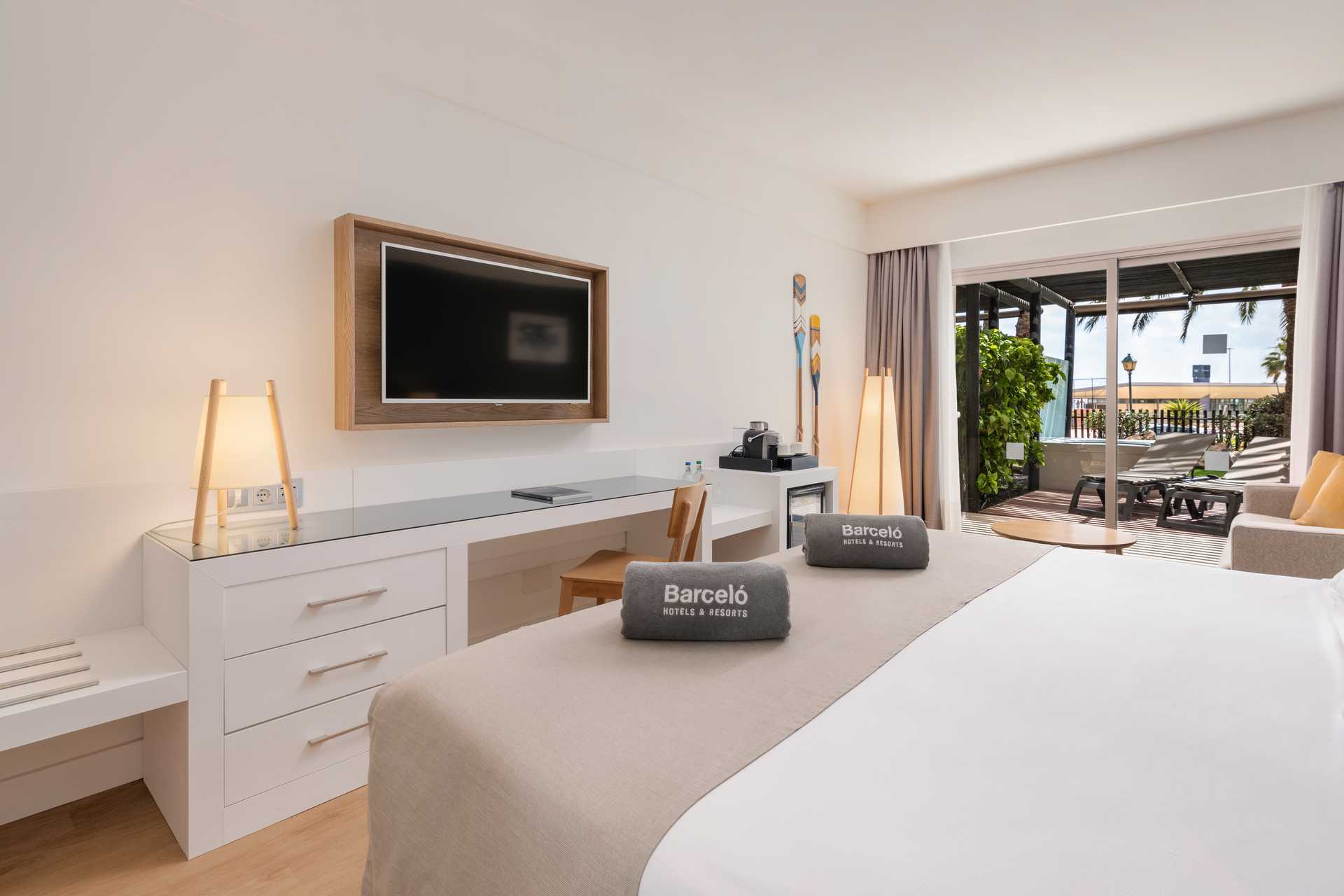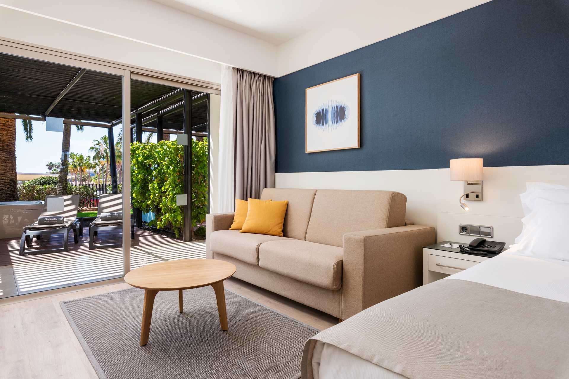 Deluxe kamer met privéjacuzzi op het begane grondterras. Het terras heeft een overkapping als zonwering en ligstoelen. Een tweepersoonsbed of twee eenpersoonsbedden. Kussenmenu. Mogelijkheid voor extra bedden op de slaapbank. Wifi, airconditioning en kluis inbegrepen. Minibar tegen betaling. Waterkoker en koffie en thee. Televisie met internationale zenders. Badjassen en slippers Föhn. Badkamer, gedeeltelijk open naar de kamer, met aparte douche en toilet. Schoonmaak 7 keer/week.