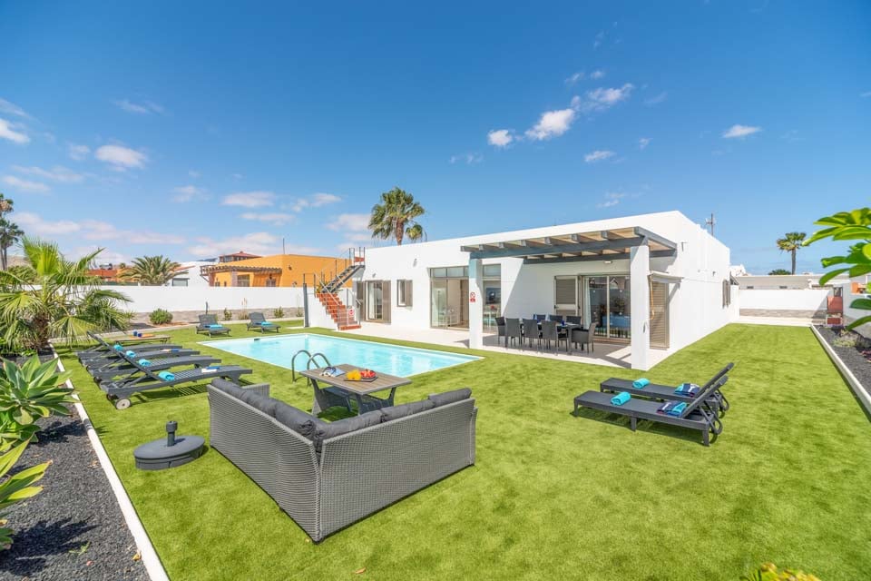 Waag de sprong en neem een heerlijk bad in je eigen privézwembad. Omgeven door een kunstgrasveld vormt het helderblauwe water een schril contrast en nodigt het je uit om een duik te nemen. Geniet optimaal van de heerlijke ochtendzon met een duik in het zwembad in de vroege uurtjes, of kies voor een gezellige middag met je dierbaren, door spelletjes te spelen en je te vermaken met opblaasbare speeltoestellen. Geniet van de zon op de ligstoelen en werk aan je kleurtje wanneer je maar wilt; de zon op Fuerteventura staat het hele jaar door voor je klaar, ongeacht wanneer je het eiland bezoekt.