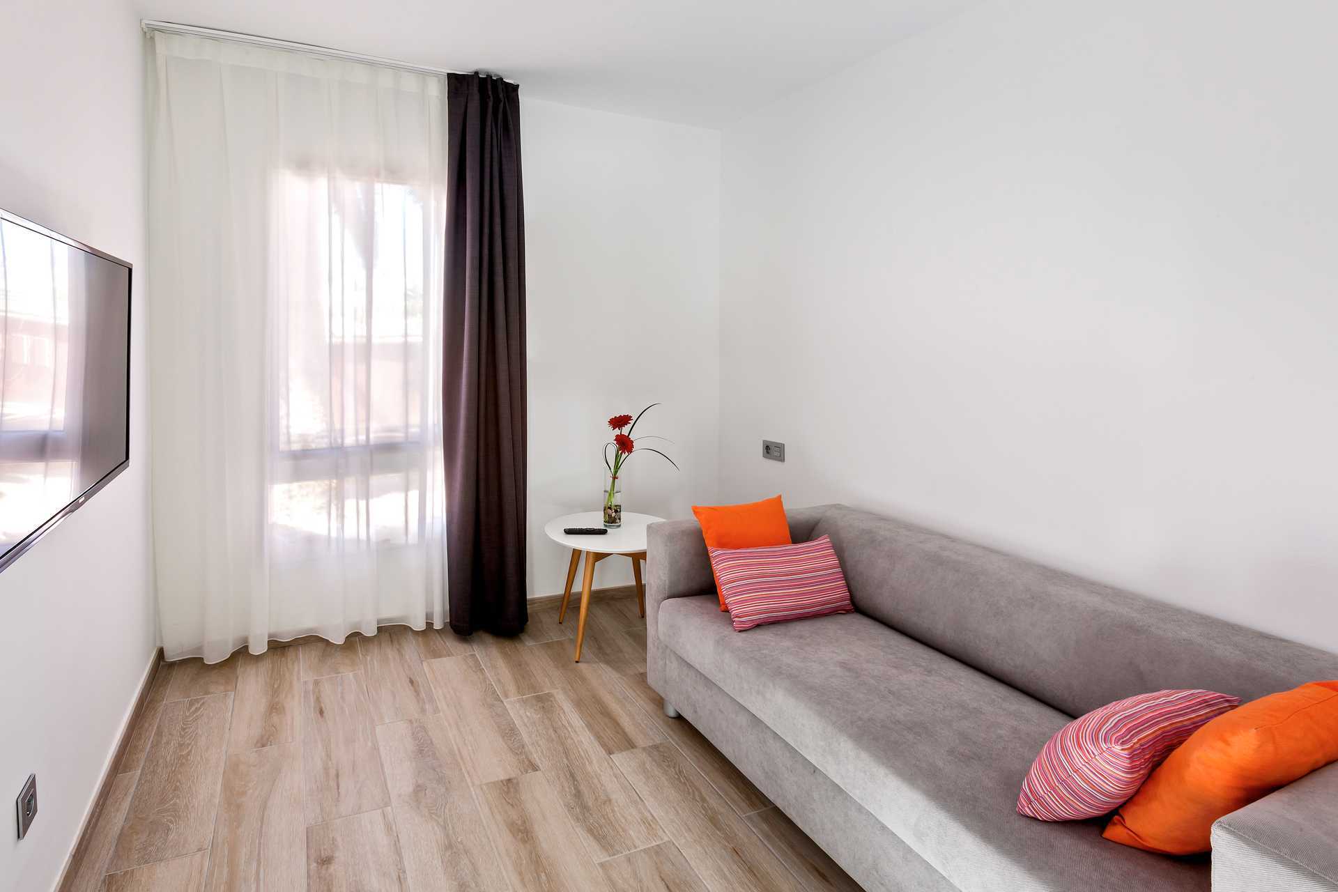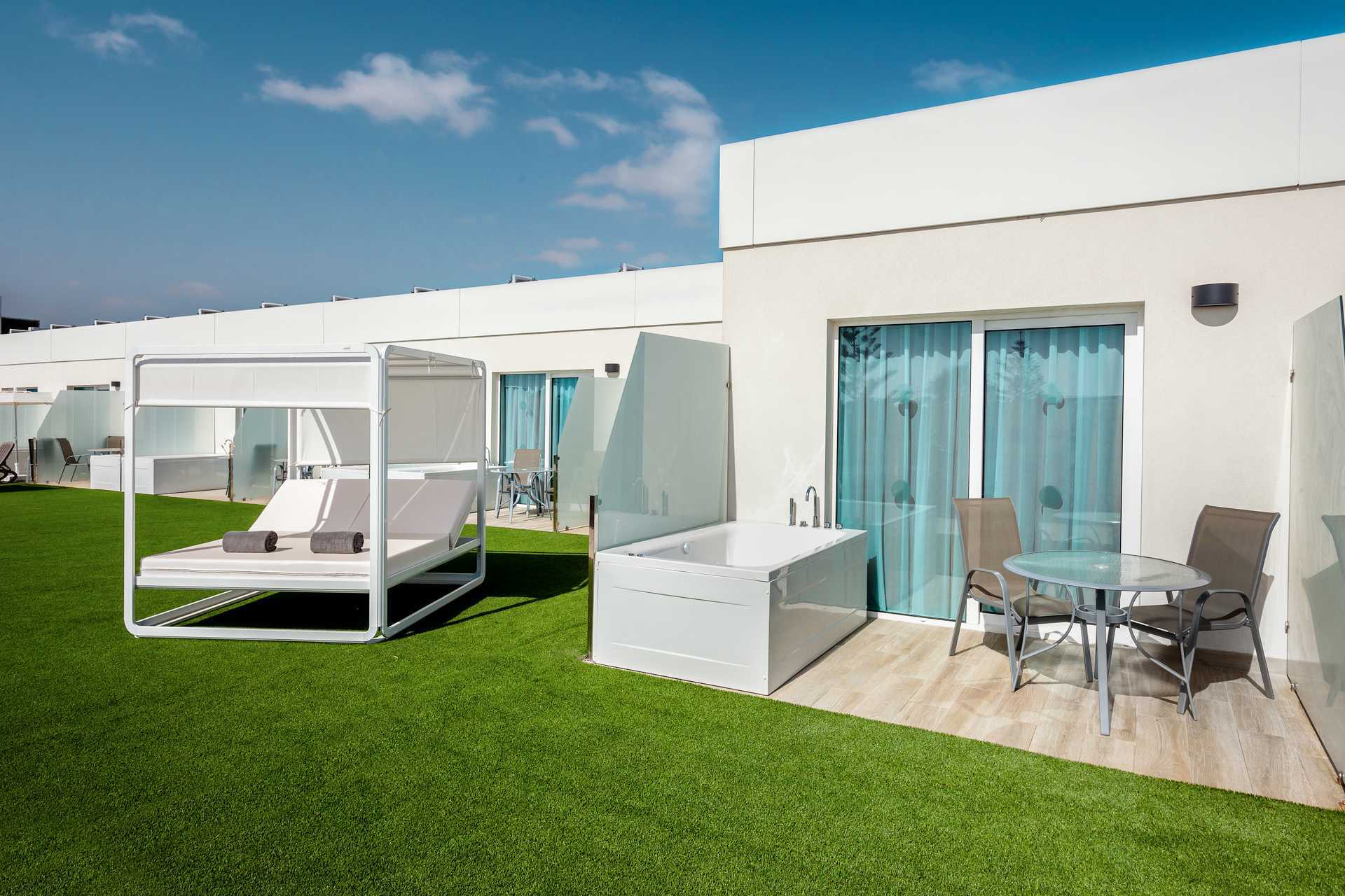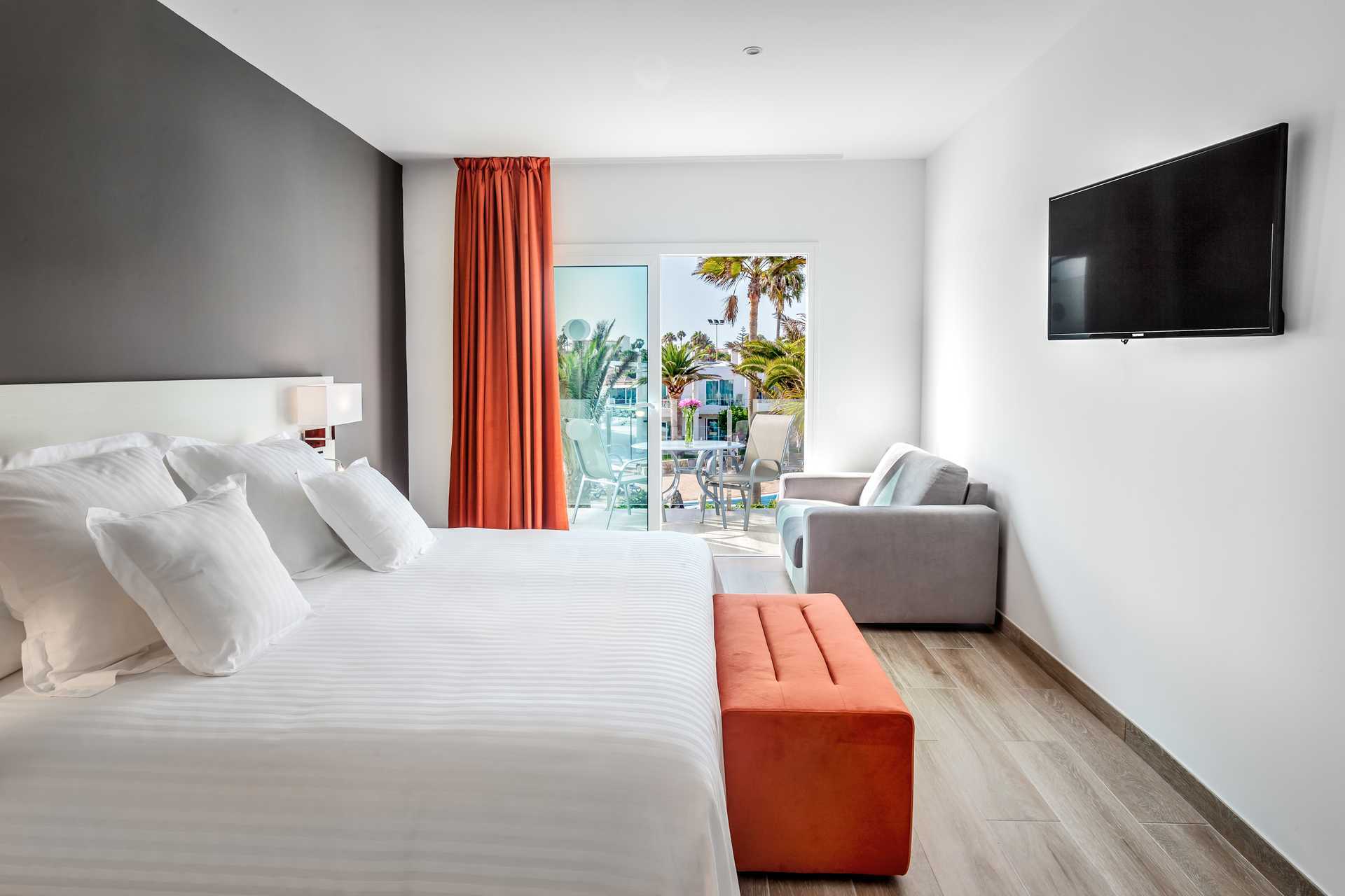 Suite met terras op de begane grond of met balkon of terras. Sommige balkons of terrassen bieden uitzicht op het zwembad. De suites bestaan uit een slaapgedeelte en een woonkamergedeelte zonder deur tussen de delen. Twee eenpersoonsbedden. Mogelijkheid voor een extra bed op de slaapbank. Wifi en airconditioning inbegrepen. Kluisje tegen betaling. Koelkast. Waterkoker en koffie en thee. Föhn. Badkamer met douche en toilet. Schoonmaak 7 keer/week. Kinderen jonger dan twee jaar zijn inbegrepen in het maximale aantal personen in de kamer. In dit hotel worden volwassenen geteld vanaf 13 jaar.
