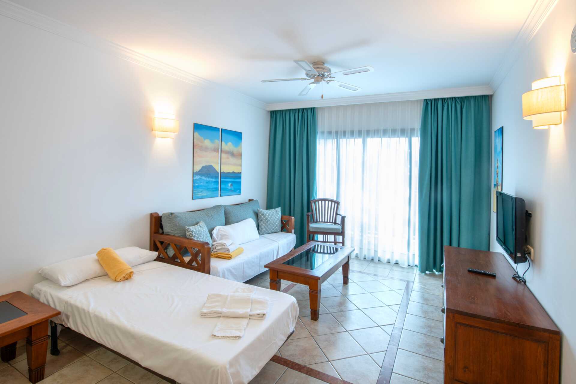 Tweekamerappartement met balkon of terras. Slaapkamer en gecombineerde woonkamer met kitchenette. Twee eenpersoonsbedden. Mogelijkheid voor extra bedden in slaapbank. Minikeuken met kookplaten, koelkast met vriesvak, magnetron, koffiezetapparaat, waterkoker, broodrooster en eenvoudige keukenapparatuur. Wifi inbegrepen. Kluis tegen betaling. Plafondventilator in de slaapkamer. TV met lokale zenders. Föhn. Badkamer met douche en wc. Schoonmaak 5 keer/week.