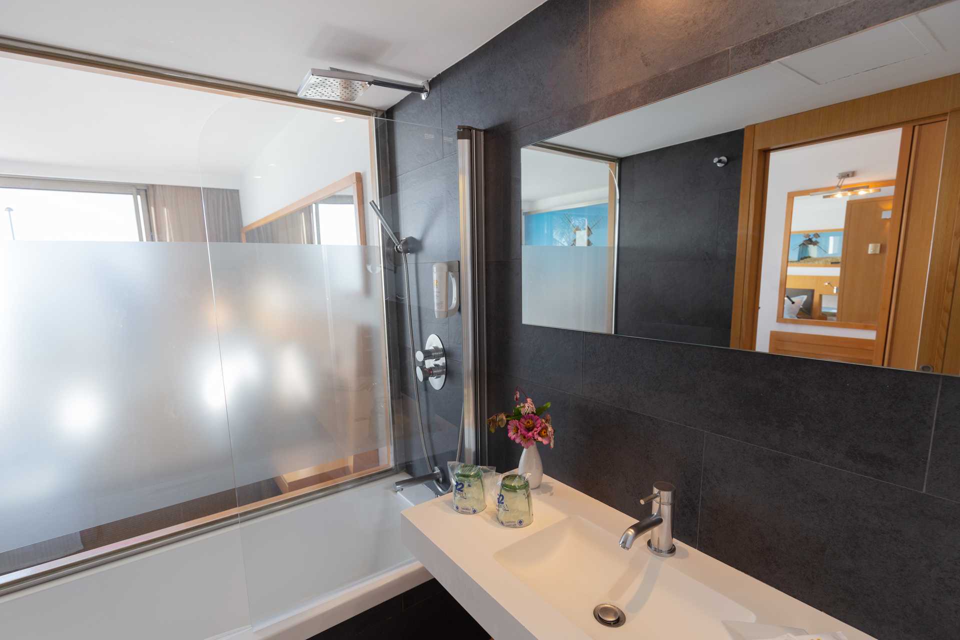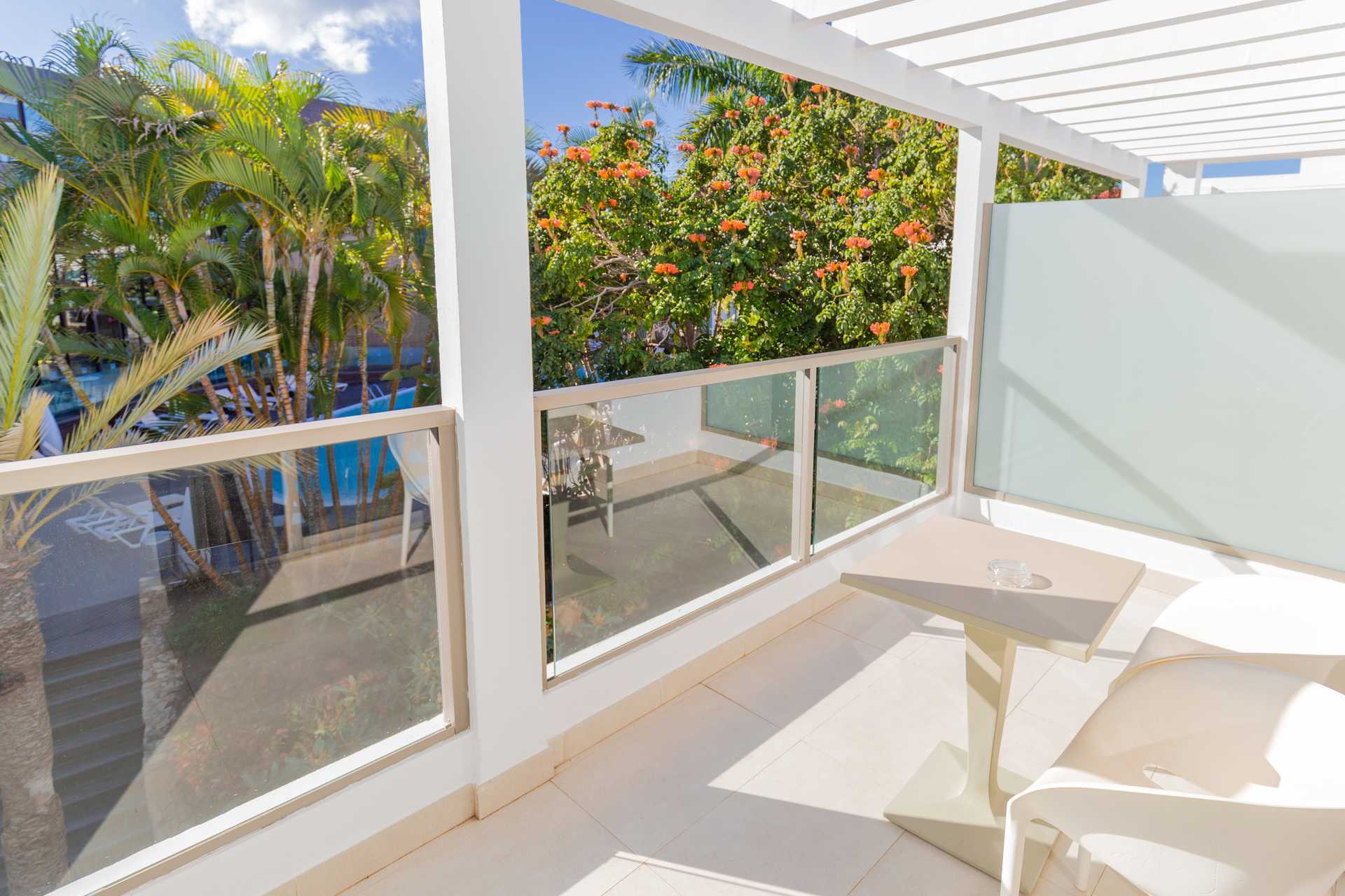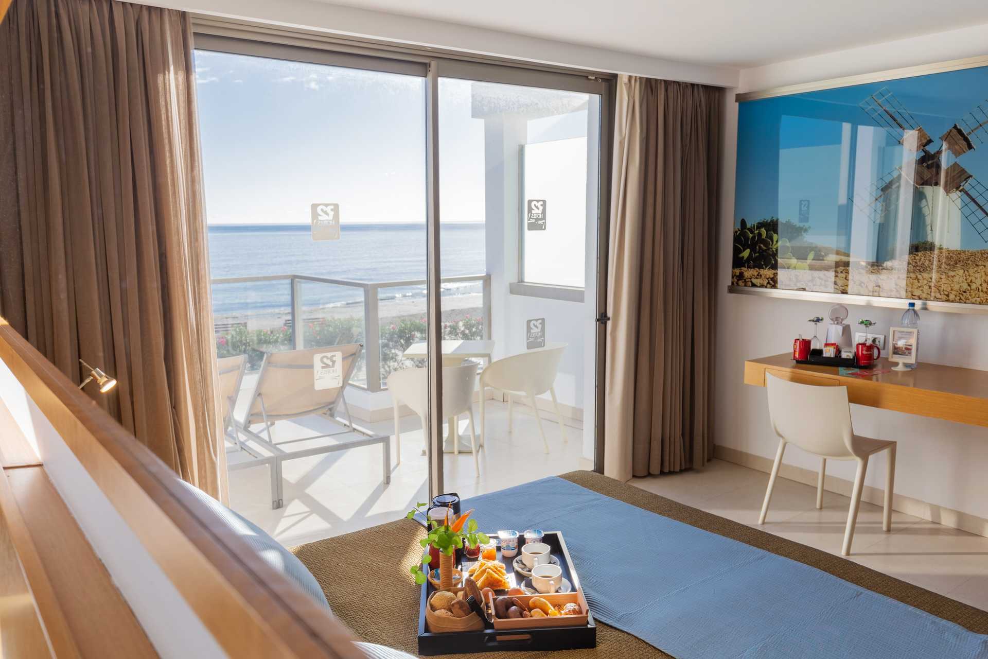 Junior suite met Balkon of terras en met Zwembadzicht of met Zeezicht. De Junior Suite met zeezicht beschikt over twee ligstoelen op het balkon. Zitgroep. Wifi en centraal geregelde airconditioning inbegrepen. Kluisje tegen betaling. Twee eenpersoonsbedden. Minibar. Tv met internationale zenders. Föhn. Badkamer met bad of douche en toilet. Matglazen wand tussen de badkamer en slaapkamer. Schoonmaak 7 keer/week.