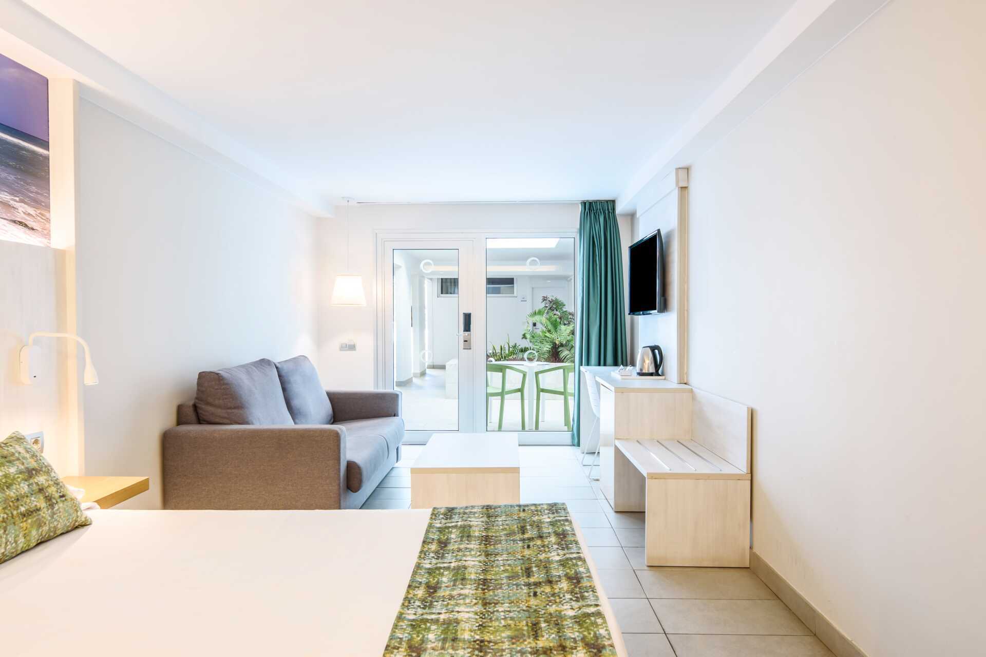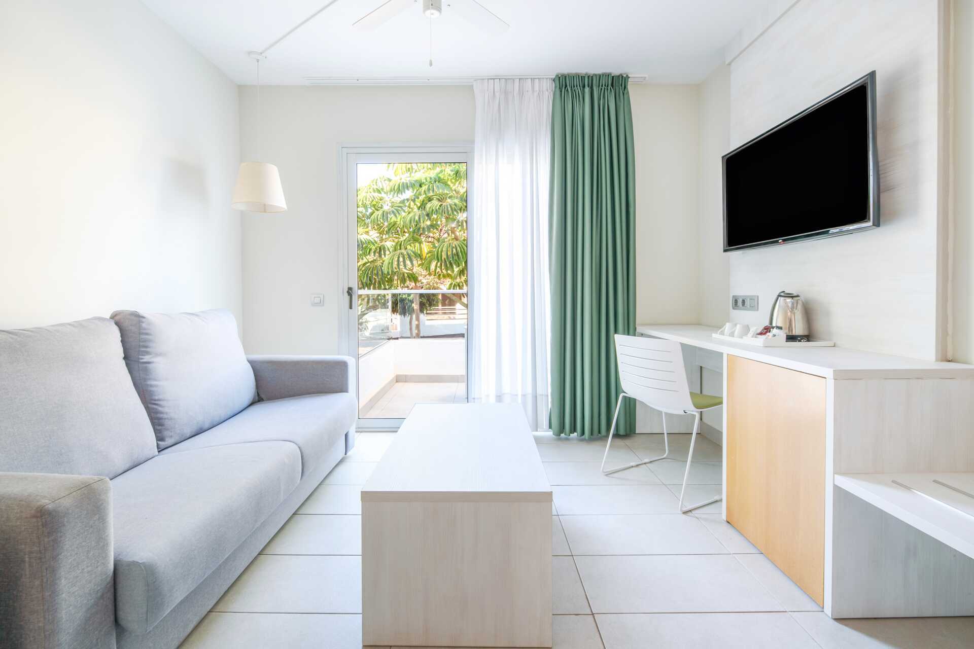 Junior suite met balkon, sommige met beperkt zeezicht, sommige op de verdieping. De standaard juniorsuite bestaat uit een slaapgedeelte met twee eenpersoonsbedden en een woongedeelte met een slaapbank. De junior suite verdieping bestaat uit een woonkamer met twee eenpersoonsbedden en een badkamer op de begane grond en boven is er een slaapbank voor extra bedden - geen deur tussen de verdiepingen. Wifi, airconditioning en kluis inbegrepen. Tv met internationale zenders. Elektrische waterkoker en koffie en thee. Föhn. Badkamer met douche en toilet. Schoonmaak 7 keer / week.