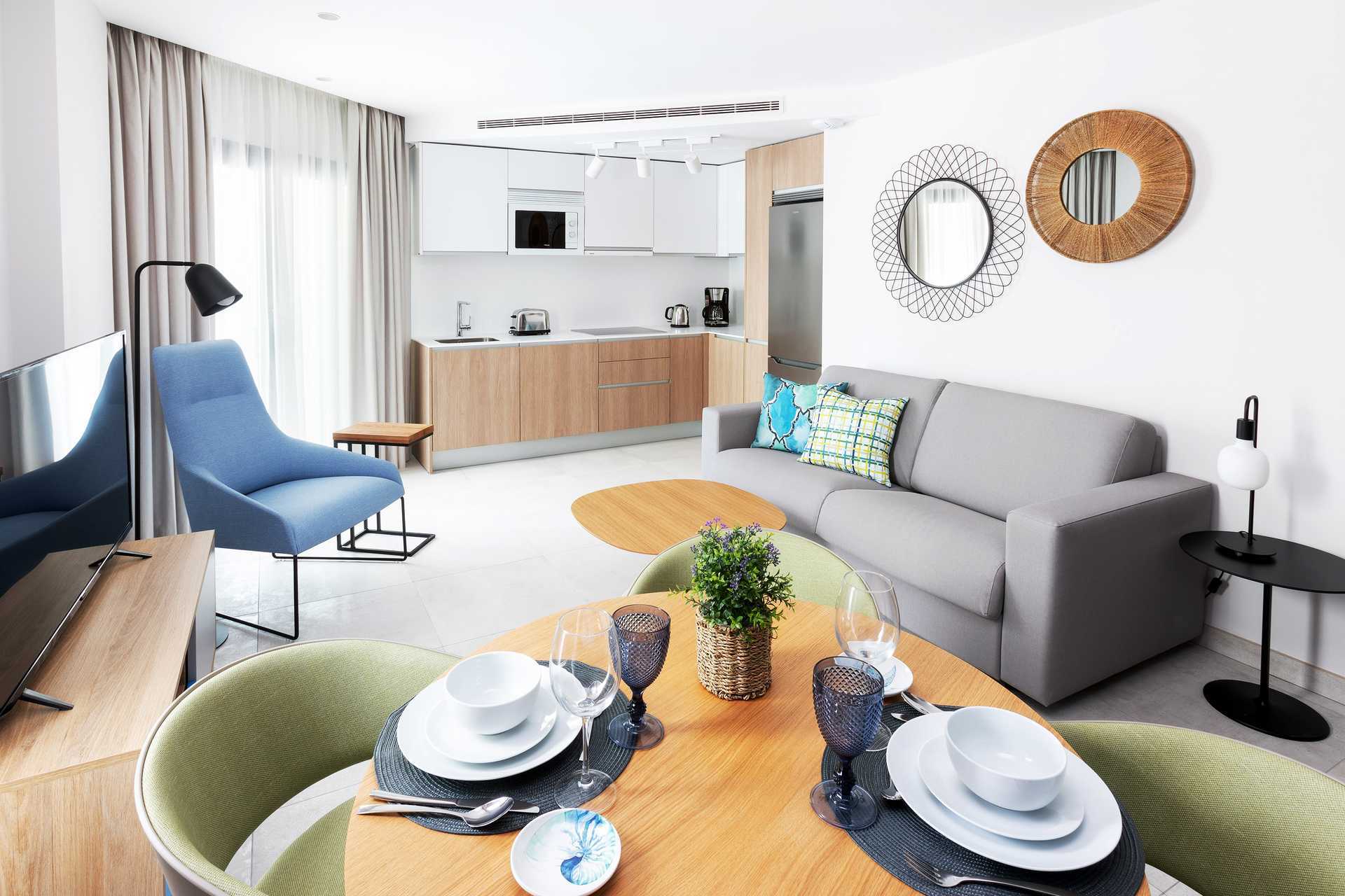 Tweekamerappartement met balkon of terras. Slaapkamer en gecombineerde woonkamer met kitchenette. Een tweepersoonsbed of twee eenpersoonsbedden. Minikeuken met kookplaten, koelkast, magnetron, broodrooster, waterkoker, koffiezetapparaat en basis keukengerei, en een vaatwasser. Wifi, kluisje en airconditioning inbegrepen. Tv met lokale zenders. Wasmachine en droger. Strijkijzer en strijkplank. Föhn. Badkamer met douche en toilet. Bij aankomst wordt het appartement schoongemaakt. Tijdens je verblijf vindt er geen schoonmaak meer plaats. Bij een verblijf van twee weken wordt het appartement na één week schoongemaakt.