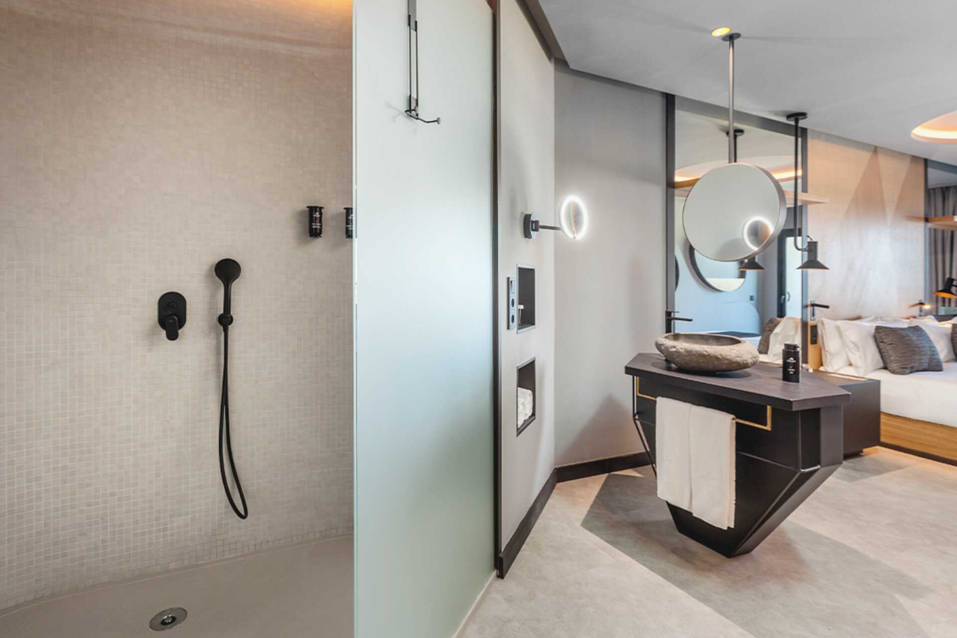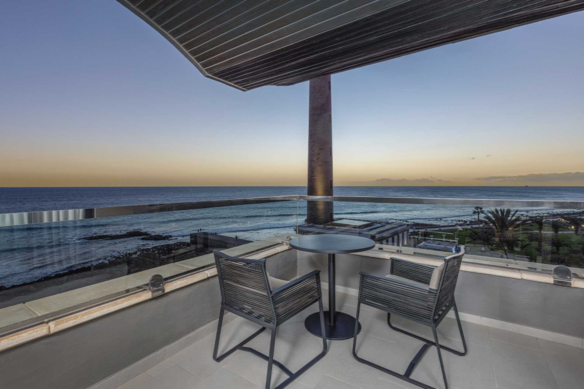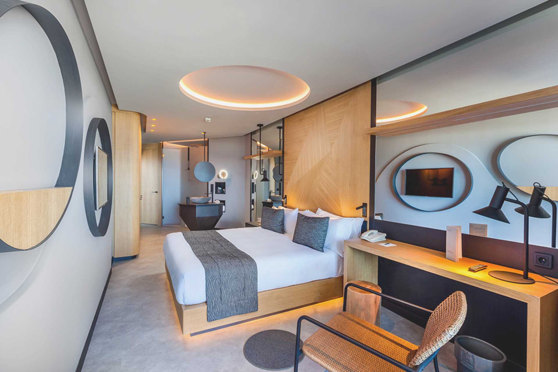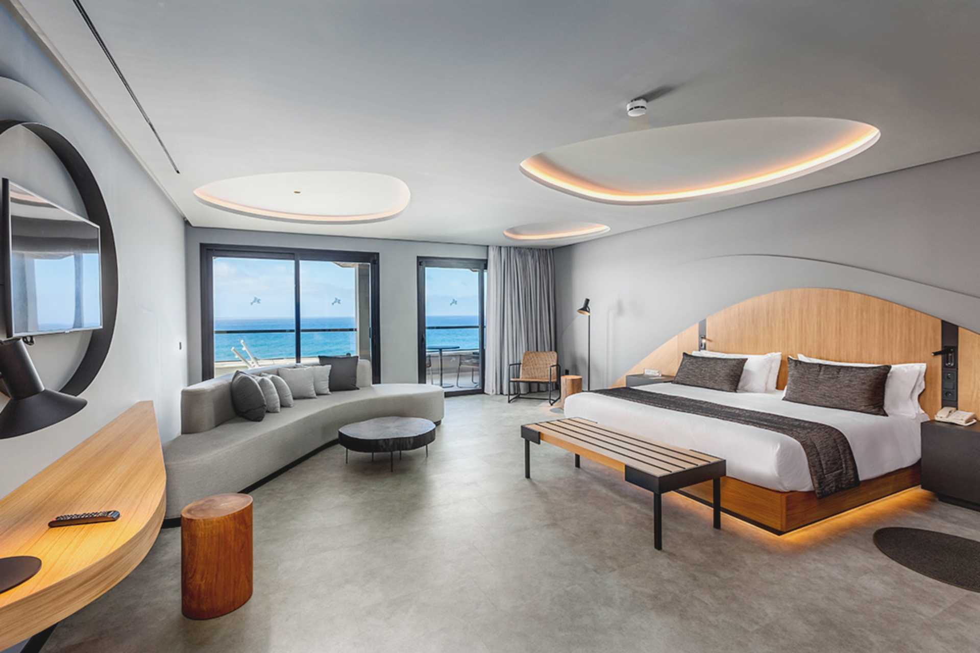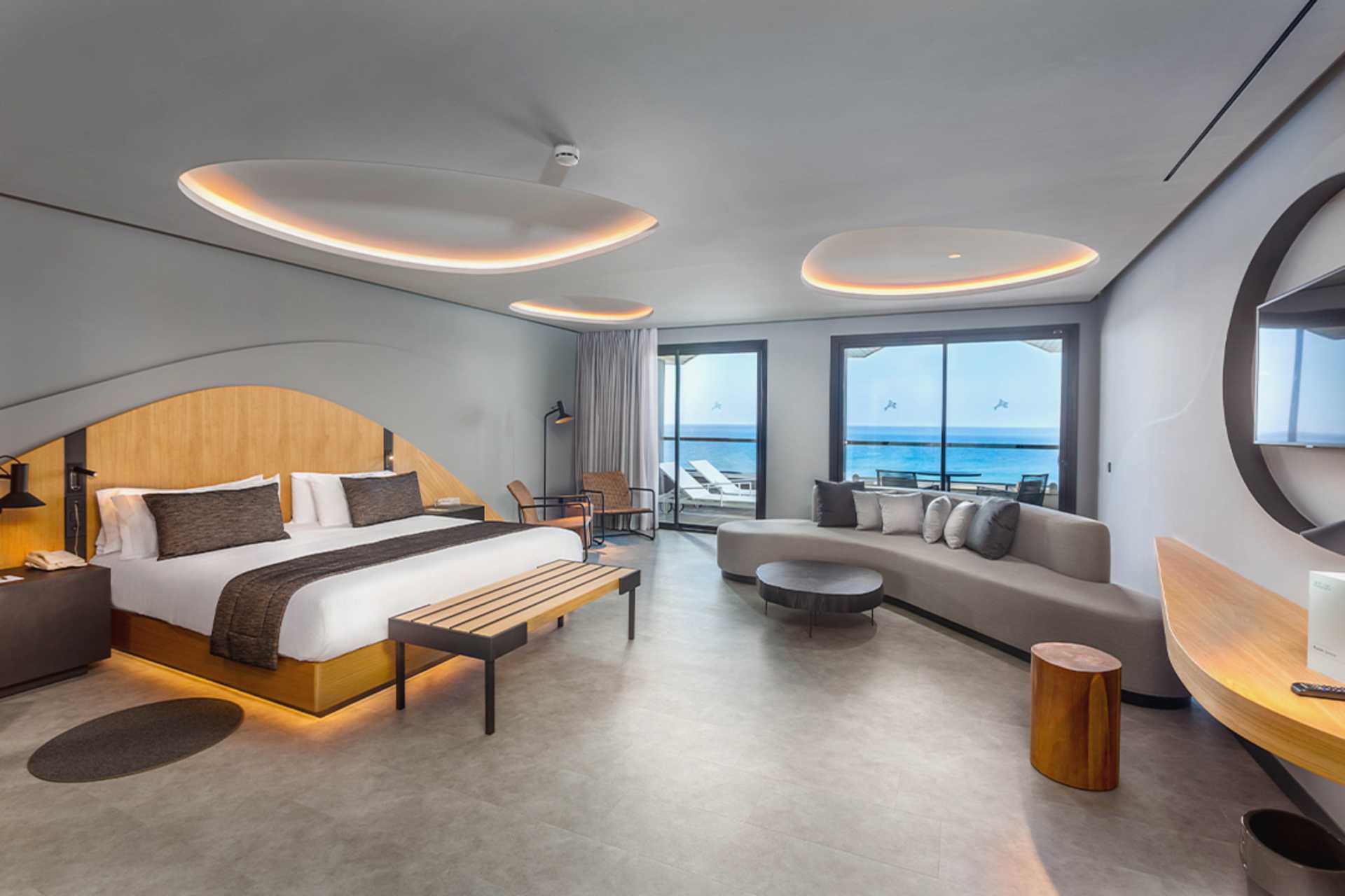 Junior suite met balkon en beperkt zeezicht. Ligstoelen op het balkon. Een tweepersoonsbed. Wifi, airconditioning en kluisje inbegrepen. Bank. Minibar. Nespresso-apparaat - capsules inbegrepen. Waterkoker. Tv met internationale zenders. Badjassen en hotelslippers. Föhn. Badkamer, gedeeltelijk open naar de kamer, maar met douche en toilet achter matglazen deuren. Schoonmaak 7 keer/week.