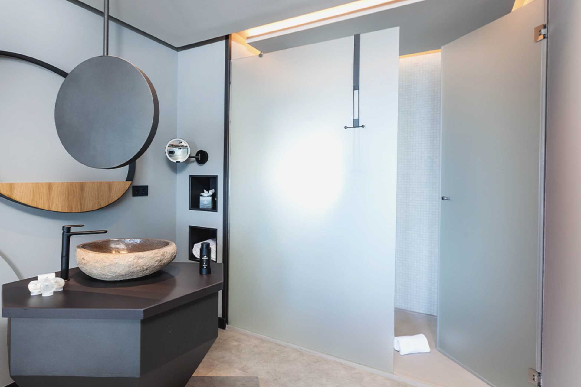 Superior kamer met balkon, sommige met beperkt uitzicht op zee. Een tweepersoonsbed. Wifi, airconditioning en kluis inbegrepen. Slaapbank. Minibar. Nespresso koffiezetapparaat - capsules inbegrepen. Waterkoker. Tv met internationale zenders. Badjassen en slippers. Föhn. Badkamer, deels open naar de kamer, maar met douche en toilet achter matglazen deuren. Schoonmaak 7 keer / week.