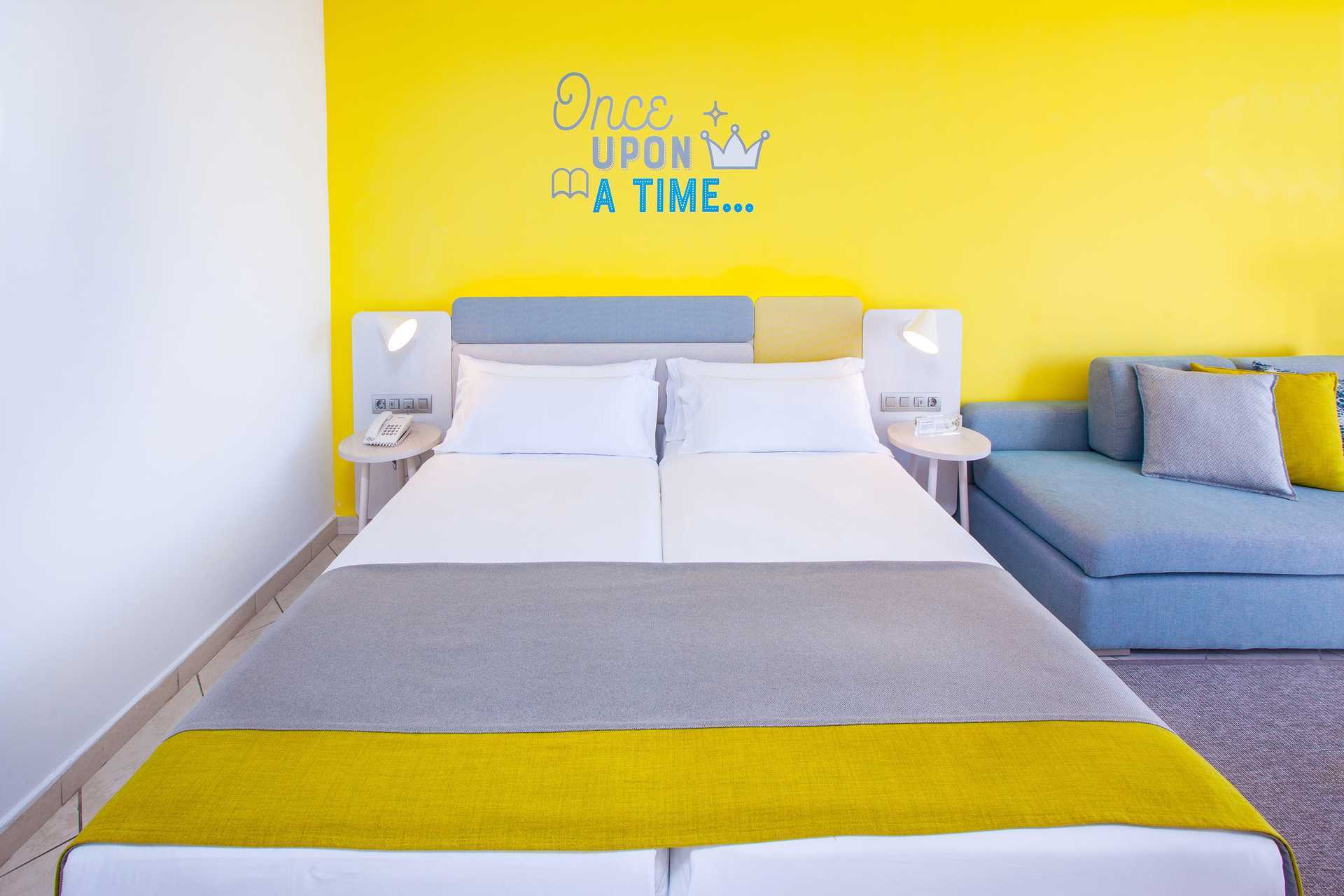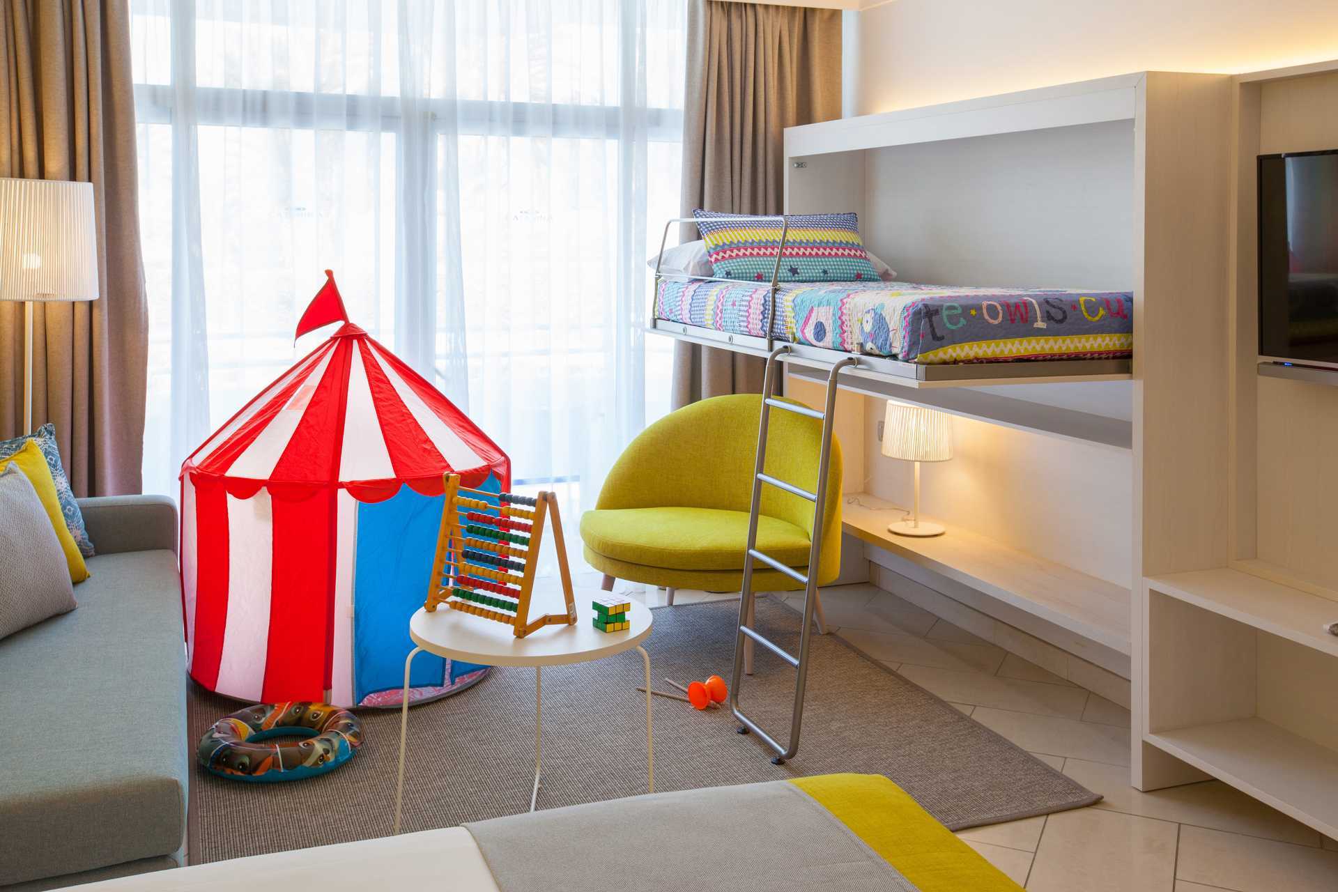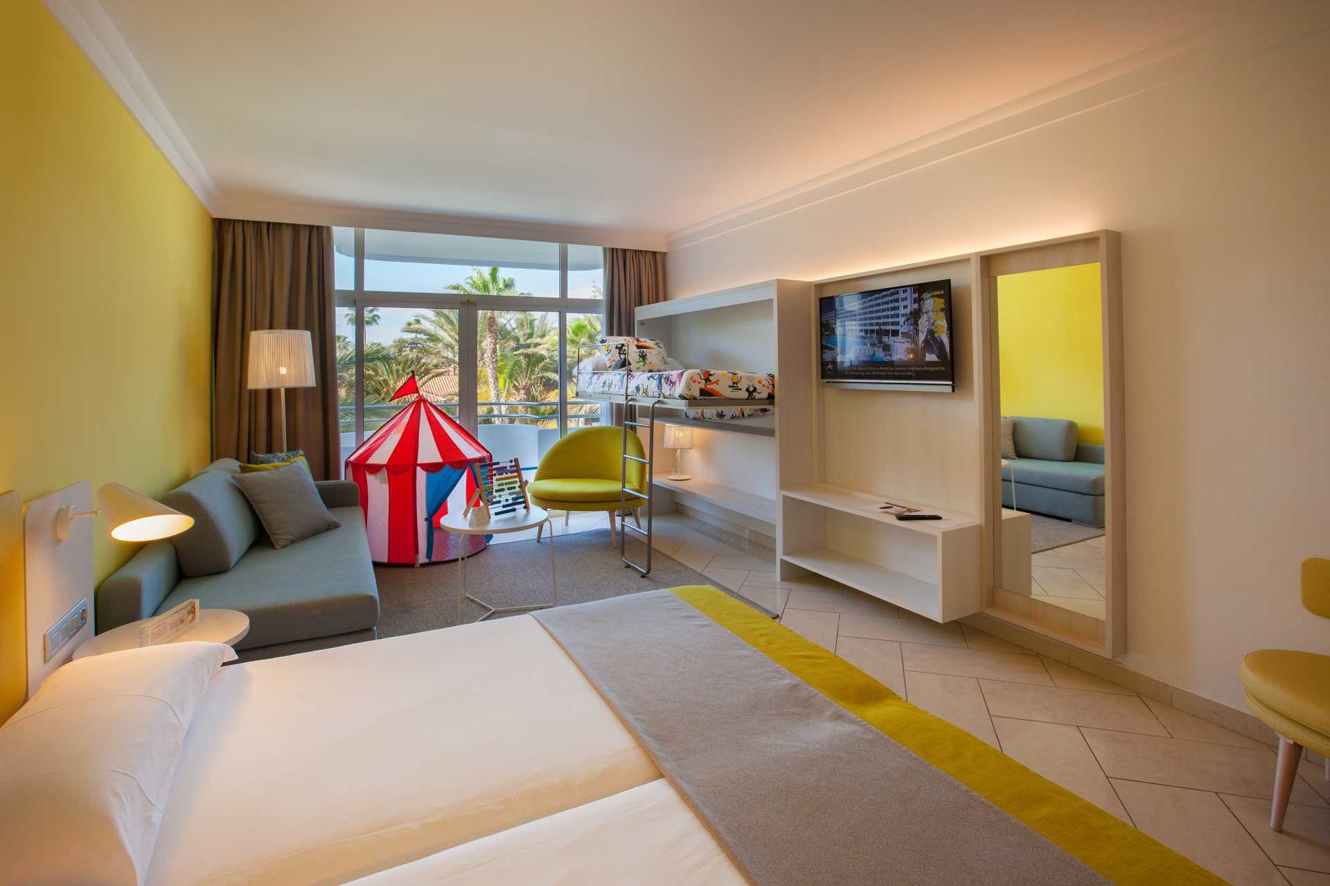 Familiekamer met een patio en directe toegang tot een kinderzwembad. Op het terras staan tafels en stoelen, evenals ligbedden. Twee eenpersoonsbedden. Mogelijkheid voor extra bedden op een slaapbank of in een stapelbed. Centraal geregelde airconditioning is inbegrepen in de zomer en, indien nodig, in de winter. Wifi inbegrepen. Kluis tegen betaling. Minibar tegen betaling. Waterkoker en koffie en thee. Bij aankomst staat er een grote fles water op de kamer. TV met internationale zenders. Föhn. Badkamer met douche en wc. Schoonmaak 7 keer/week. Kinderen jonger dan twee jaar zijn inbegrepen in het maximale aantal personen in de kamer.