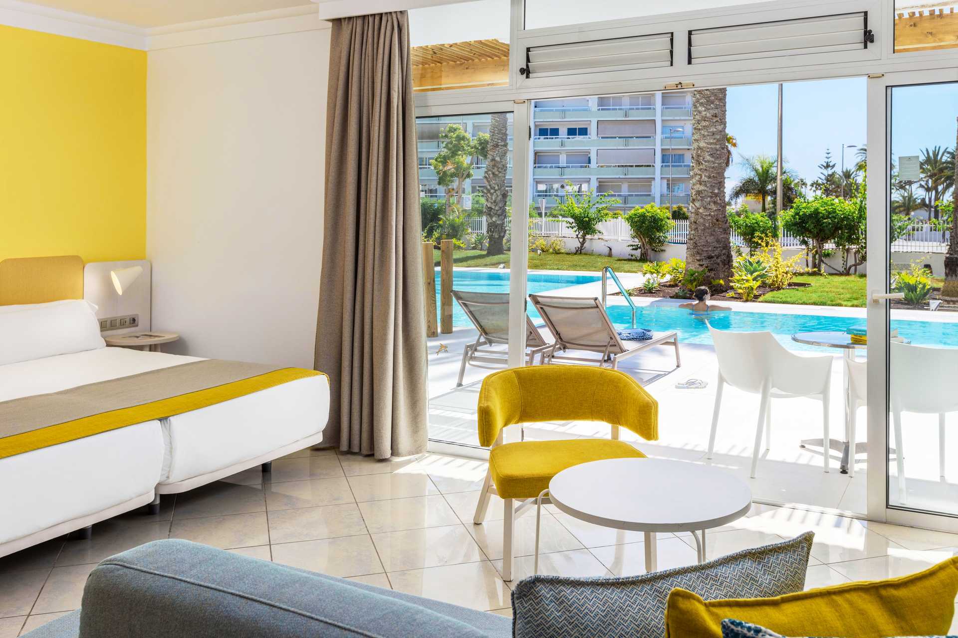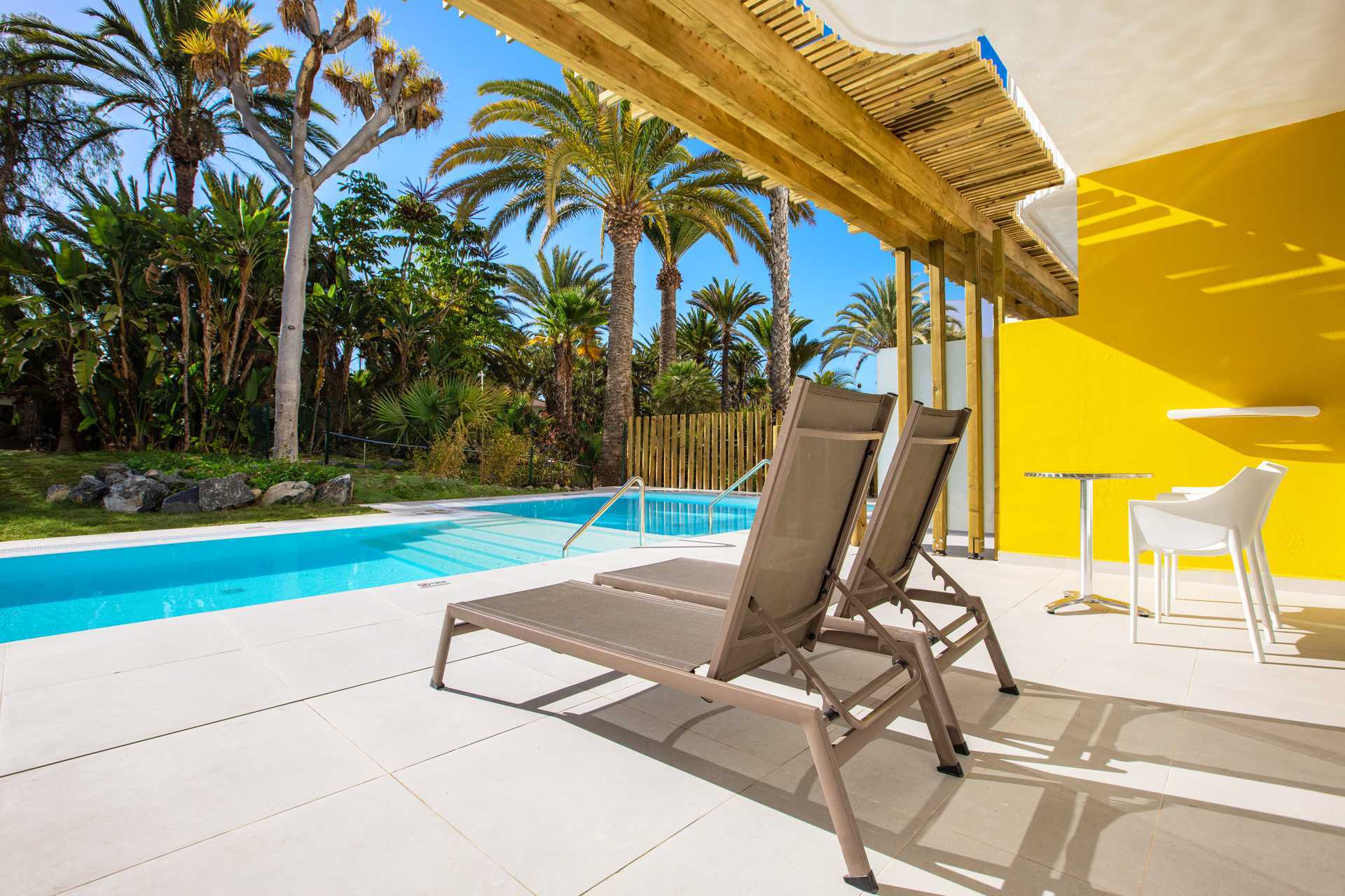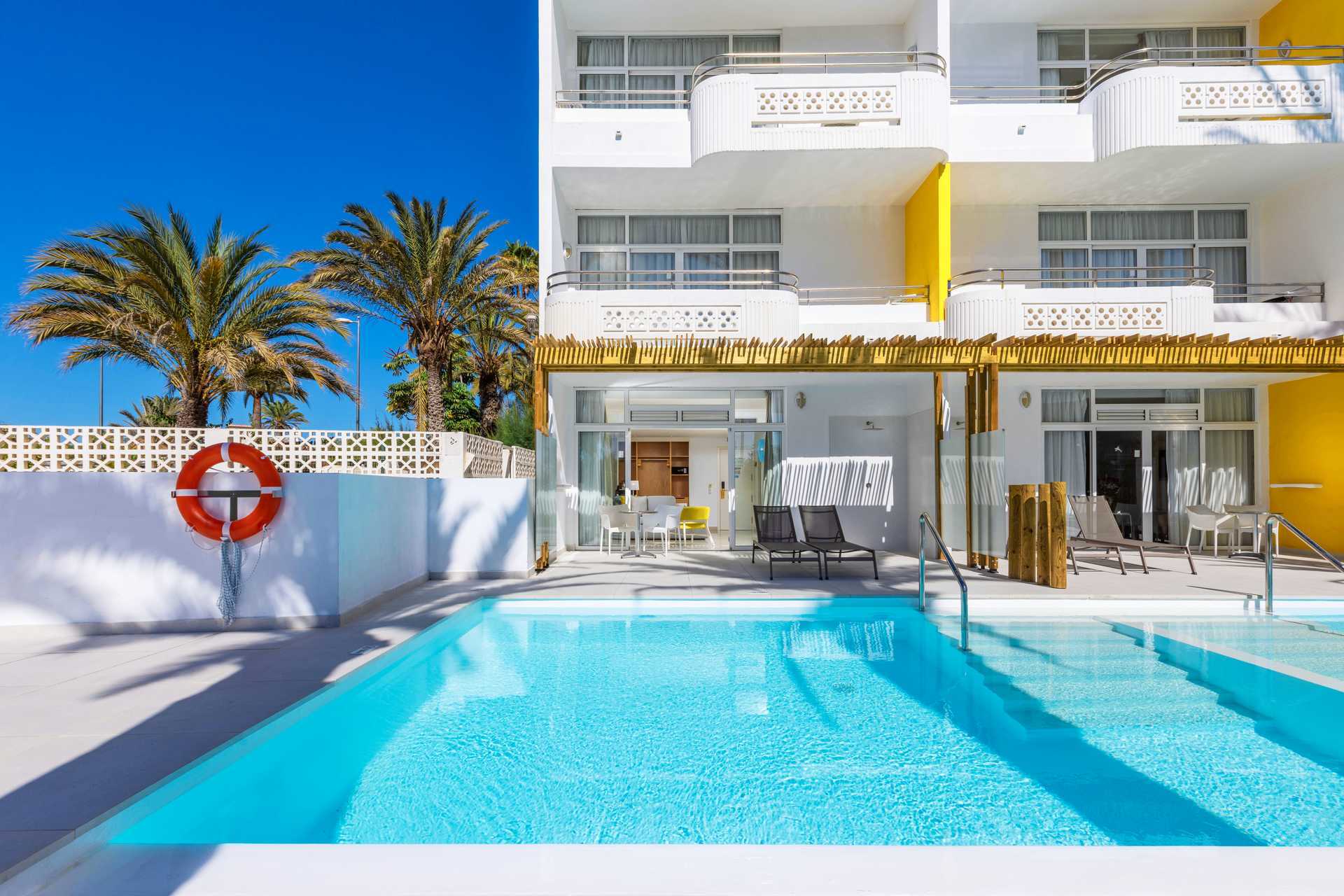 Tweepersoonskamer met terras op de begane grond en privézwembad. De minimumleeftijd voor een verblijf in de kamer is 18 jaar. Het terras heeft tafels en stoelen en ligstoelen. Ladder of trap naar beneden in het zwembad. Twee eenpersoonsbedden. Mogelijkheid voor een extra bed op de slaapbank. Centraal geregelde airconditioning is inbegrepen in de zomer en, indien nodig, in de winter. Wifi inbegrepen. Kluis tegen betaling. Minibar tegen betaling. Waterkoker en koffie en thee. Televisie met internationale zenders. Föhn. Badkamer met douche en wc. Schoonmaak 7 keer/week.