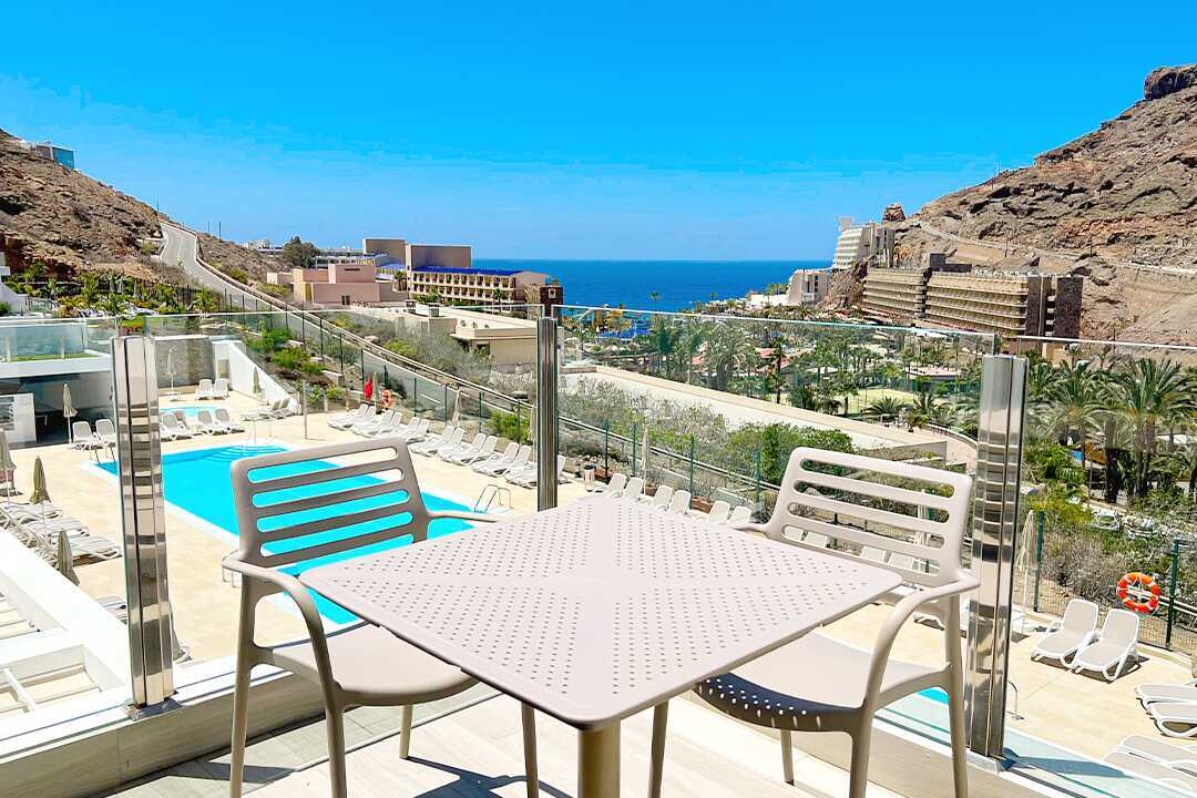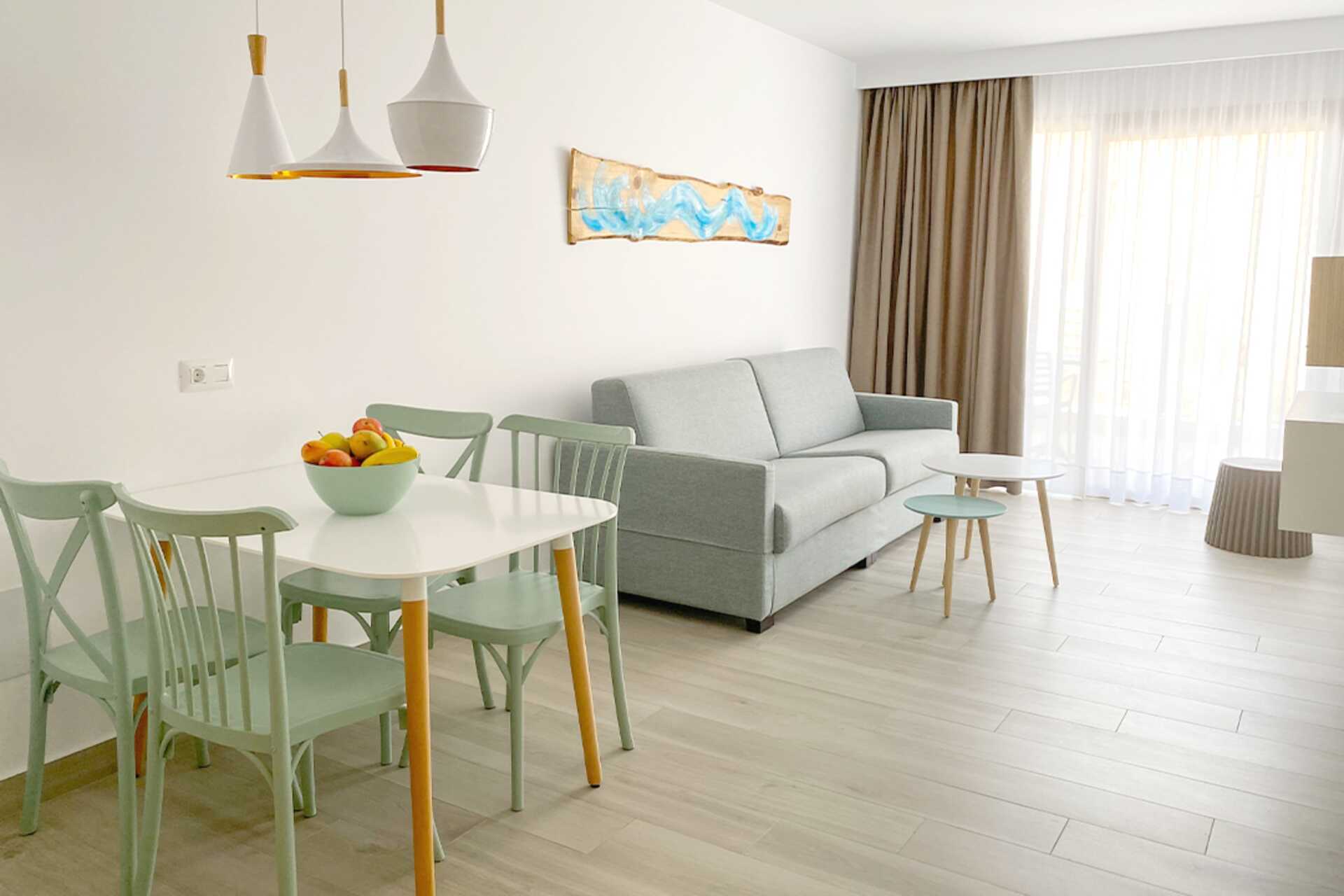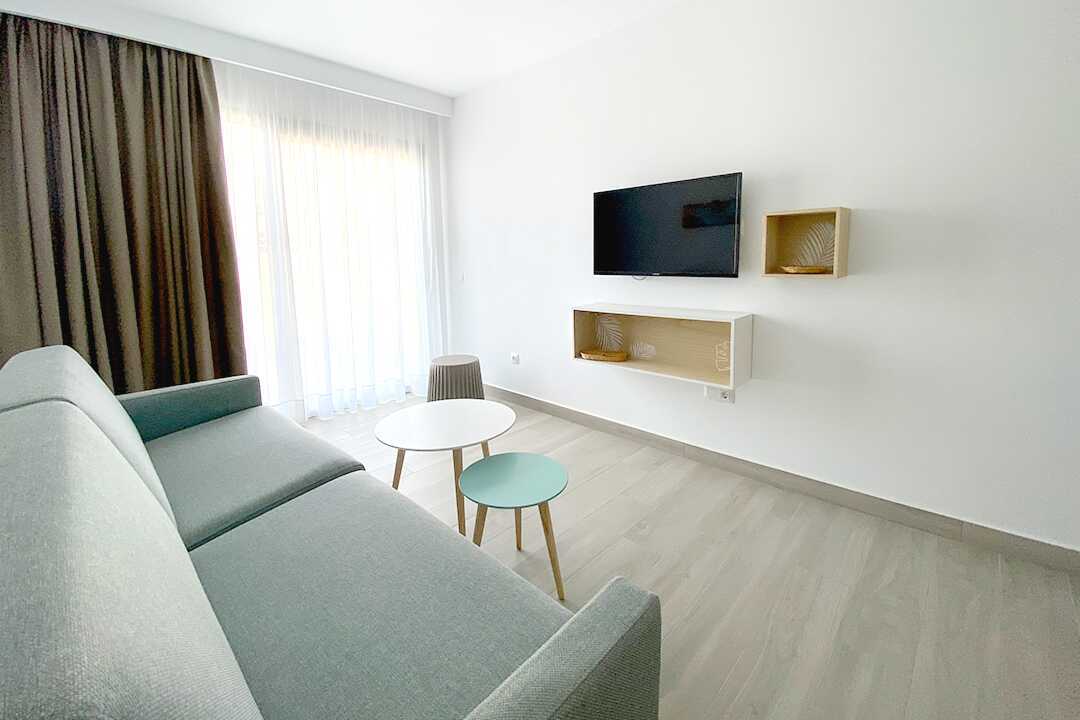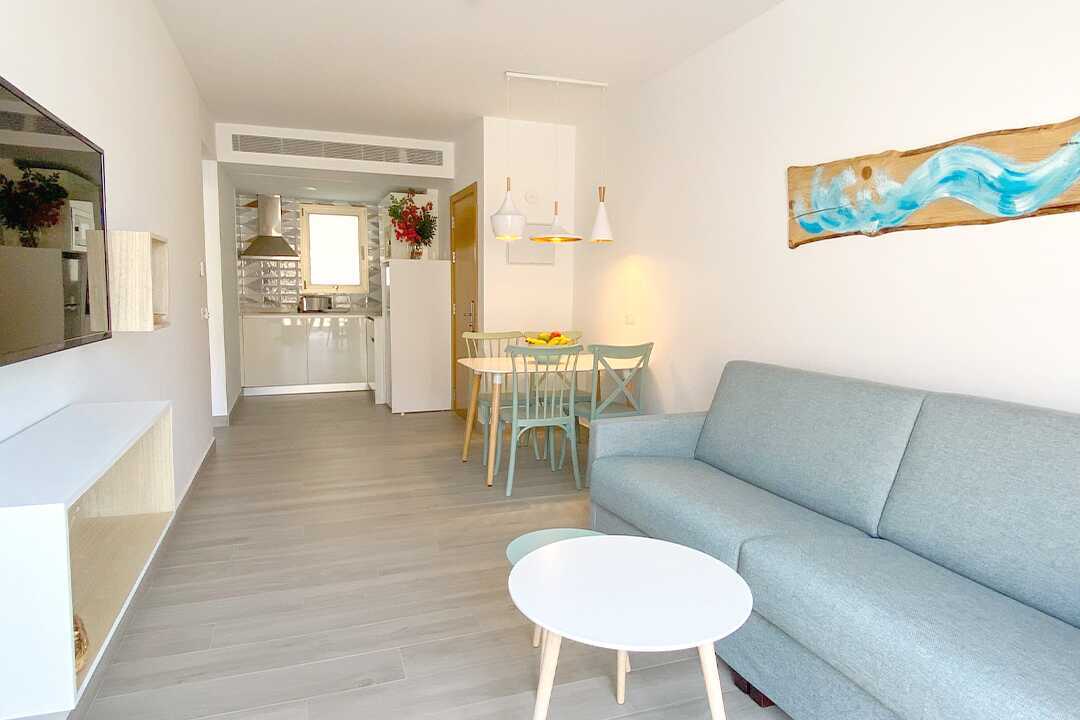 Tweekamerappartement met balkon of terras. Slaapkamer en gecombineerde woonkamer met kitchenette. Twee eenpersoonsbedden. Mogelijkheid voor extra bedden in slaapbank. Minikeuken met kookplaat, koelkast met vriesvak, magnetron, waterkoker, broodrooster, koffiezetapparaat en eenvoudige keukenapparatuur. Wifi en airconditioning inbegrepen. Kluis tegen betaling. Televisie met internationale zenders. Föhn. Badkamer met douche en wc. Schoonmaak 5 keer/week.