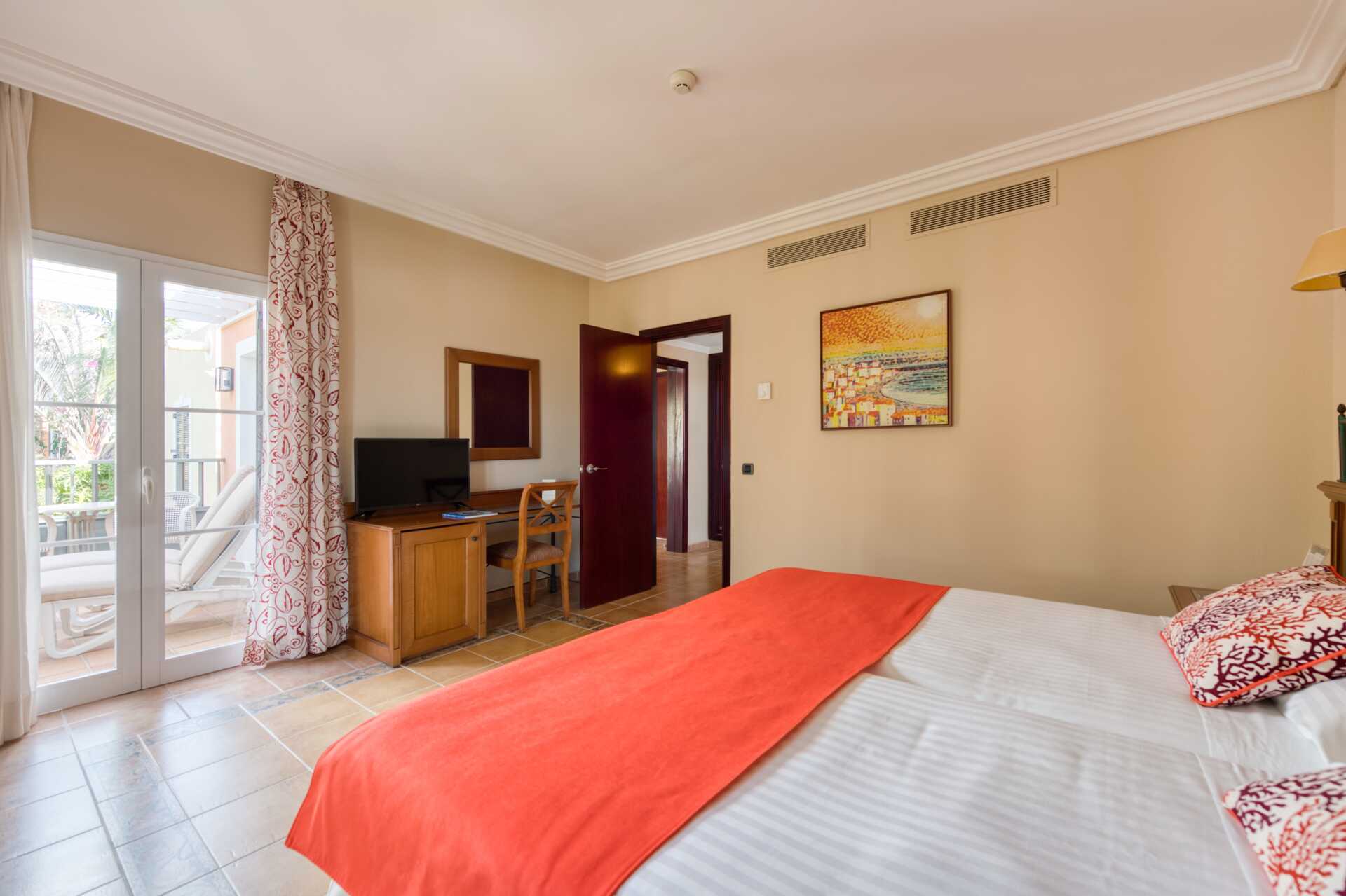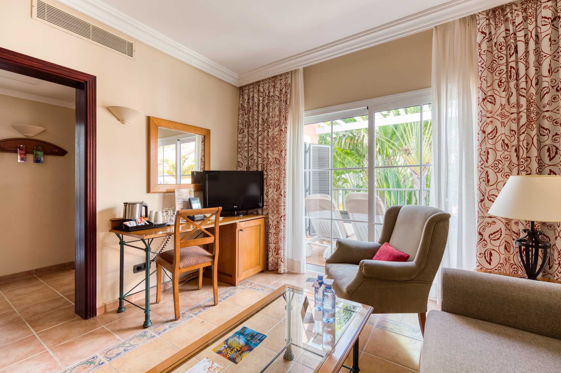 Junior suite met balkon of terras. De patio is ingericht met ligbedden, tafels en stoelen. De junior suite bestaat uit een slaapkamer en een woonkamer. Twee eenpersoonsbedden. Mogelijkheid voor extra bed in slaapbank. Wifi en airconditioning inbegrepen. Kluisje tegen betaling. Koelkast. Minibar tegen betaling. Waterkoker en koffie en thee. TV met internationale zenders. Föhn. Badjassen. Badkamer met bad, aparte douche en toilet. Schoonmaak 7 keer/week.