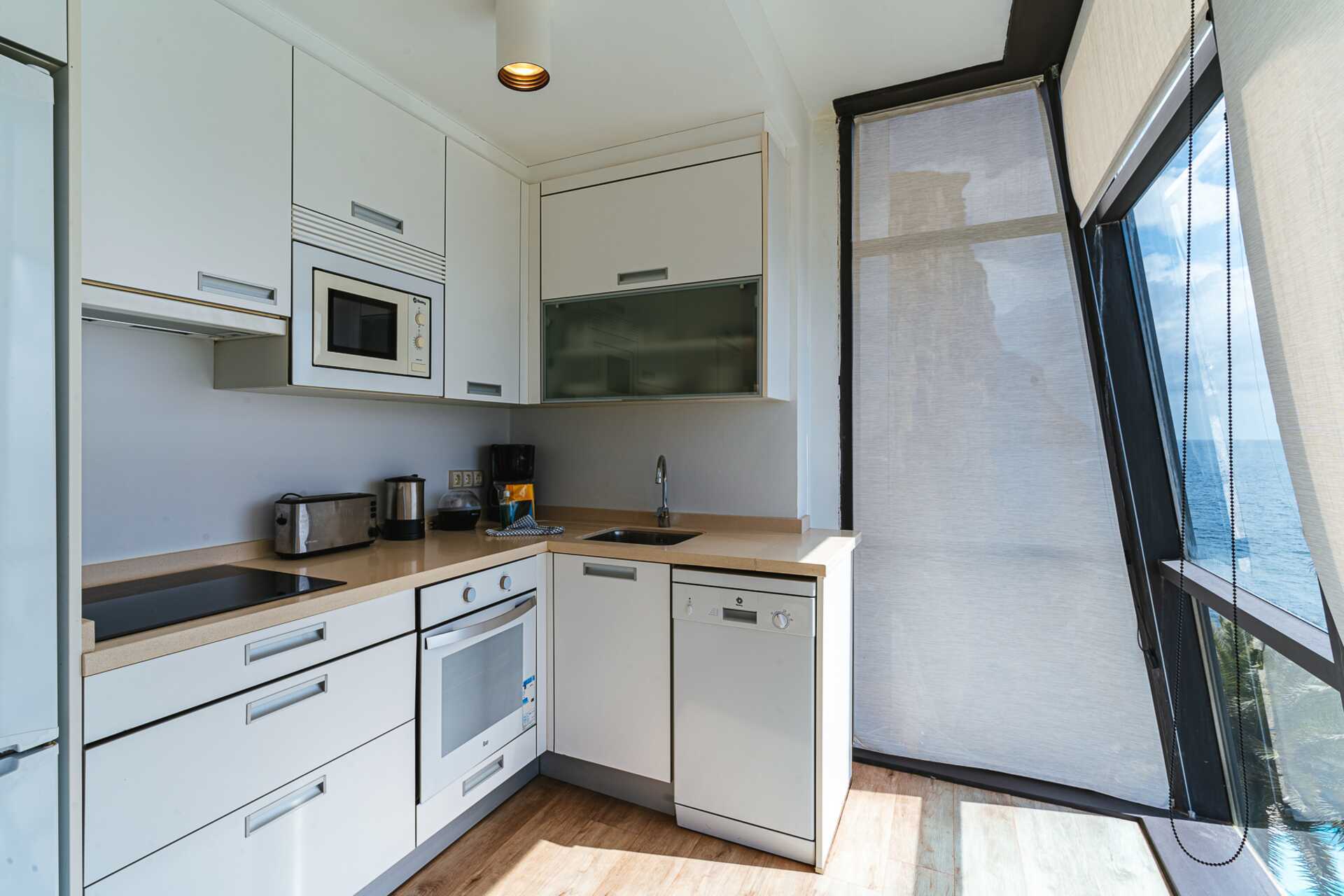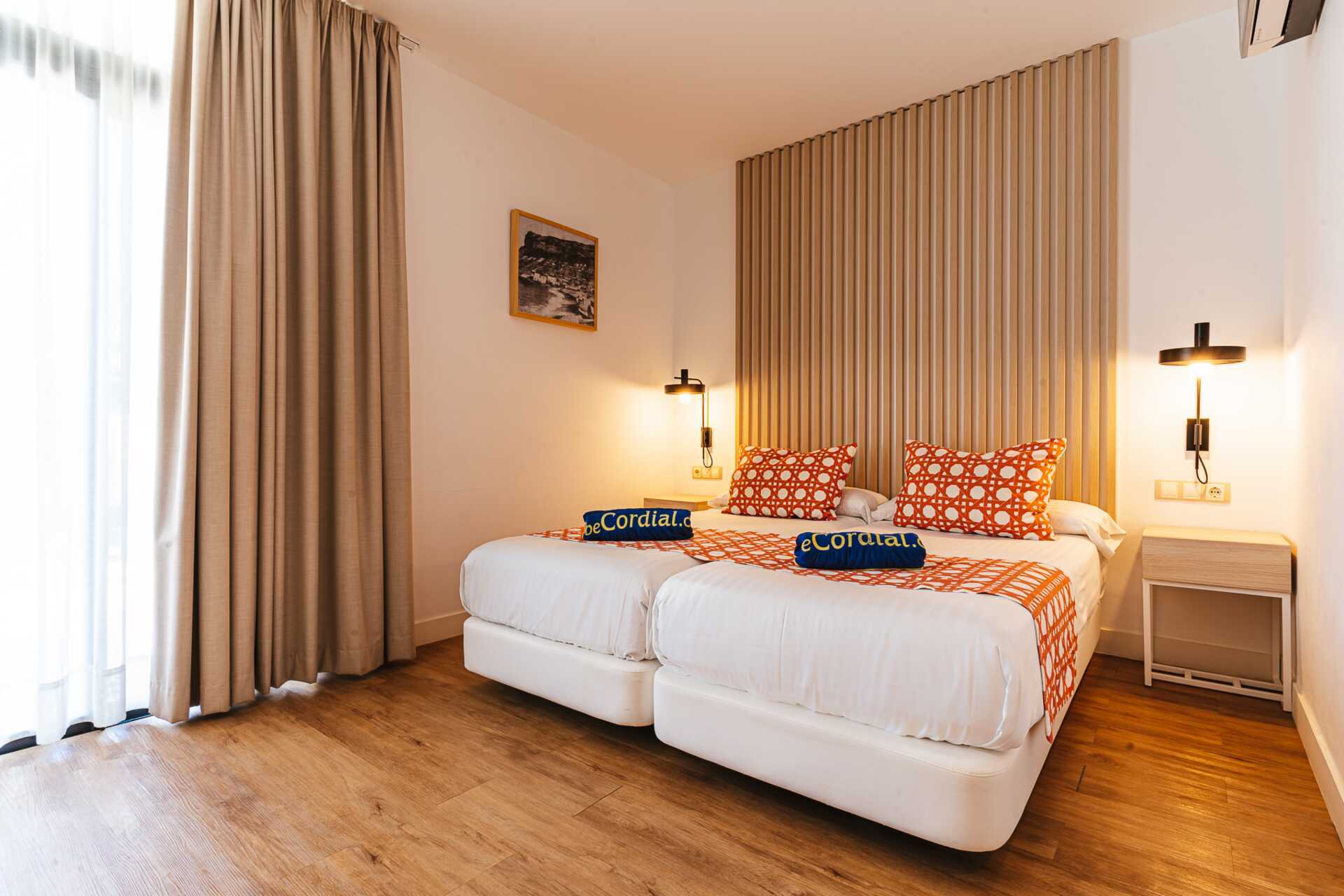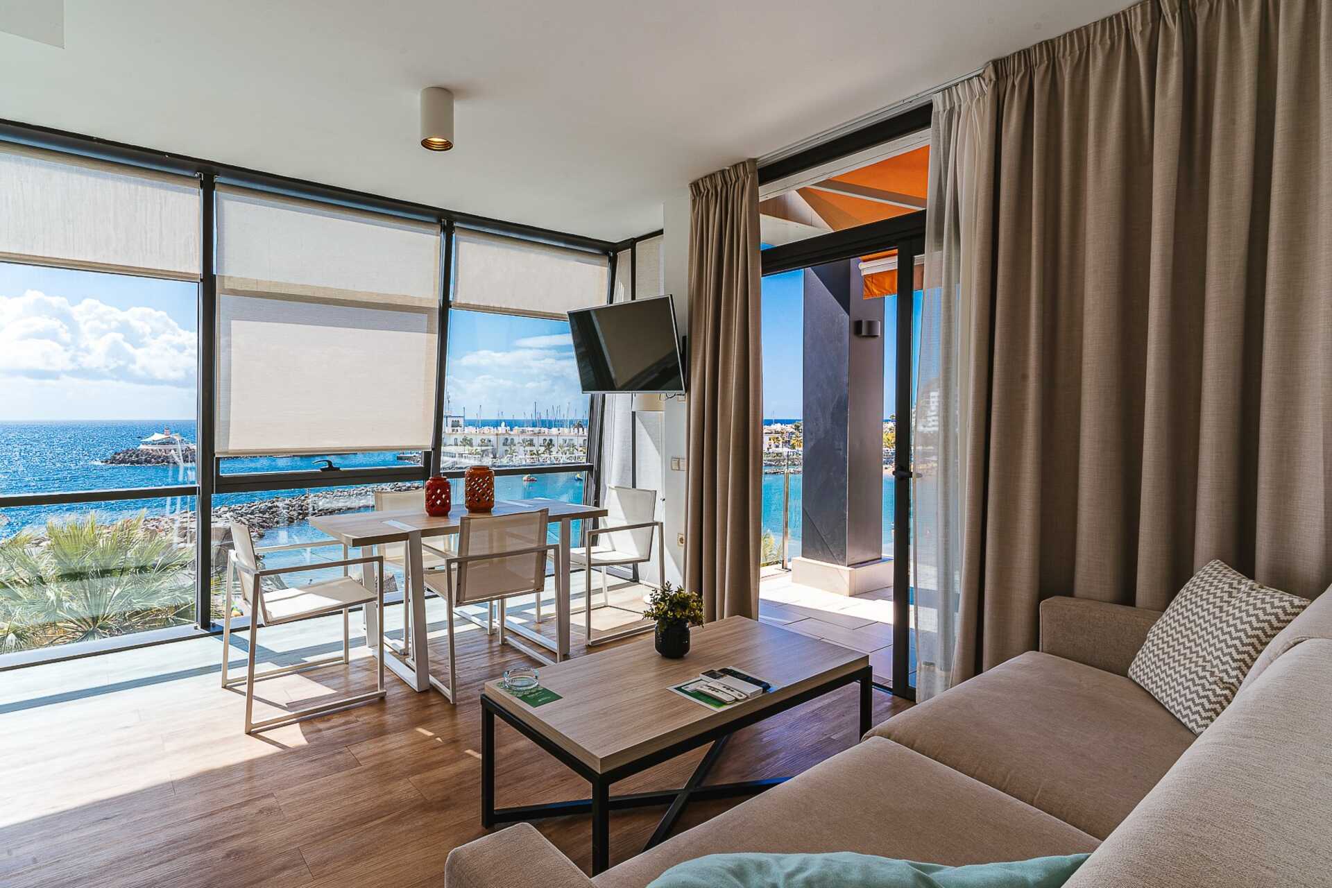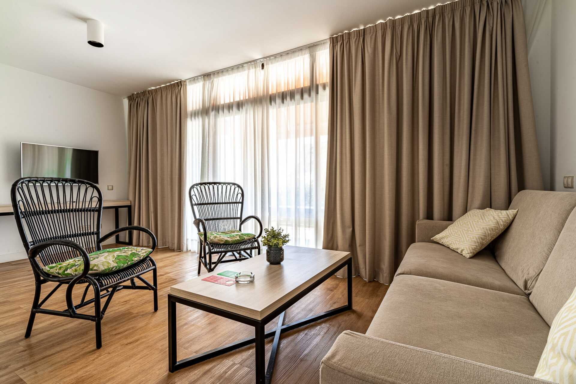 Tweekamerappartement met balkon, sommige met zeezicht en sommige met beperkt zeezicht. De appartementen hebben verschillende plattegronden. Slaapkamer en gecombineerde woonkamer met minikeuken. Twee eenpersoonsbedden of een tweepersoonsbed. Mogelijkheid voor extra bedden in slaapbank. Minikeuken met koelkast, vriezer, kookplaat, oven, broodrooster, koffiezetapparaat, waterkoker, magnetron, vaatwasser en basiskeukengerei. Wifi, kluisje en airconditioning zijn inbegrepen. Een tv met internationale zenders in elke kamer. Sommige appartementen hebben een keukentafel met stoelen, andere een bar met kinderstoelen. Wasmachine, wasdroger, strijkijzer en strijkplank. Föhn. Badkamer met douche en toilet. Schoonmaak 5 keer/week.