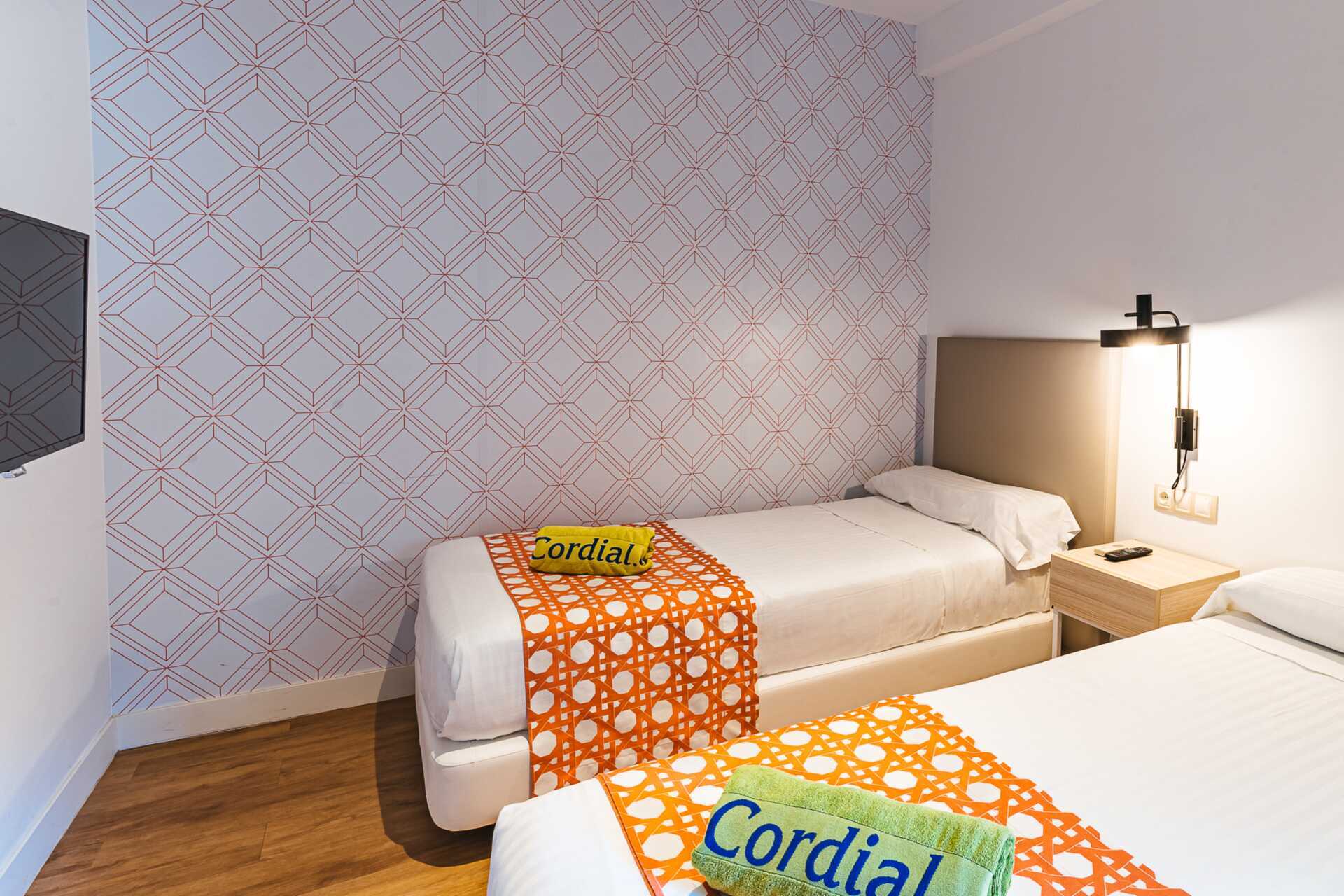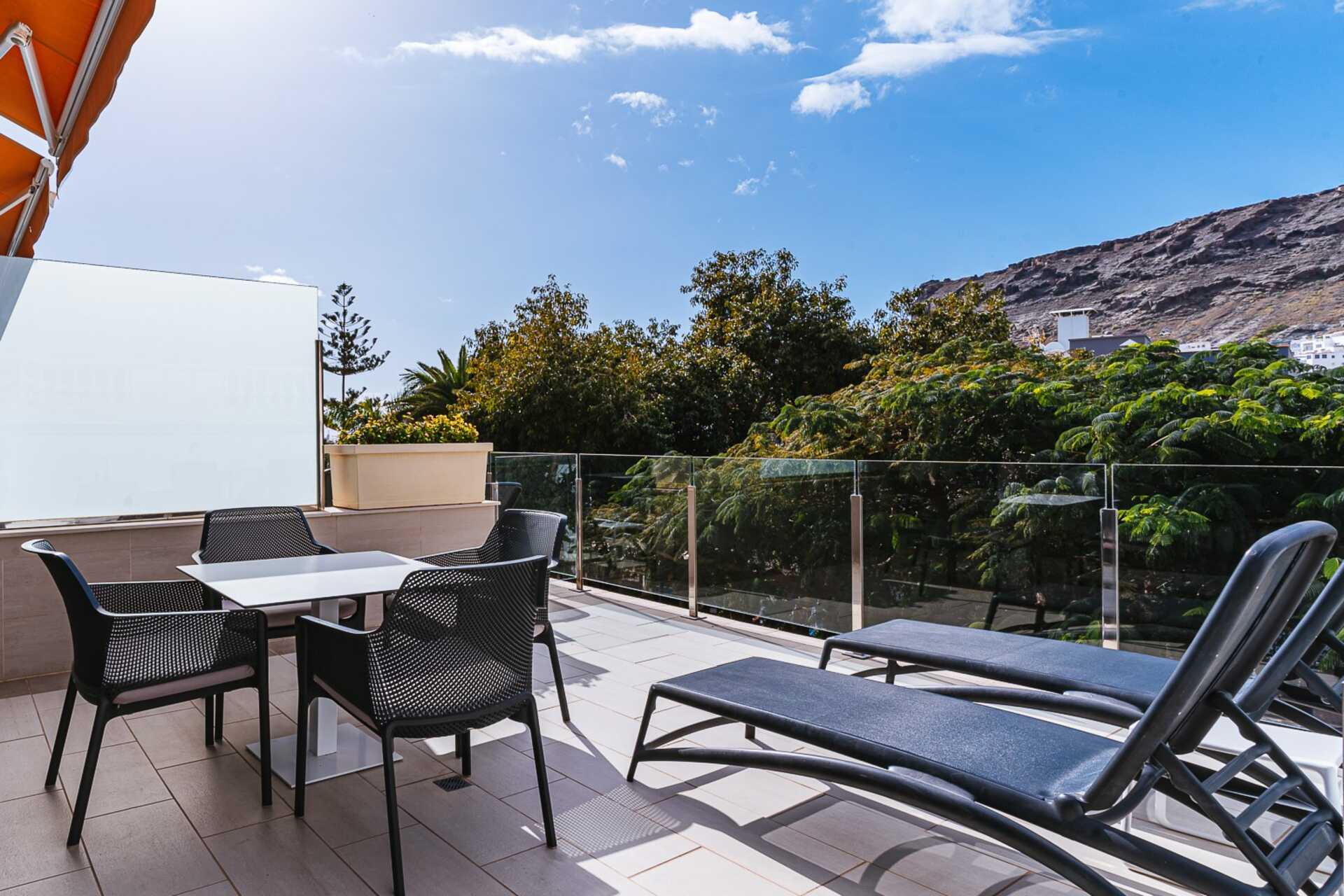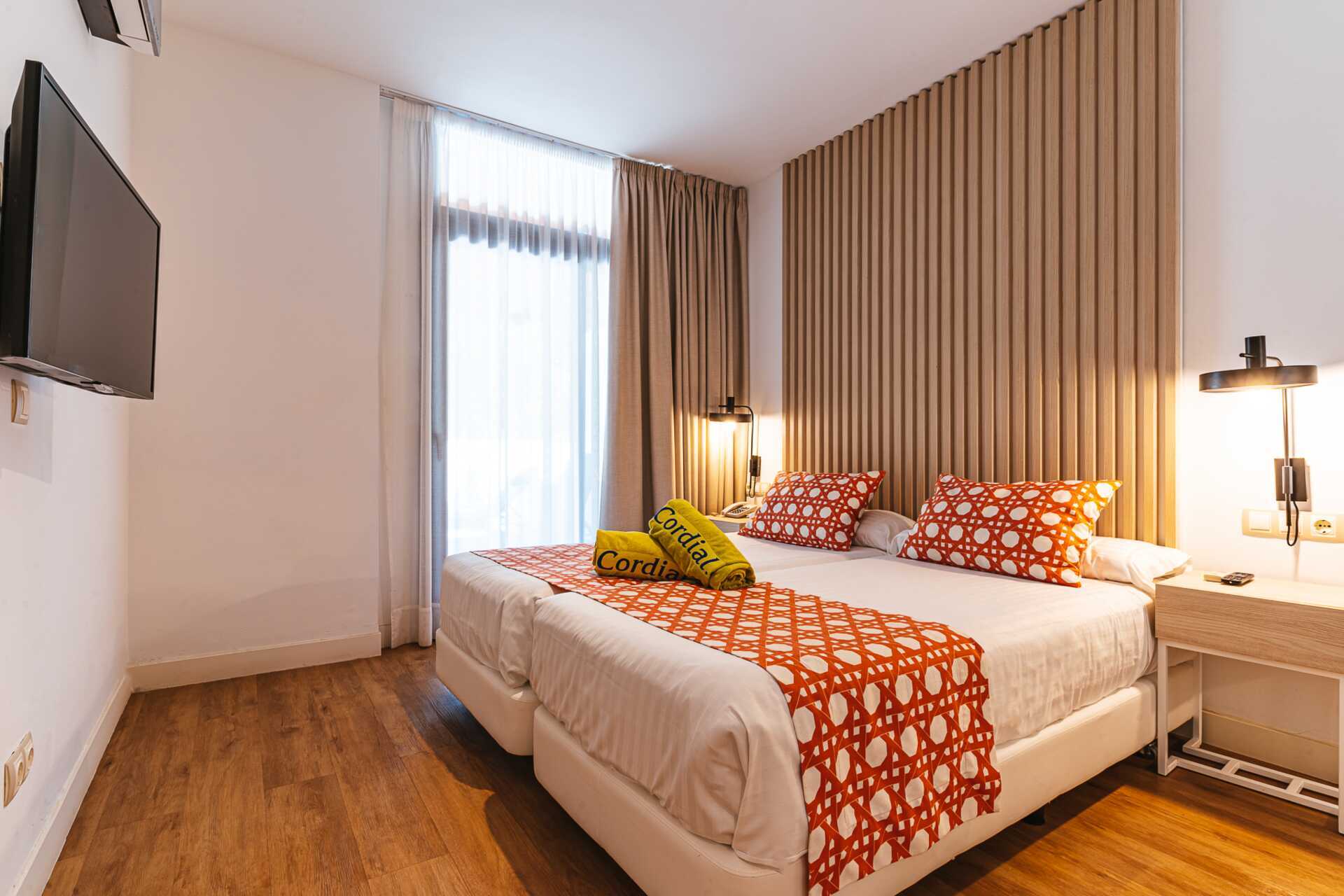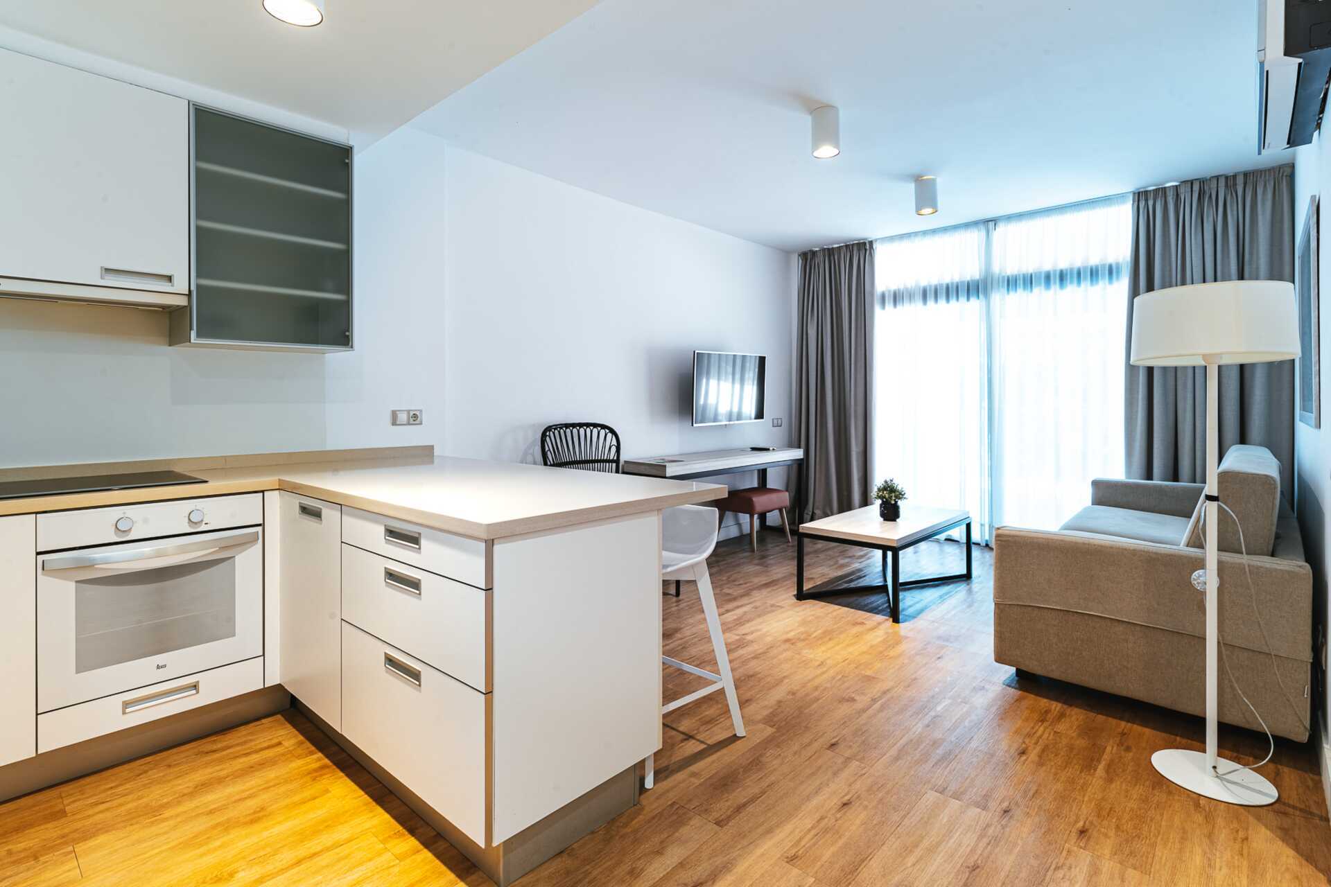 Tweekamerappartement met balkon, sommige met zeezicht en sommige met beperkt zeezicht. De appartementen hebben verschillende plattegronden. Slaapkamer en gecombineerde woonkamer met minikeuken. Twee eenpersoonsbedden of een tweepersoonsbed. Mogelijkheid voor extra bedden in slaapbank. Minikeuken met koelkast, vriezer, kookplaat, oven, broodrooster, koffiezetapparaat, waterkoker, magnetron, vaatwasser en basiskeukengerei. Wifi, kluisje en airconditioning zijn inbegrepen. Een tv met internationale zenders in elke kamer. Sommige appartementen hebben een keukentafel met stoelen, andere een bar met kinderstoelen. Wasmachine, wasdroger, strijkijzer en strijkplank. Föhn. Badkamer met douche en toilet. Schoonmaak 5 keer/week.