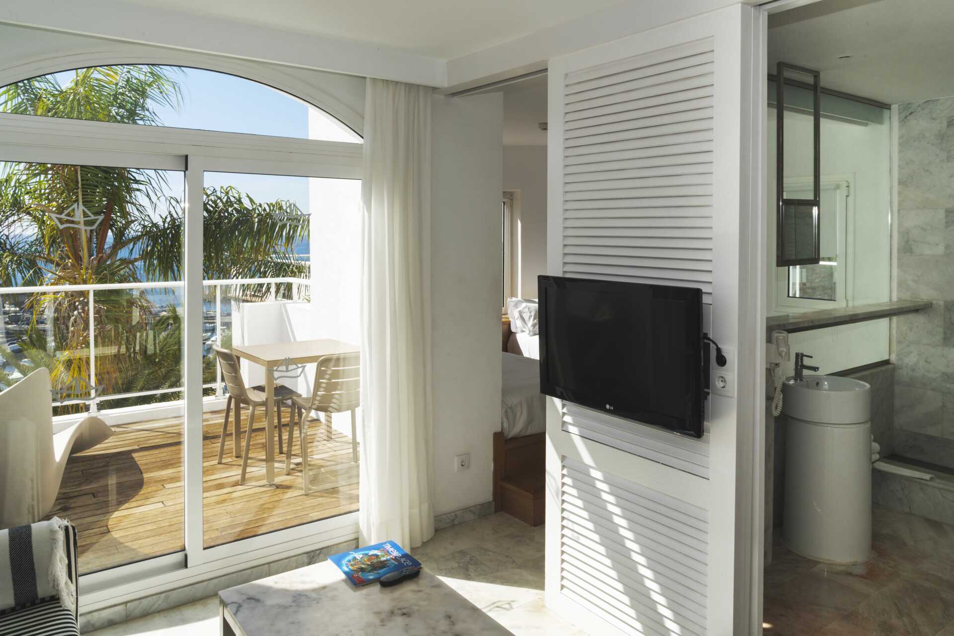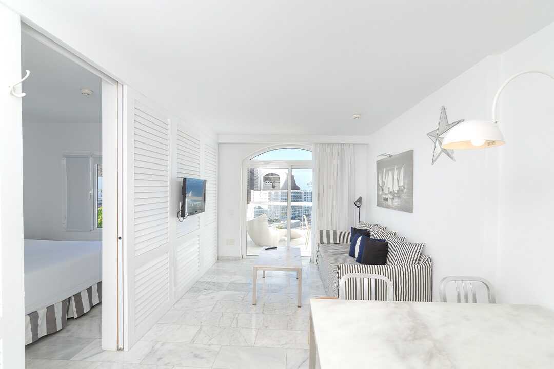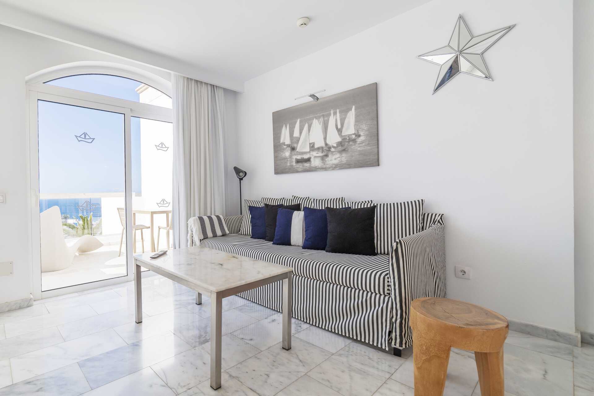 Tweekamerappartement deluxe met balkon of terras en beperkt zeezicht. Sommige appartementen hebben meerdere verdiepingen. Ligbedden op het terras en een rustige, zonnige locatie, het beste deel van het hotel. Slaapkamer en gecombineerde woonkamer met kitchenette. Twee eenpersoonsbedden. Mogelijkheid voor extra bedden in slaapbank. Minikeuken met kookplaten, koelkast met vriesvak, magnetron, koffiezetapparaat, waterkoker, broodrooster en eenvoudige keukenapparatuur. Wifi en airconditioning inbegrepen. Kluis tegen betaling. TV met internationale zenders. Kamerjas en slippers Föhn. Badkamer met douche en wc. Schoonmaak 5 keer/week.
