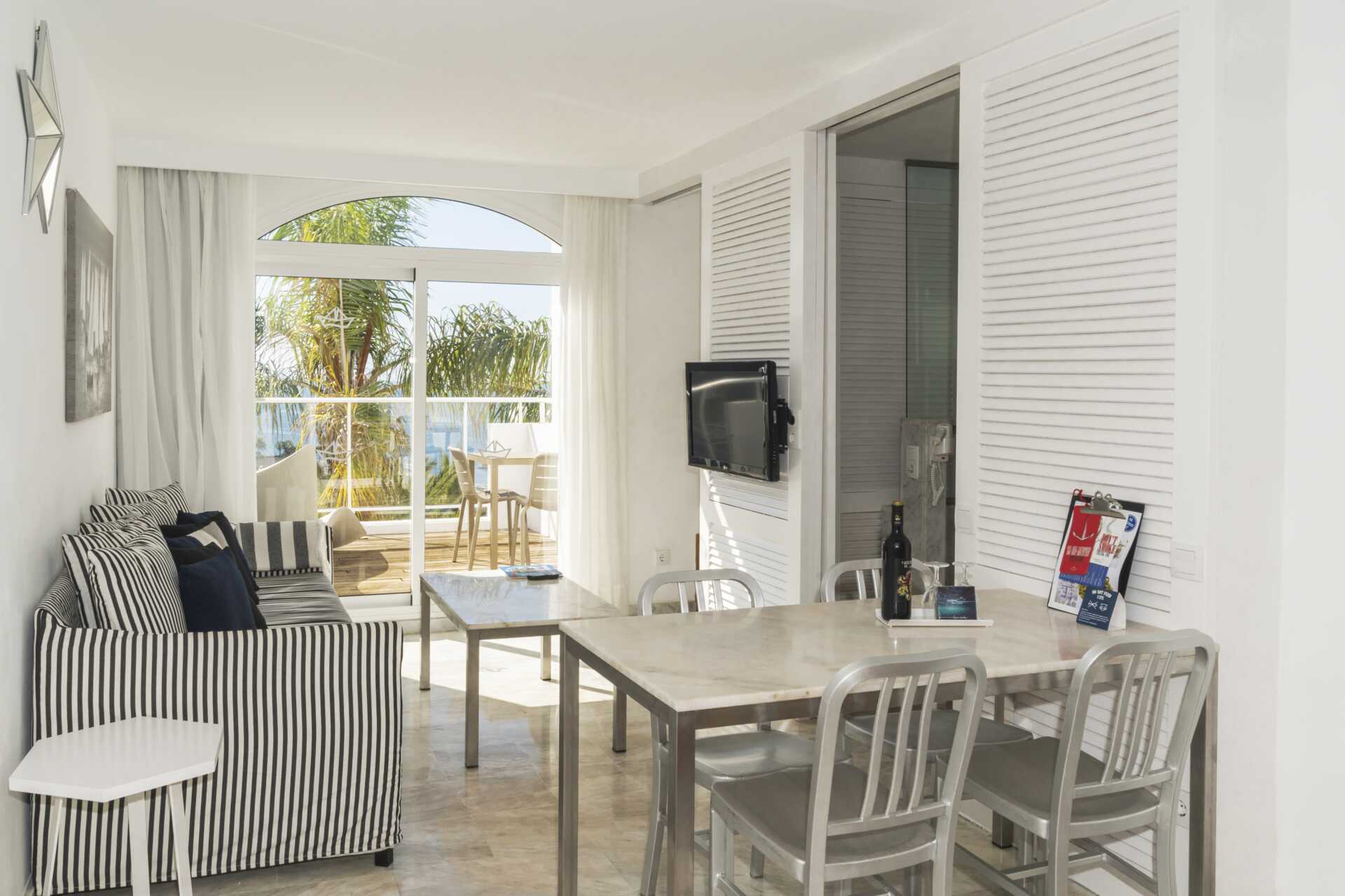 Tweekamerappartement superior met balkon of terras en beperkt zeezicht. De appartementen zijn rustig gelegen. Sommige appartementen hebben meerdere verdiepingen. Slaapkamer en gecombineerde woonkamer met kitchenette. Twee eenpersoonsbedden. Mogelijkheid voor extra bedden in slaapbank. Minikeuken met koelkast en vriezer, kookplaten, magnetron, koffiezetapparaat, broodrooster, waterkoker en eenvoudige keukenapparatuur. Wifi en airconditioning inbegrepen. Kluis tegen betaling. TV met internationale zenders. Föhn. Badkamer met douche en wc. Schoonmaak 5 keer/week.