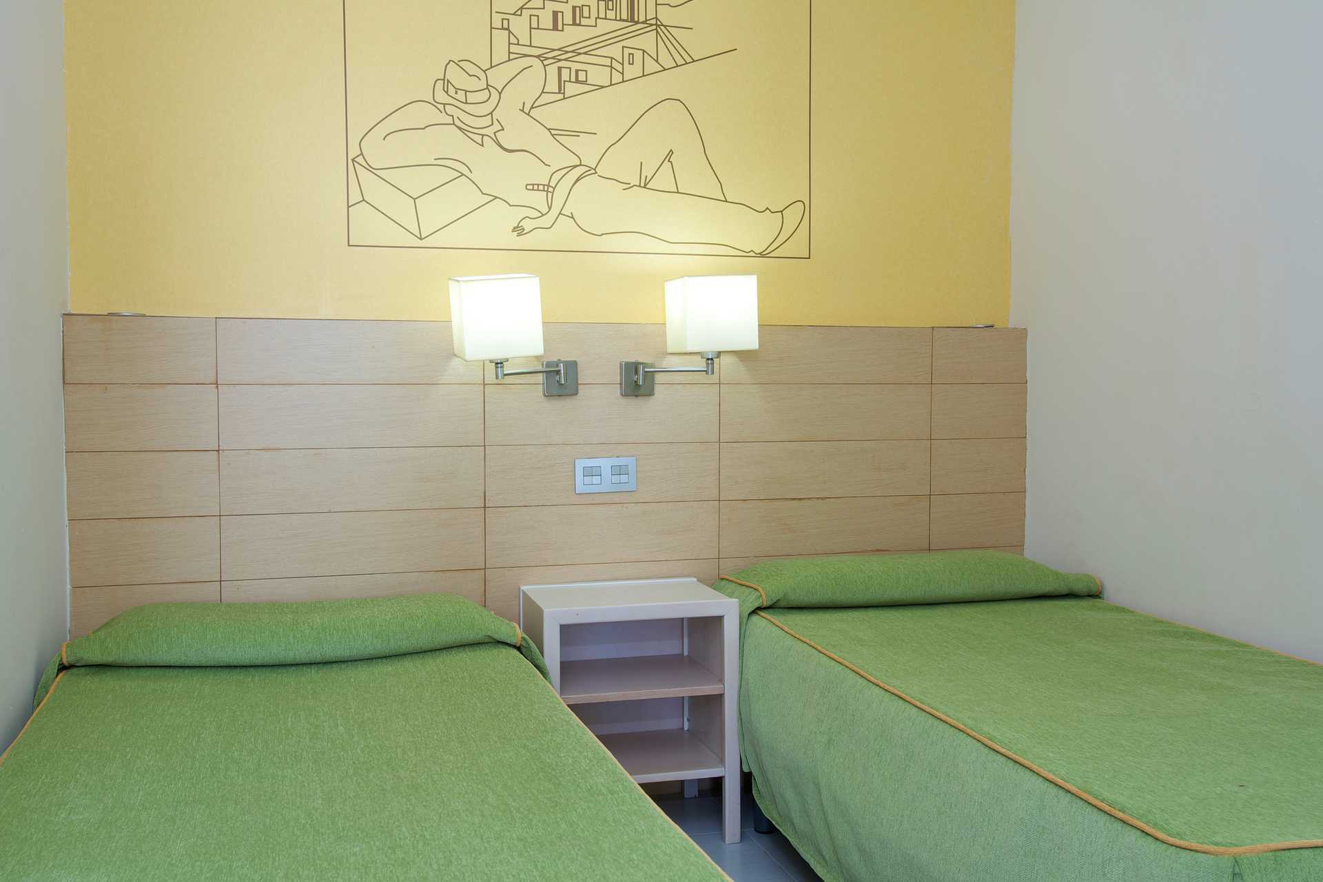 Driekamerappartement met balkon of terras en uitzicht op zee. Twee slaapkamers en een gecombineerde woonkamer met minikeuken. Sommige appartementen zijn versleten. Twee eenpersoonsbedden in elke slaapkamer. Mogelijkheid voor een extra bed op de slaapbank. Minikeuken met kookplaten, koelkast, magnetron, broodrooster, waterkoker en basiskeukengerei. Wifi en kluisje inbegrepen. Ventilator. Televisie met internationale zenders, sommige tegen betaling. Föhn. Badkamer met douche en toilet. Schoonmaak 5 keer/week.