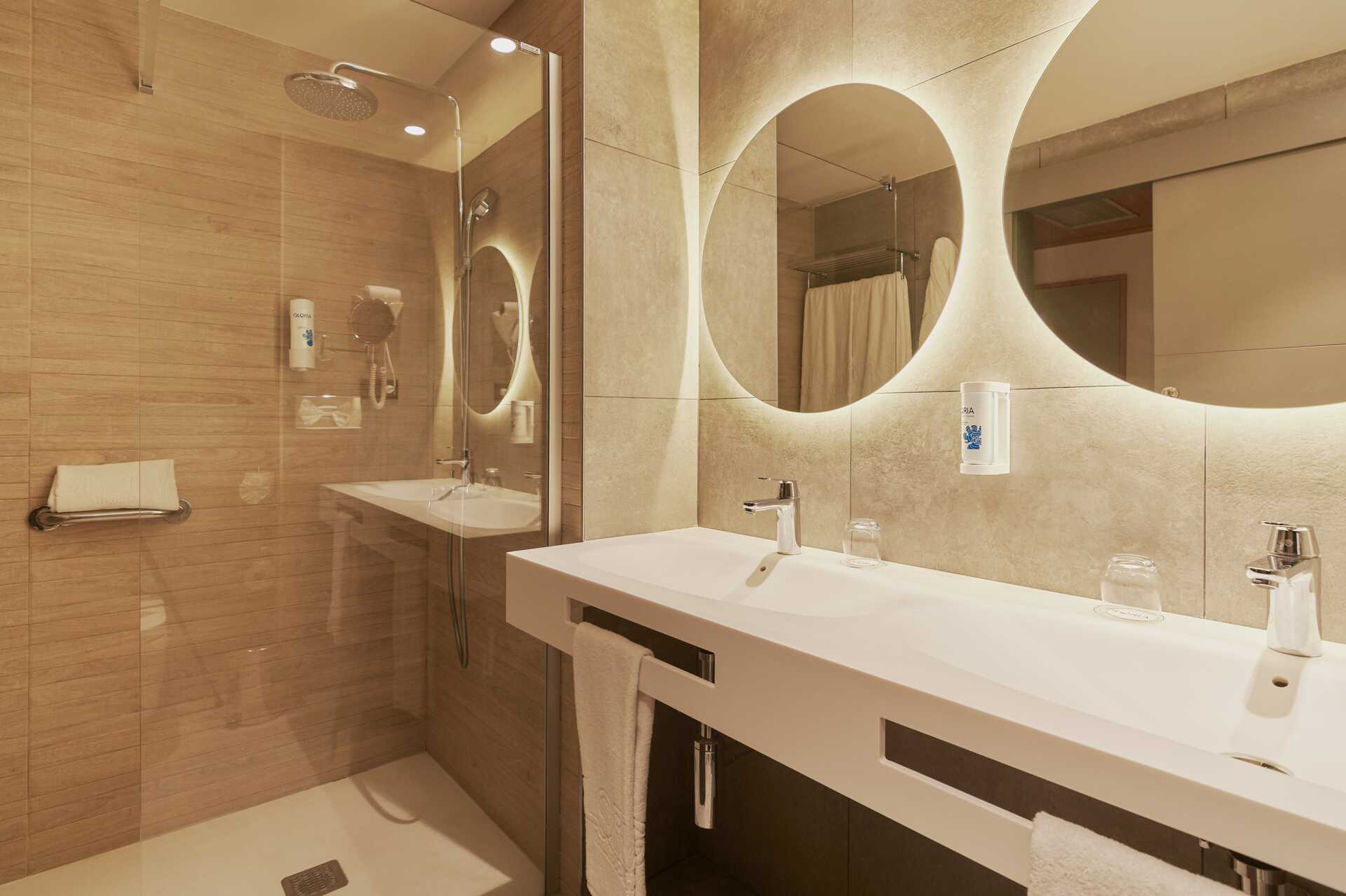 Familiekamer met balkon of terras. De familiekamers bevinden zich vlak bij de zwembaden en bestaan uit twee slaapkamers, één met een tweepersoonsbed en één met twee eenpersoonsbedden. Mogelijkheid voor een extra bed op de slaapbank. Wifi en airconditioning inbegrepen. Kluisje tegen betaling. Koelkast. Waterkoker en koffie en thee. Tv met internationale zenders. Föhn. Badkamer met douche en toilet. Schoonmaak 7 keer/week.