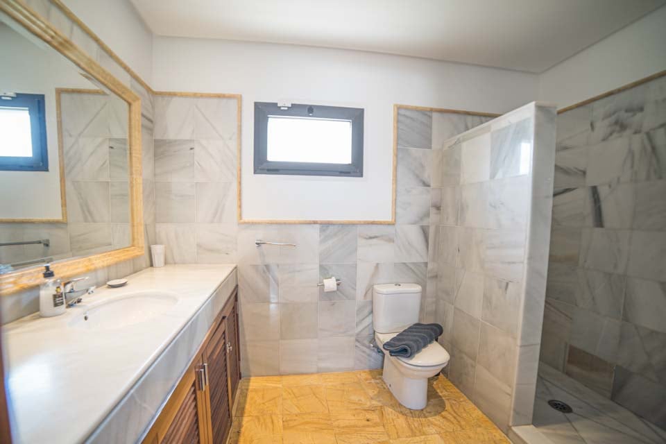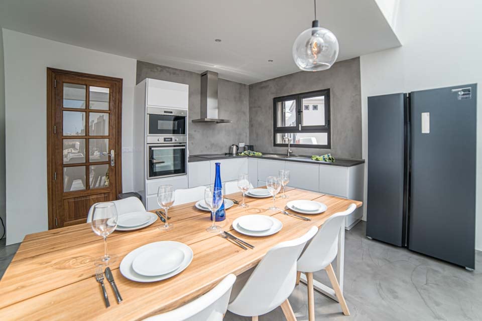 We zijn onder de indruk van de opvallende moderne architectuur, gecombineerd met Spaanse elementen, die schitteren in de zon. De gehele villa heeft een eigentijdse en elegante stijl, en alle meubels zijn zorgvuldig uitgekozen om een serene, luxe ambiance te creëren. De open leefruimte is gezellig en knus, met een chique zithoek die perfect aansluit bij de strak afgewerkte keuken. De gehele ruimte is omgeven door grote glazen ramen en biedt een weids uitzicht op de kust. Met drie ruime slaapkamers, waarvan één een familiekamer is met twee tweepersoonsbedden, is dit de ultieme droomvakantie voor een klein gezin.