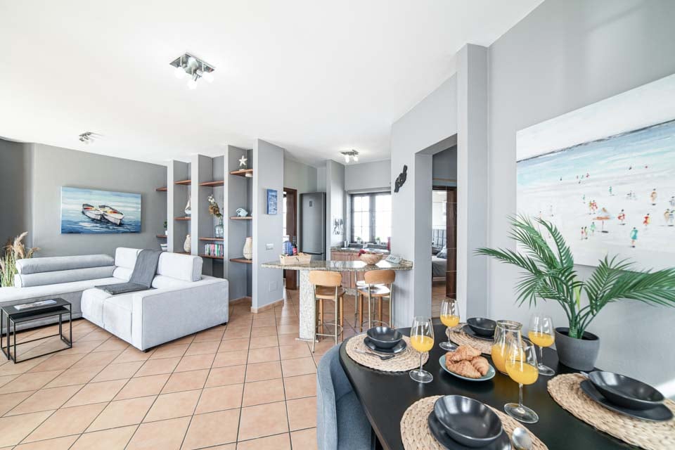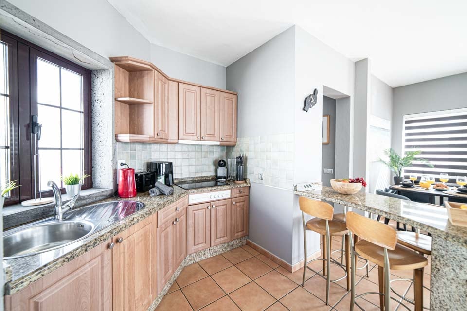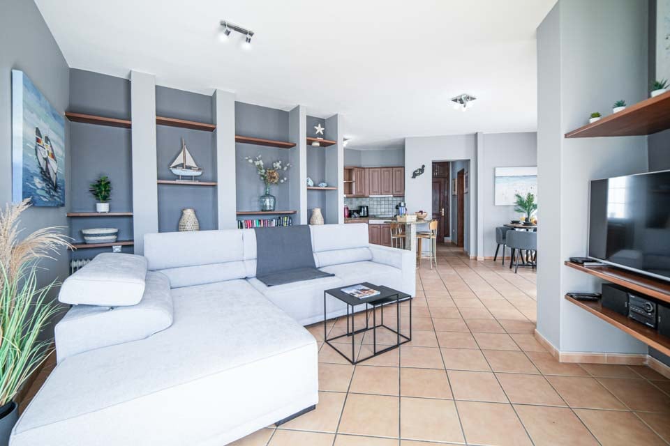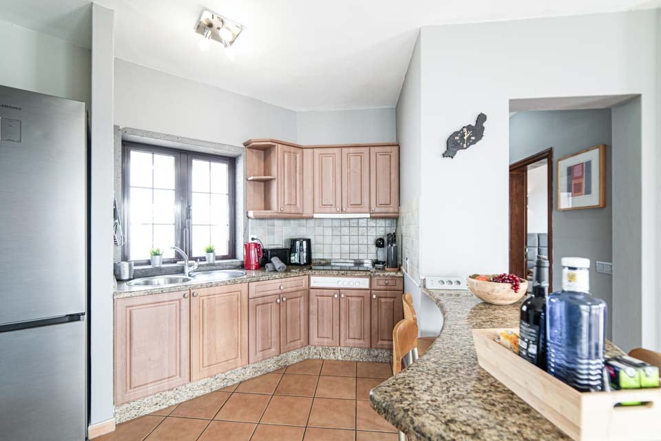 Comfortabele zithoek, smart-tv, oven, kookplaat, magnetron, vriezer, koelkast, koel-vriescombinatie, vaatwasser, wasmachine, eetgelegenheid, deuren naar terras