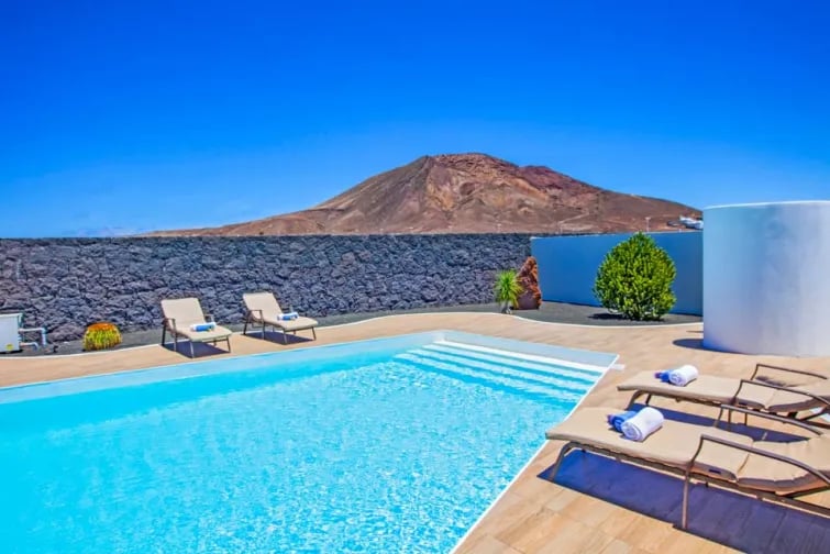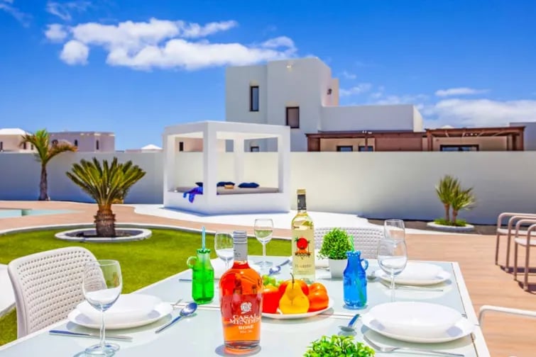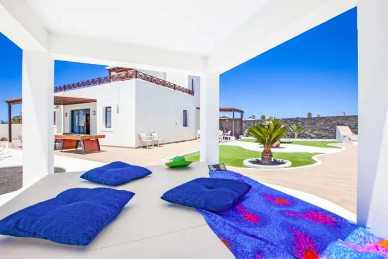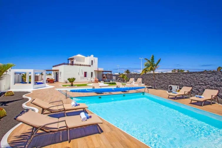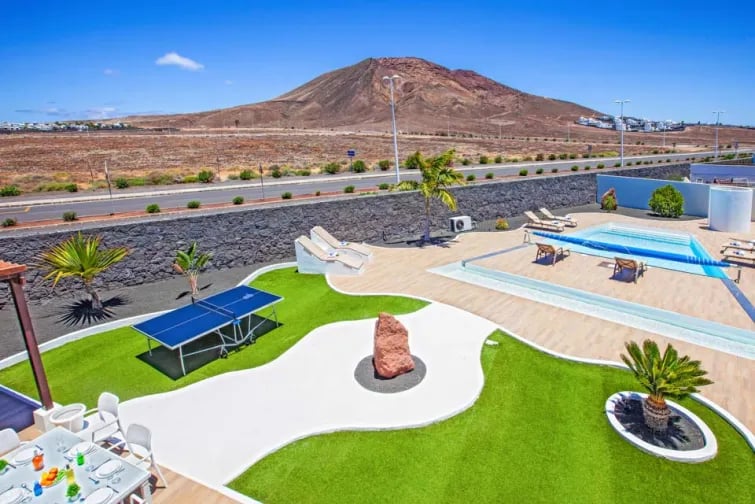 Villa Esmeralda is een van de drie schitterende nieuwe villa's die aan de collectie van Solmar Villas in de urbanisatie Las Maretas worden toegevoegd. Het is een schitterend vrijstaand huis op een groot perceel met een fantastisch zwembad met vloeiende vormen. De begane grond is verdeeld over twee verdiepingen en bestaat uit een open woonkamer, een volledig uitgeruste keuken, een tweepersoonsslaapkamer met een eigen badkamer met douche, een tweepersoonsslaapkamer en een slaapkamer met twee eenpersoonsbedden die een tweede badkamer met douche deelt. De hoofdslaapkamer bevindt zich op de eerste verdieping en heeft een eigen douche en suite en een eigen terras. Voor uw comfort zijn alle slaapkamers voorzien van airconditioning en in de hele villa is WiFi beschikbaar. Buiten zult u de meeste tijd doorbrengen, op een ruim, omheind terrein met een dagbed, een aantal vaste ligstoelen en nog meer ligstoelen verspreid rondom de ster van de show: het adembenemende, vrijgevormde zwembad (verwarming inbegrepen van november tot en met april). De villa beschikt tevens over een pooltafel en een tafeltennistafel, waar vrienden en familie van kunnen genieten. Een stenen barbecue en twee aparte pergola's bieden voldoende schaduw voor wie buiten wil eten, uit de buurt van de Canarische middagzon. Er zijn een aantal bars en restaurants in Faro Park op loopafstand. Ook is er vlakbij een regelmatige busverbinding naar het stadje Playa Blanca.