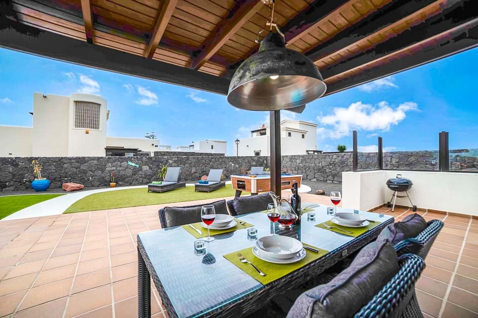 Overdekt terras, dineren in de openlucht, faciliteiten voor dineren in de openlucht, eetfaciliteiten, barbecue, draagbare barbecue, ligstoelen, pooltafel