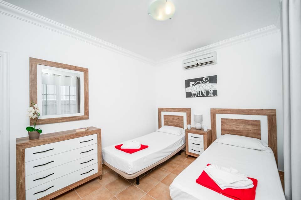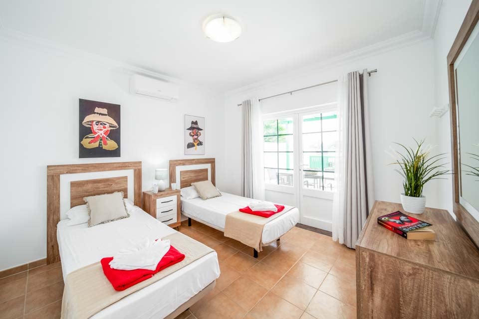 Twee eenpersoonsbedden, airconditioning, deuren naar terras