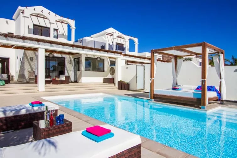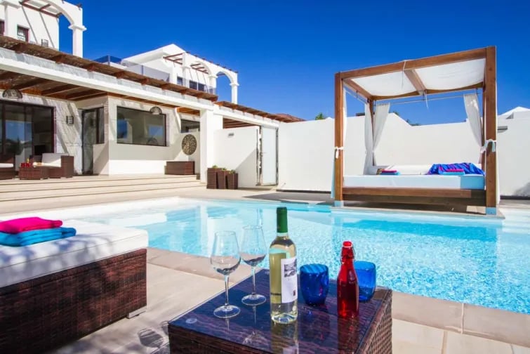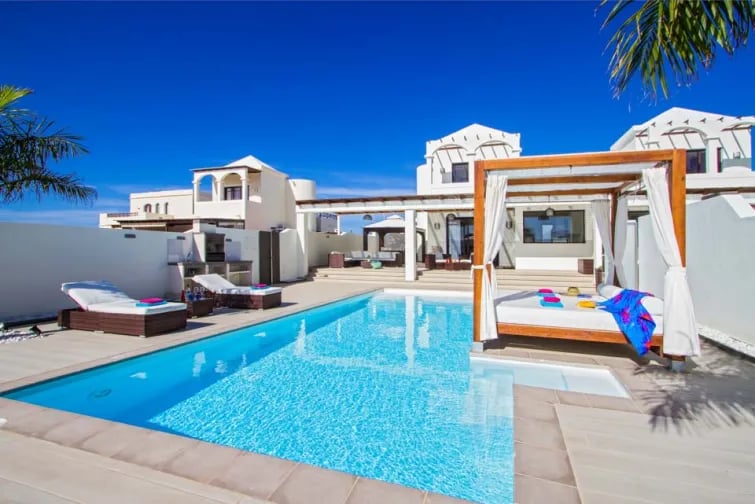Villa Pedro is een prachtige, hoogwaardige villa gelegen ten westen van Playa Blanca in de chique urbanisatie Las Maretas. Deze moderne en goed uitgeruste woning met drie slaapkamers en twee badkamers biedt volop faciliteiten om onze klanten de perfecte villa-ervaring te bieden. Het is verdeeld over twee verdiepingen, met op de begane grond een moderne lounge met uitzicht op het zwembad, diverse Britse zenders, een spelcomputer en eetgelegenheid voor zes personen. Via de hal komt u in de moderne keuken die van alle gemakken is voorzien, waaronder een vaatwasser. Ook op de begane grond bevinden zich een slaapkamer met twee eenpersoonsbedden en een ruime badkamer met douche. Boven bevinden zich nog een slaapkamer met twee eenpersoonsbedden, een hoofdslaapkamer en een aparte familiebadkamer. Beide slaapkamers op de bovenverdieping hebben toegang tot het terras met een prachtig uitzicht op zee en de eilanden Los Lobos en Fuerteventura. De leefruimte buiten is fantastisch. In het midden van het terrein ligt uw eigen zwembad met vrije vorm (verwarming inbegrepen van november tot en met april) dat u via een trap kunt bereiken. Er is een dagbed geplaatst vlak bij het zwembad voor degenen die willen ontspannen en de Canarische zon willen ontvluchten. Er is een stenen barbecue en spoelbak beschikbaar, zodat onze gasten buiten kunnen eten wanneer het hen uitkomt. Aan de villa grenst een grote pergola die gasten volop schaduw biedt. Ook zijn er comfortabele rotan zitplaatsen en extra eetgelegenheden. Onze gasten kunnen tevens gebruikmaken van een tafeltennistafel en een pooltafel.