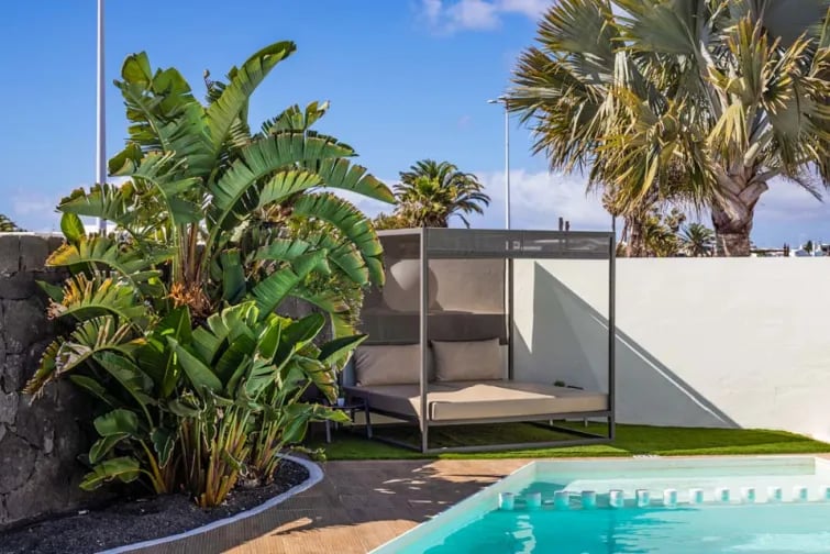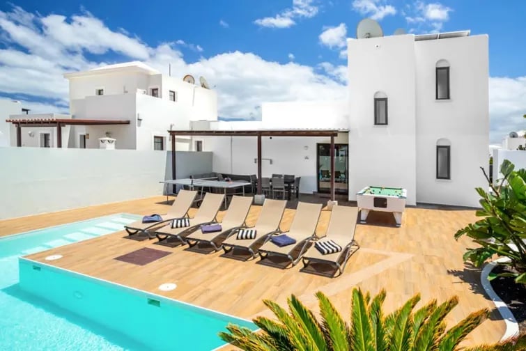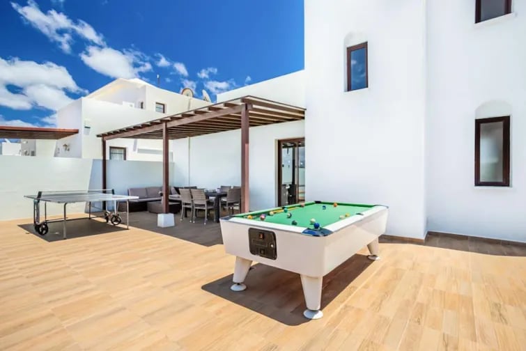 Via de openslaande deuren vanuit de woonkamer komt u in uw buitenruimte. Er staan twee ligstoelen in de hoek van het perceel en de ligstoelen zijn perfect geplaatst rondom uw eigen zwembad met vrije vorm (verwarming inbegrepen van november tot en met april). Het zwembad heeft een apart, ondieper gedeelte, gescheiden door kolommen. Aan de zijkant van de villa is een pergola geplaatst die voor extra schaduw zorgt als u de Canarische zon wilt ontvluchten. De villa is tevens uitgerust met een pooltafel en een tafeltennistafel, zodat u met familie en vrienden de hele vakantie door kunt genieten.