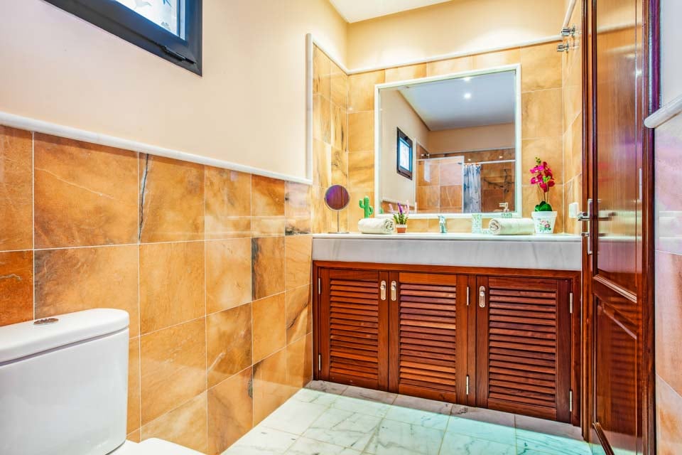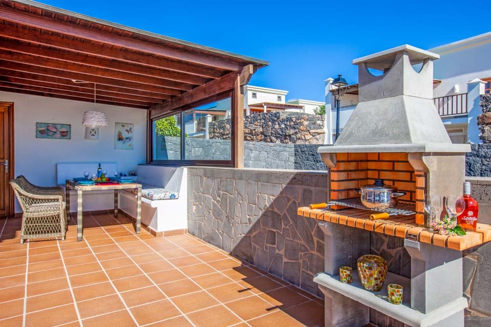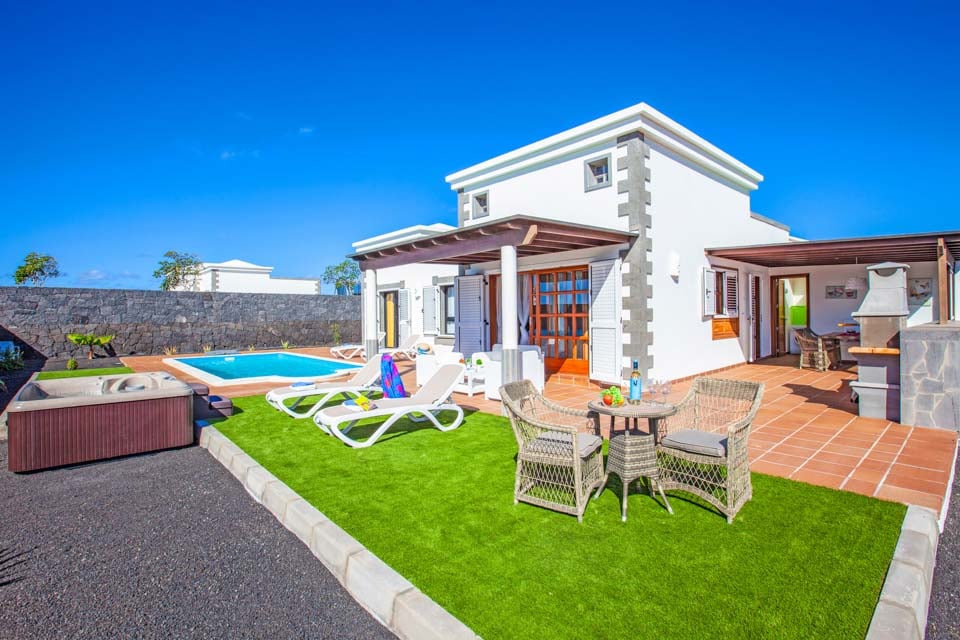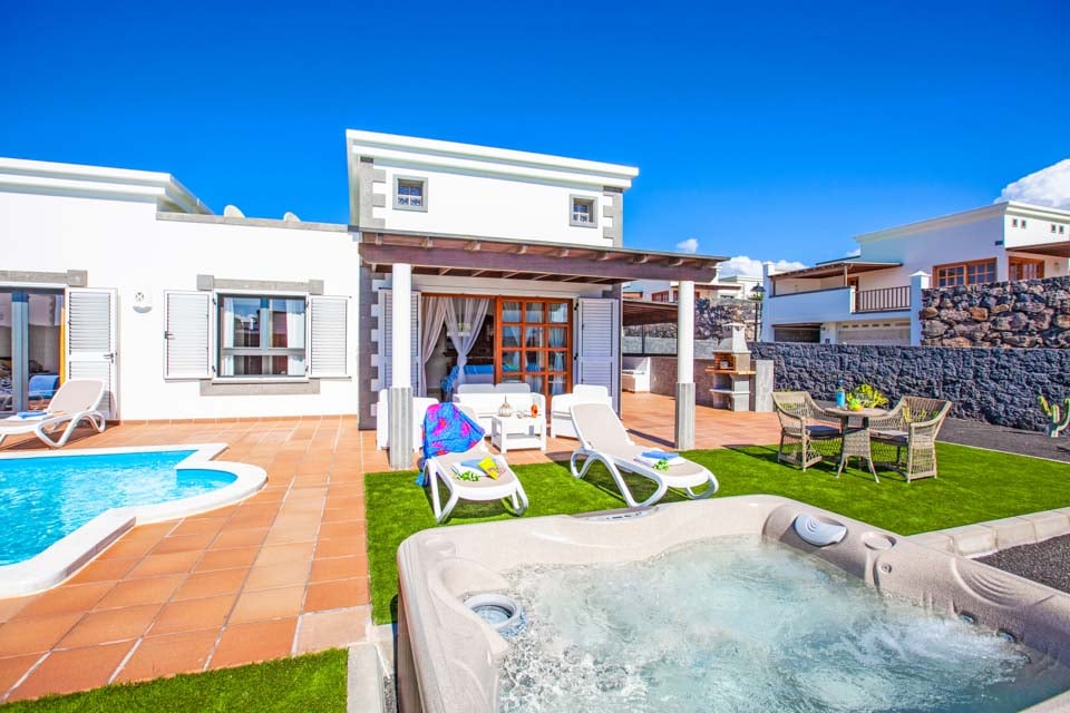 Buiten vindt u een zwembad dat groter is dan normaal en waar u de hele dag kunt genieten van de heerlijke Spaanse zon (badhanddoeken zijn inbegrepen). Bovendien beschikt deze villa over de extra luxe van een ontspannende hot tub.* Bent u niet zo'n waterrat, dan kunt u ook lekker ontspannen op de ligstoelen en op het zachte grasveld. De villa beschikt tevens over een stenen barbecue: een geweldige manier om 's avonds te koken terwijl u de zon ziet ondergaan.